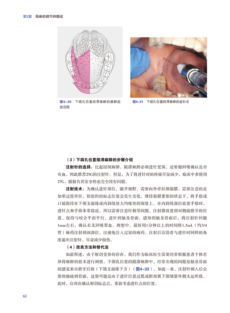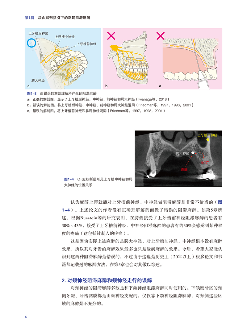 本书主要讲解麻醉的历史、历史上对麻醉的误解,彻底理解麻醉所必须的下颌面部正常解剖知识,局部麻醉的技巧和证据。对下颌麻醉、上颌麻醉、下颌辅助麻醉、麻醉无法奏效的原因、全身疾病与麻醉、局部麻醉引起可能全身的并发症等进行了详细的讲解,本书参考结合了大量的文献,并精心制作了非常多的插画,以便读者理解。全书分为3篇9章,并为读者准备了减轻麻醉疼痛的方法等10个小技巧,内容详实、逻辑清晰,一步一步地指导读者如何进行正确有效的麻醉操作,指导性高,在麻醉领域中是不可多得的好书。 。因此,为了读者能构建三维的认知,本书中多数的解剖示意图都和实际人体解剖照片并排放置。了解可能发生的解剖变异类型,在临床实践中有着很大的作用,对麻醉的成功至关重要。