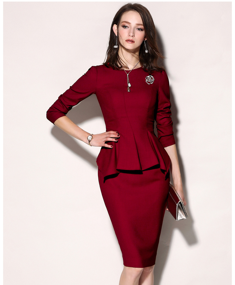 J7381604B颈袖添香新款时尚气质红色羊毛职场装修身包臀连衣裙女J7381604B