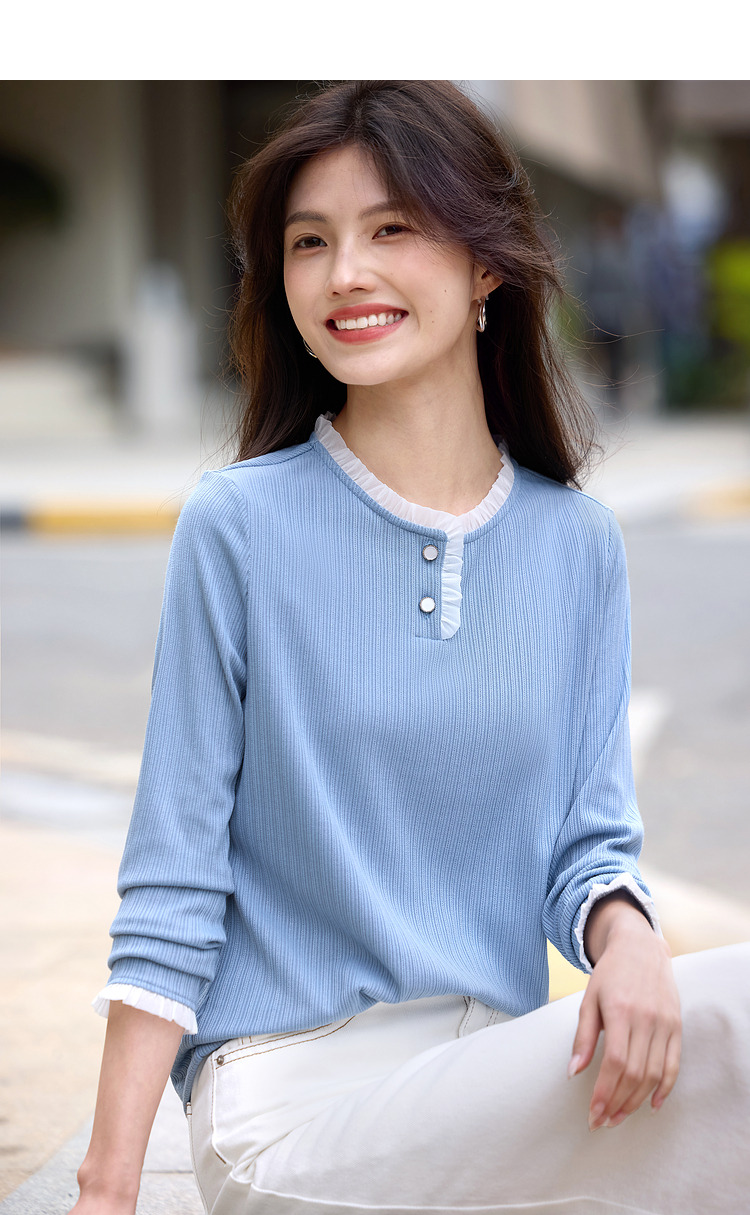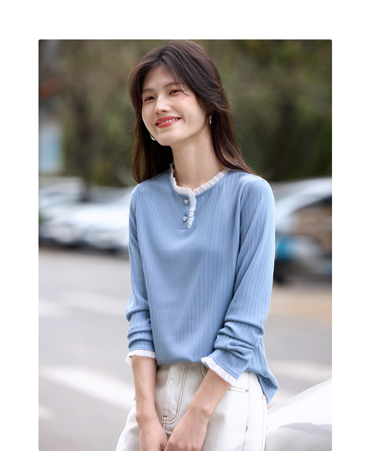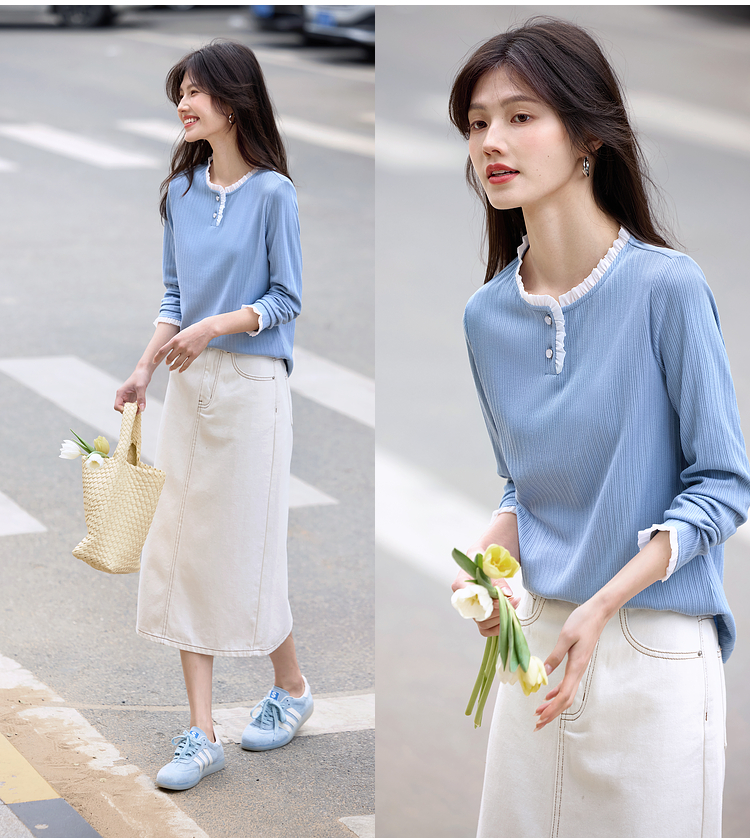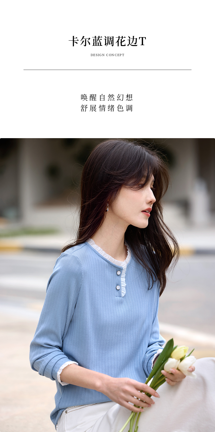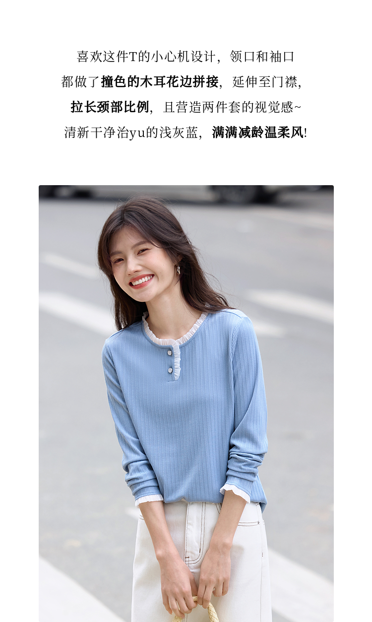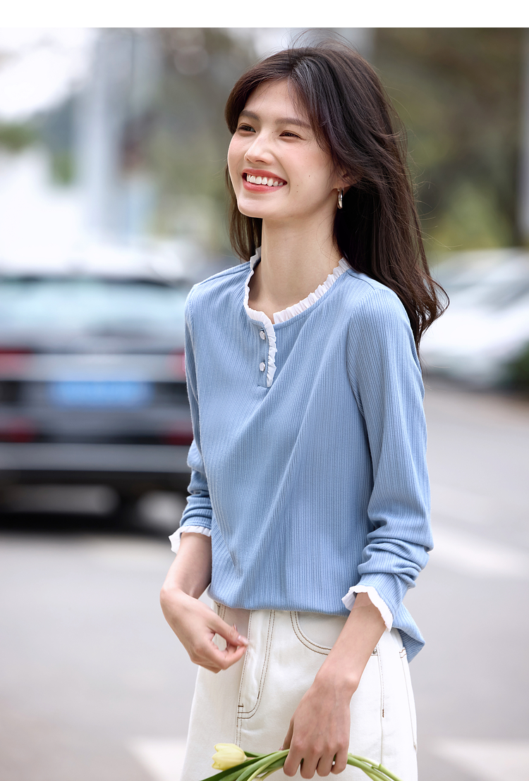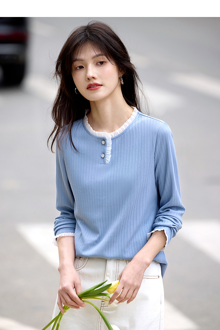 【年终特卖】熙世界蓝色肌理针织T恤女长袖木耳花边圆领别致上衣2025春秋新款