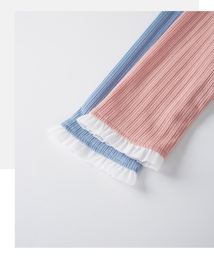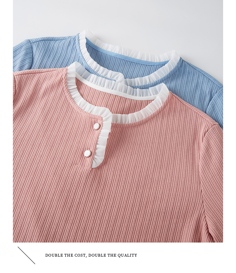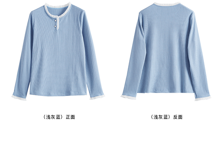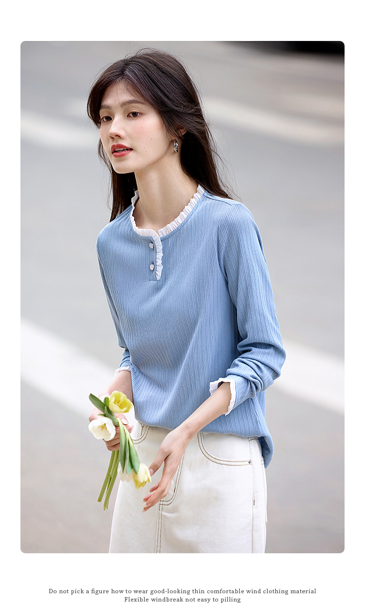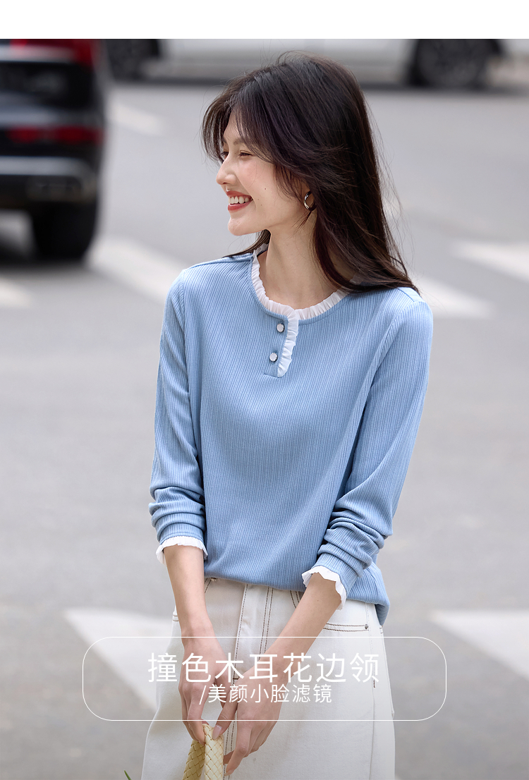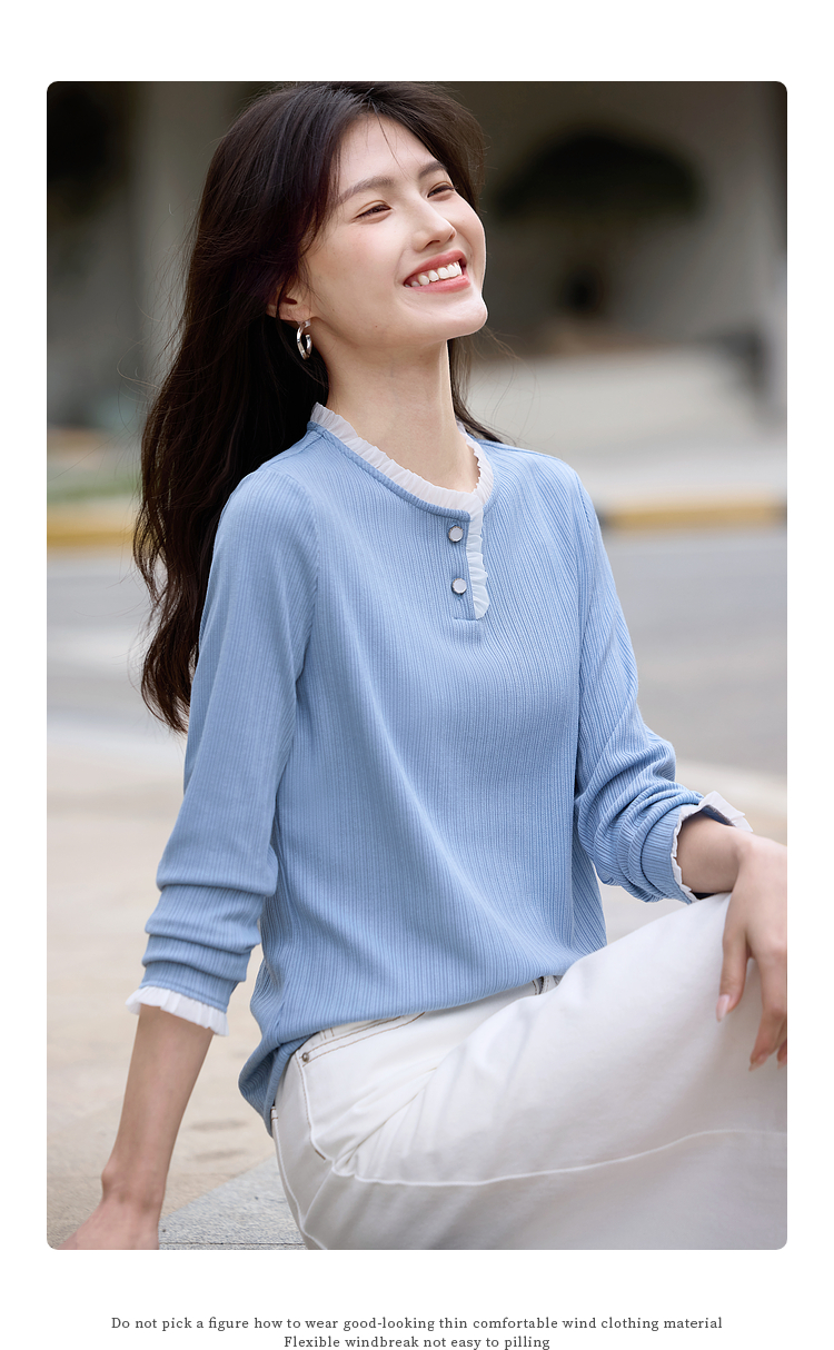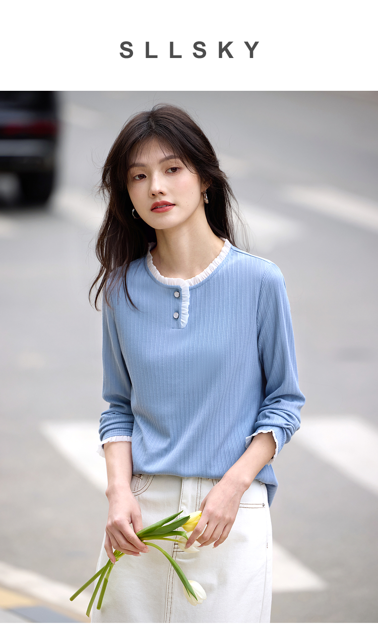 【年终特卖】熙世界蓝色肌理针织T恤女长袖木耳花边圆领别致上衣2025春秋新款