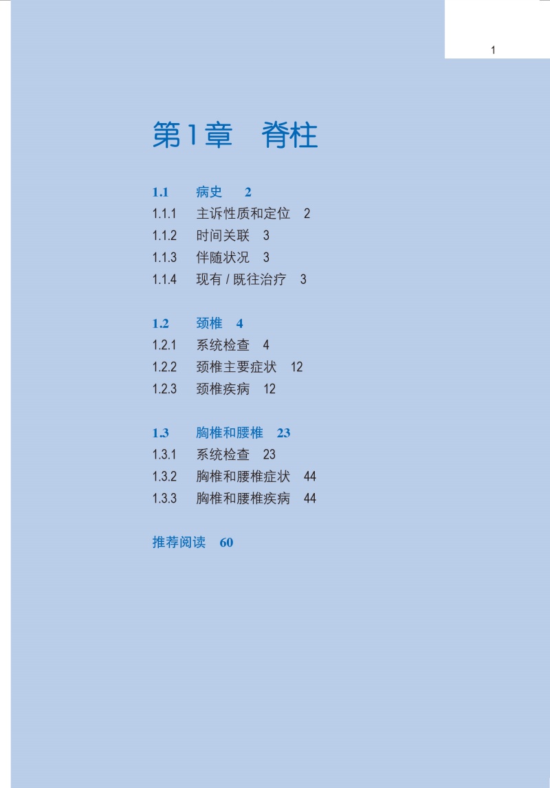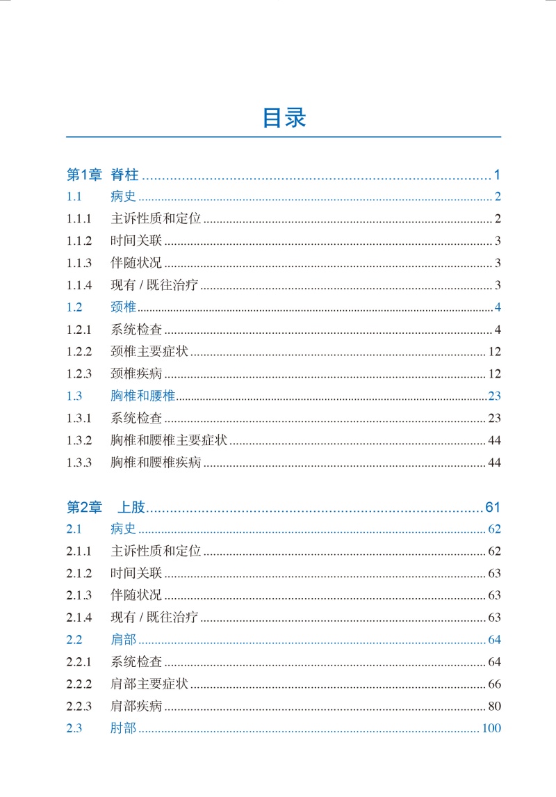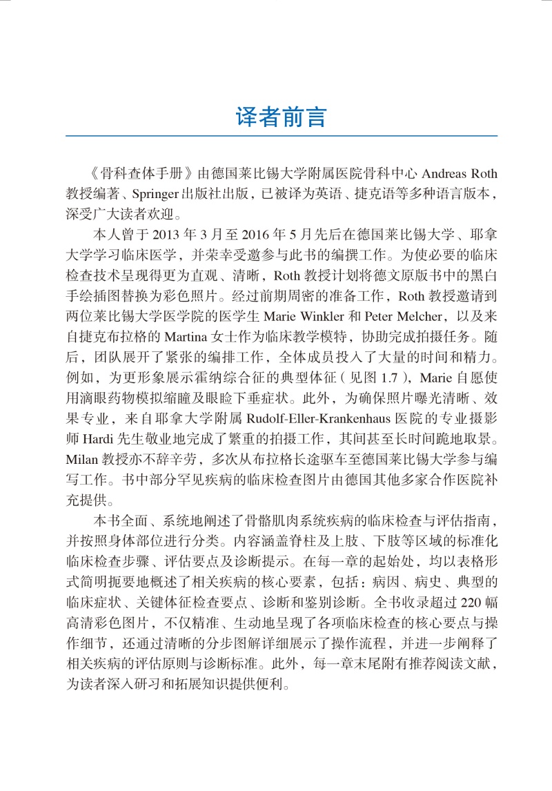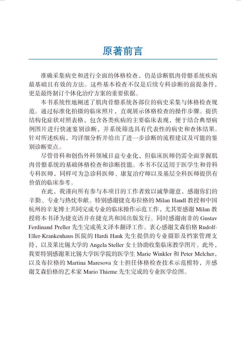 本书全面、系统地阐述了骨骼肌肉系统疾病的临床检查与评估指南,并按照身体部位进行分类。内容涵盖脊柱及上肢、下肢等区域的标准化临床检查步骤、评估要点及诊断提示。在每一章的起始处,均以表格形式简明扼要地概述了相关疾病的核心要素,包括:病因、病史、典型的临床症状、关键体征检查要点、诊断和鉴别诊断。全书收录超过220幅高清彩色示意图,不仅精准、生动地呈现了各项临床检查的核心要点与操作细节,还通过清晰的分步图解详细展示了操作流程,并进一步阐释了相关疾病的评估原则与诊断标准。此外,每一章末尾附有推荐阅读文献,为读者深入研习和拓展知识提供便利。