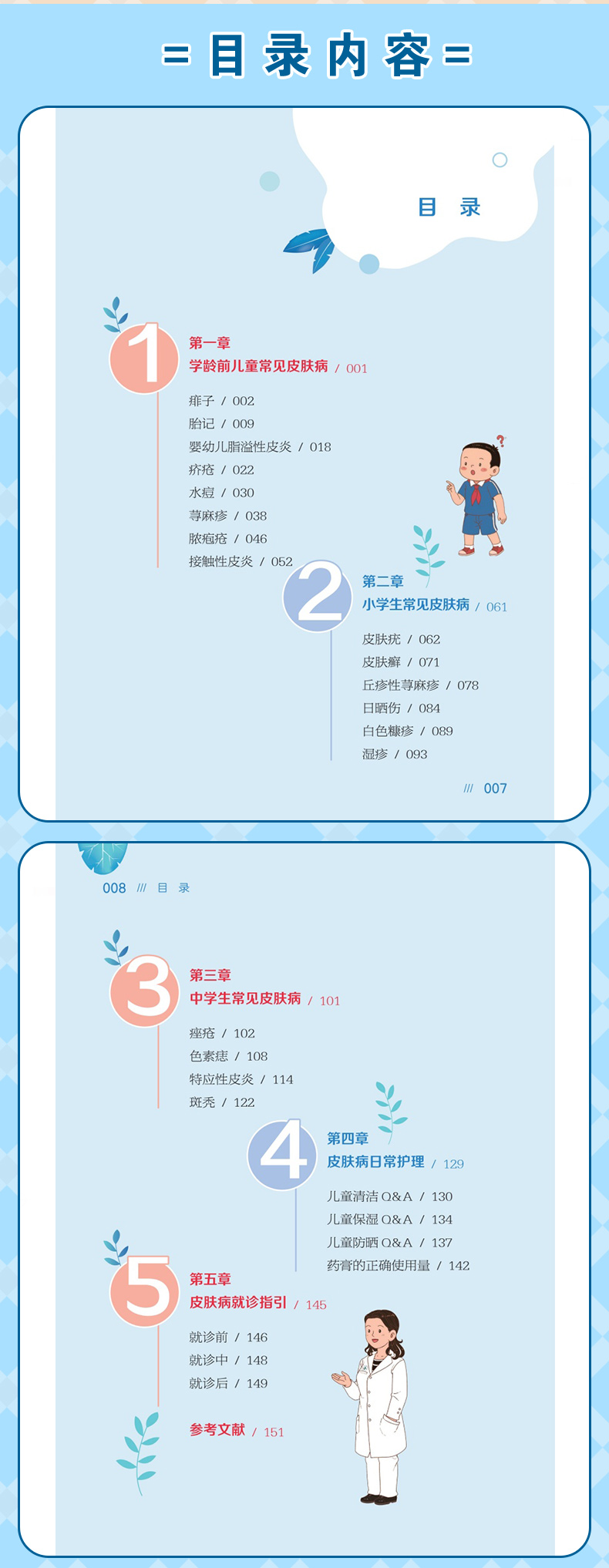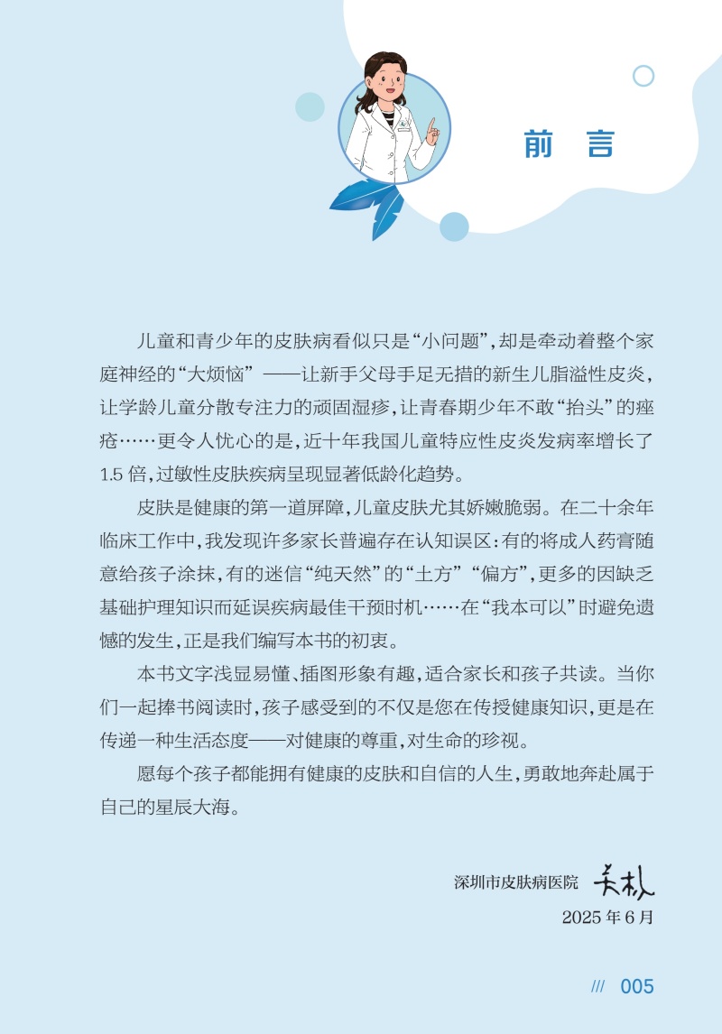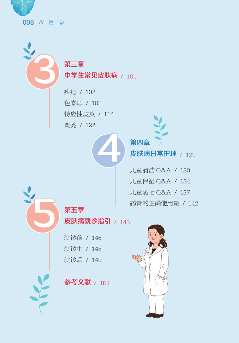 经过前期调研和论证,全书按照儿童成长阶段(幼儿园、小学、中学)划分篇章,针对不同年龄段的儿童,详细讲解了不同年龄段常见的18种皮肤病,如学龄前儿童(幼儿园篇)的水痘、荨麻疹;学龄儿童(小学篇)的湿疹、虫咬皮炎;青少年(中学篇)的痤疮、痣等。每章节不仅全面介绍了疾病的病因、临床表现、治疗和预防措施,还详细介绍了家庭护理要点,帮助家长在家中对儿童实施有效的照护。同时,以实际门诊案例为基础,提供专业解答,使内容更具实用性和参考价值。