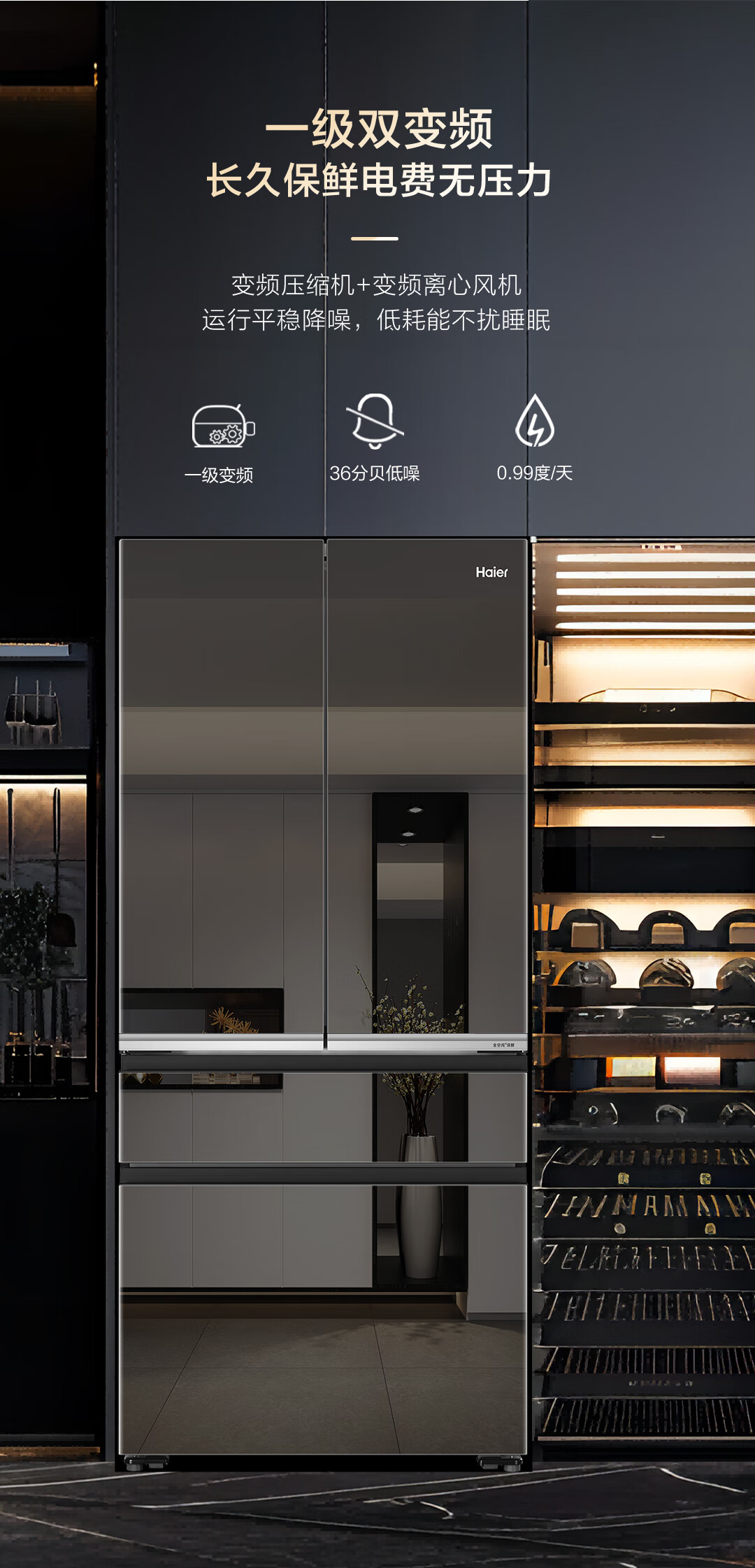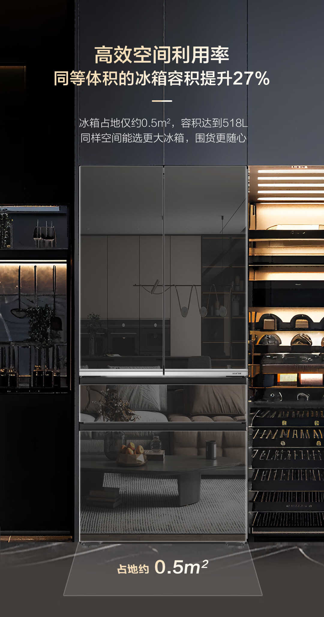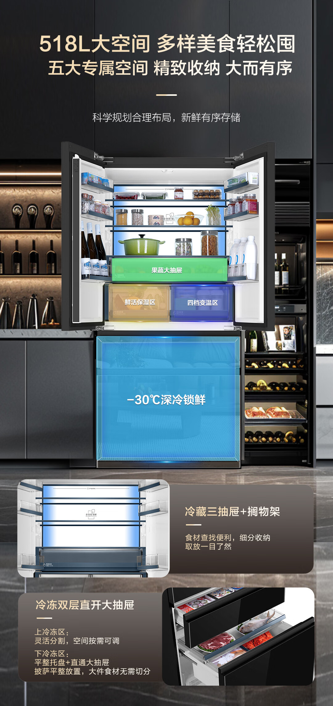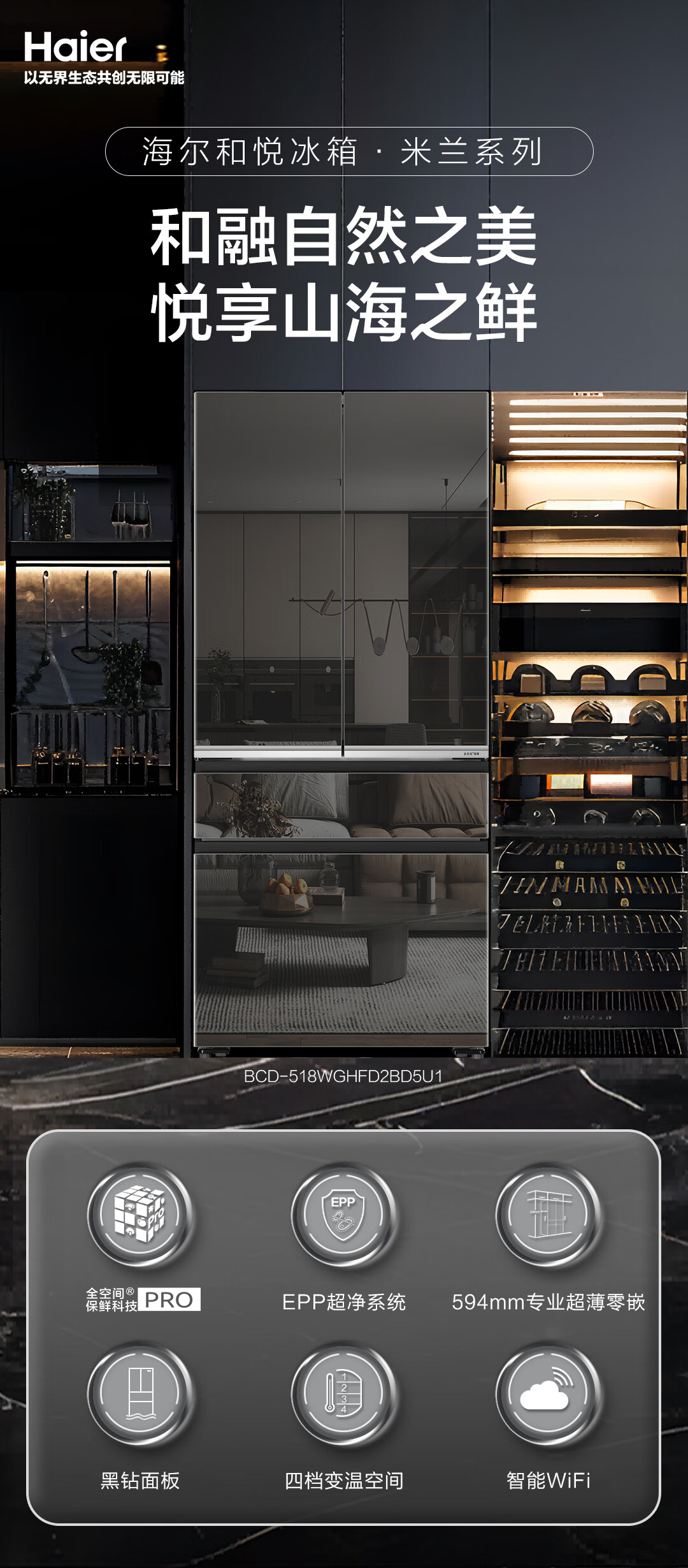 米兰系列-海尔518升和悦冰箱594mm专业超薄零嵌入式法式多门四开门家用电冰箱一级能效变频BCD-518WGHFD2BD5U1