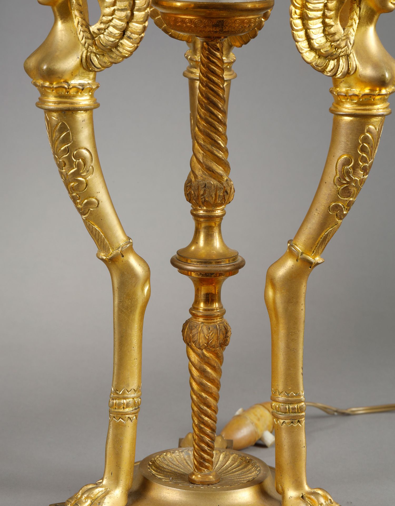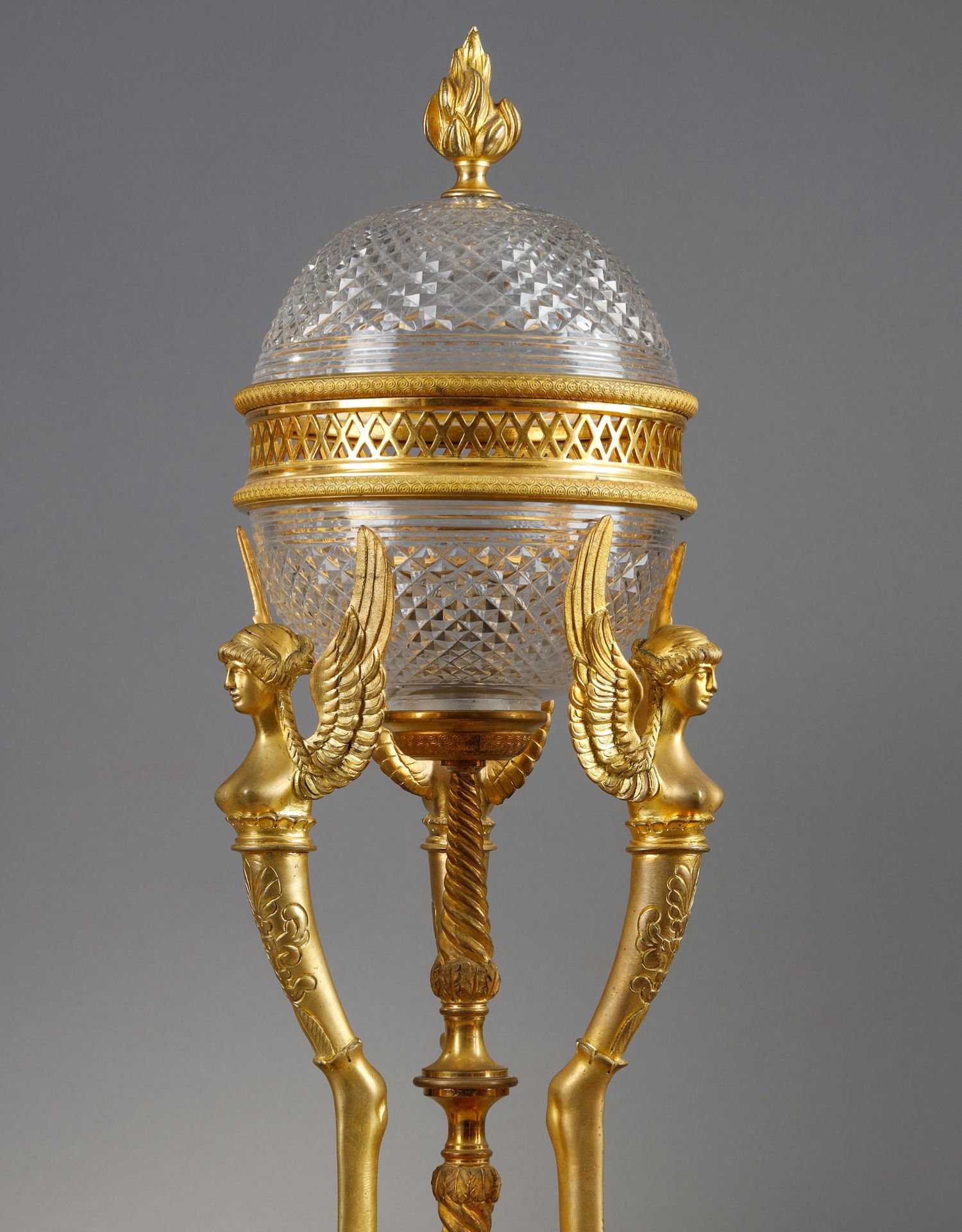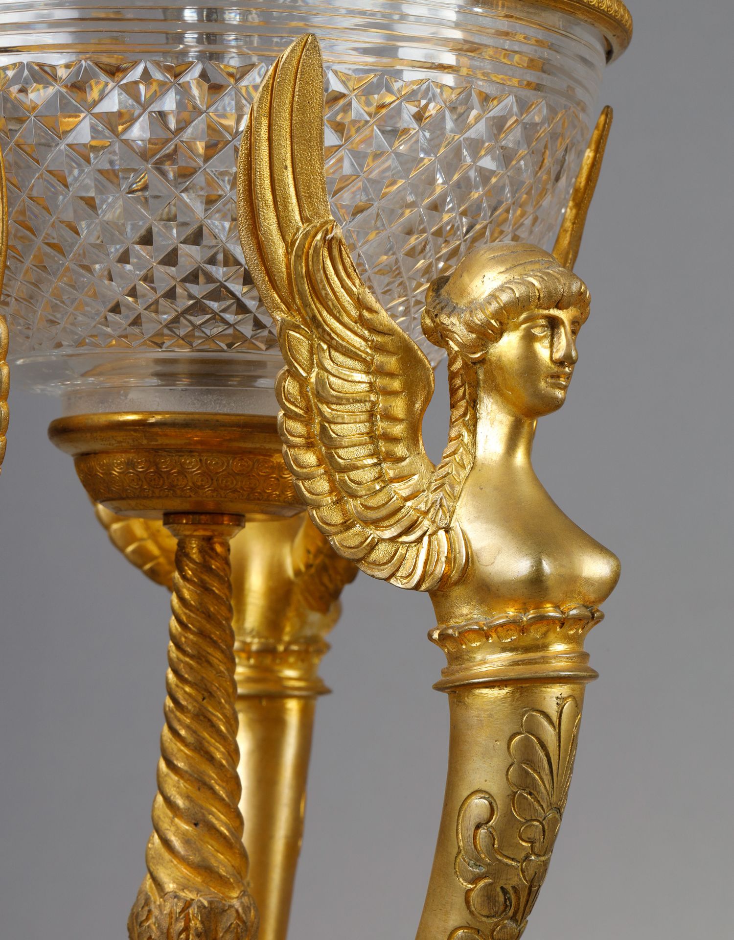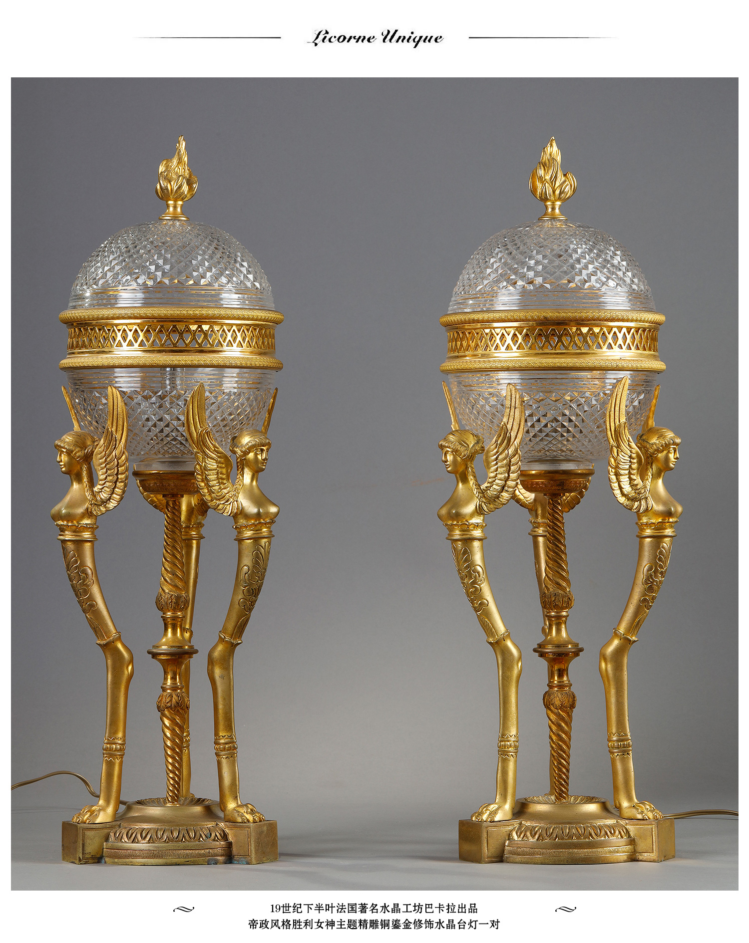 独角鹿西洋古董法国帝政风格胜利女神铜鎏金巴卡拉水晶台灯一对