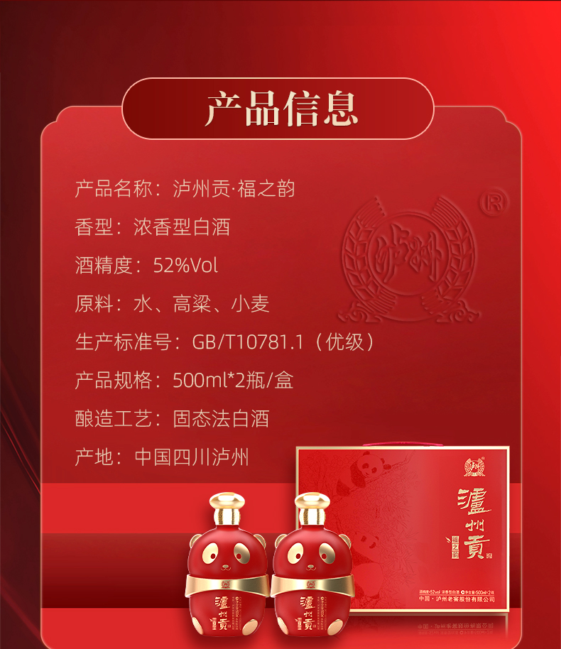 心选丨【送礼佳品】泸州贡福之韵52度浓香型白酒大熊猫礼盒装500ml*2瓶