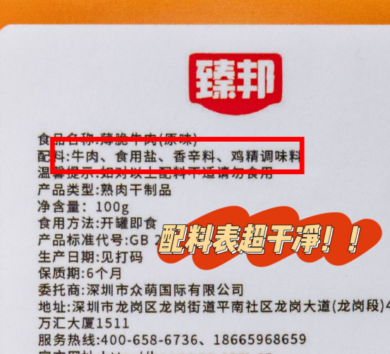 【臻邦·牛肉薄脆】 👍每一片都是整块牛后腿肉切出来的真正纯牛肉 💚配料表超级干净,只有牛肉和香料 不额外添加任何❌大豆蛋白!❌淀粉!❌肉骨泥!❌杂肉! 🏆蛋白质含量超高,>115%的含量在同类产品中一骑绝尘 ⛹🏻脂肪含量很低,减脂期也能吃健康小零食 😋好嚼不废牙,营养又干净 📢臻邦牛肉薄脆,赶紧安排!!!
