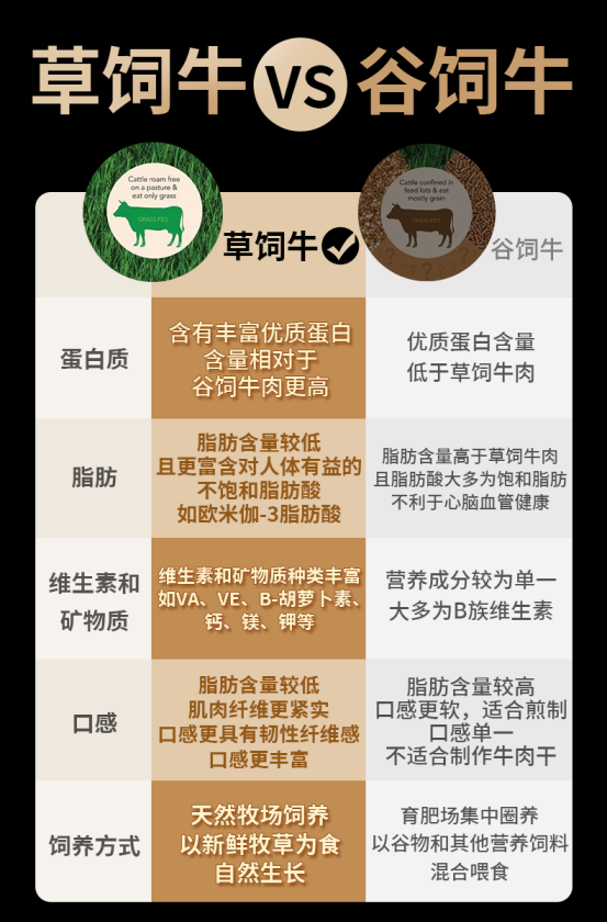 来自天然牧场的【草饲】牛肉 比【谷饲】牛肉更适合减脂期食用!! 牧场远离城市污染,养出天然的醇香肉味 脂肪:脂肪含量更低,大多是饱和脂肪如欧米伽-3脂肪酸 营养:蛋白含量更高,维生素和矿物质种类更丰 口感:肉质更紧实,口感更具纤维感和韧性 草饲牛肉薄脆口感更加鲜韧细密,肉味更加浓郁醇厚 130%的超高蛋白质含量 狂吃不胖,只涨营养不长肉!