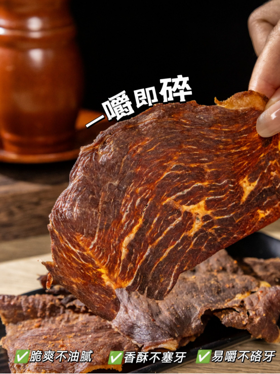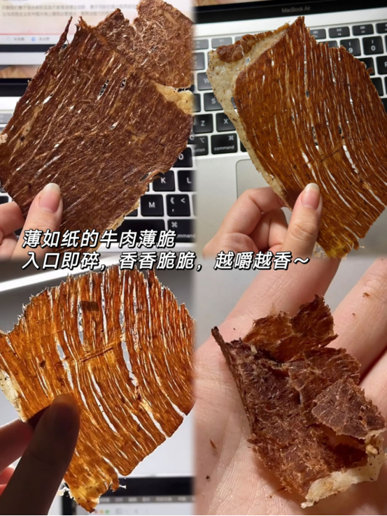 这个牛肉薄脆不是邦邦硬嚼不动的口感 👍入口一嚼即碎,非常好嚼 😋又脆又香,还能吃出奶味 ⭕咸香入口,⭕不干不柴,⭕不油不腻 在好嚼耐嚼的同时,保留了牛肉肌理的纤维感 丝丝鲜韧,口口酥脆,就像在吃牛肉薯片 每嚼一下浓郁的牛肉香就爆满整个口腔✨ 3种口味各有特色,每一种都爱到不行 肉食爱好者就囤着吃吧,一吃一个不吱声