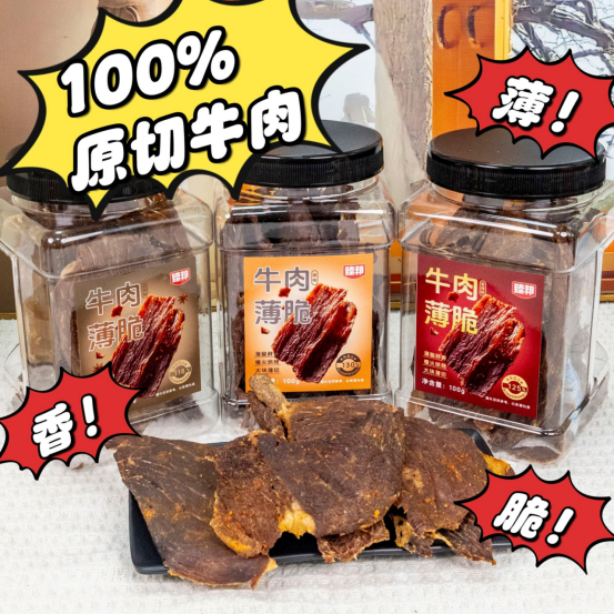 👑顶配牛肉薄脆,只用牛后腿肉做的牛肉薯片 ❌不用淀粉❌不用淋巴肉❌不用骨泥 💯真材实料纯牛肉+天然秘制香料 🔥把牛肉的柔韧和多种香料的醇香糅合在一起 既有牛肉自带的肉香和奶香味 😋香料让牛肉薄脆更具回味 🔥低温慢火烘烤,严格把控温度 使牛肉片均匀受热,牢牢锁住食材和香料的香味💫 😋多重工序加工只为牛肉薄脆的口感和口味更上一层楼 大片薄脆吃起来超级过瘾 👍薄如纸片一嚼即碎,不塞牙不硌牙 臻邦牛肉薄脆吃起来刚刚好的咸香,刚刚好的酥脆