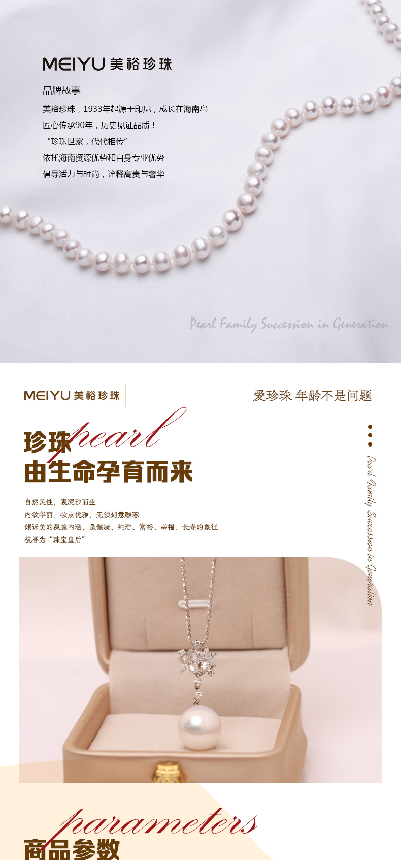- 珍珠世家,代代相传。美裕珍珠,1933年起源于印尼,成长于海南岛。依托海南资源优势和自身专业优势,以经营南珠、南洋珠为主,专注于珍珠文化的挖掘和传播,把珍珠代表的爱意,永不间断地传承下去。