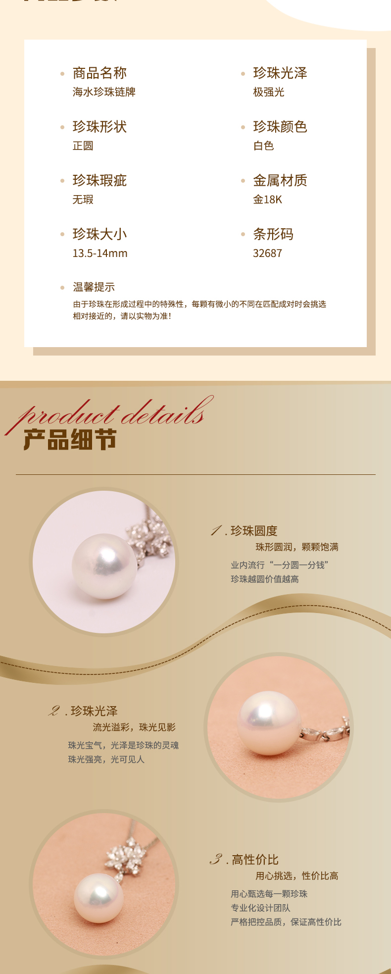 金18K海水珍珠链牌 13.5-14mm白,53cm(含珍珠)32687