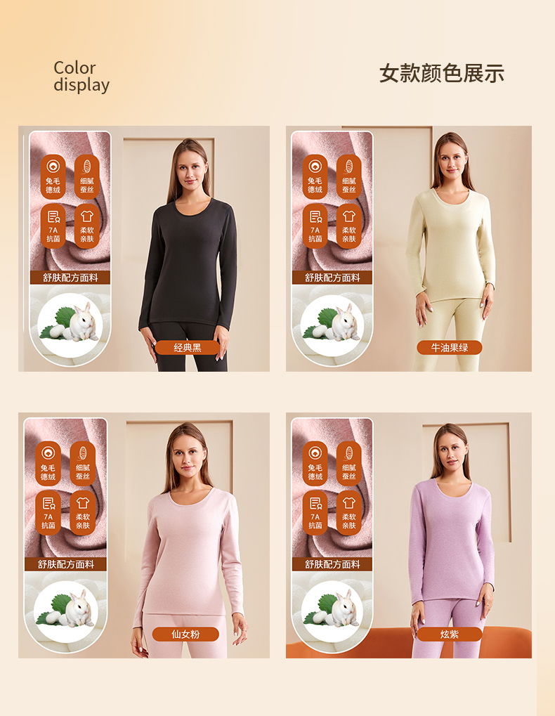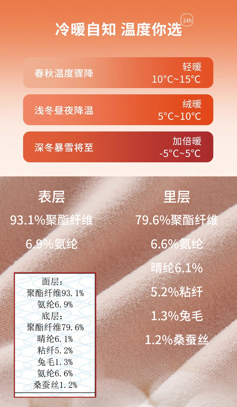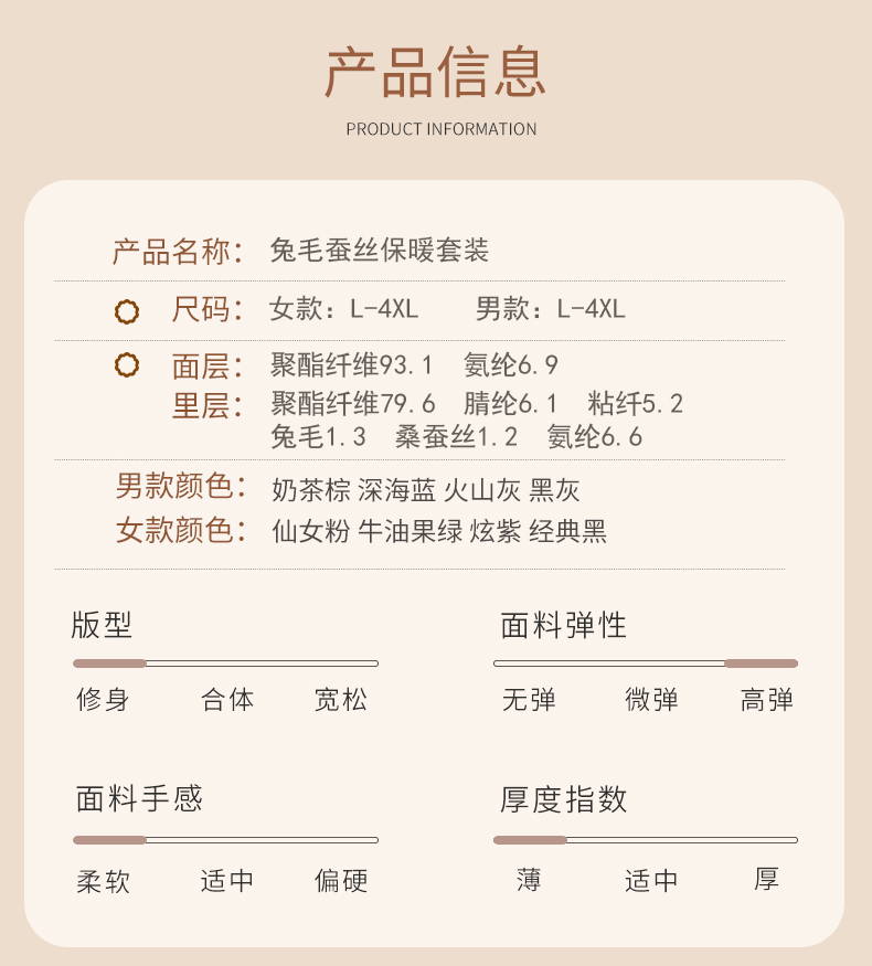 具体体重参考尺码表【秋冬款情侣兔毛蚕丝混纺保暖套装】7A天然兔毛+细腻蚕丝混纺 含腈纶发热纤维 养肤润肤 贴合身形 穿上一整个冬天都暖暖的