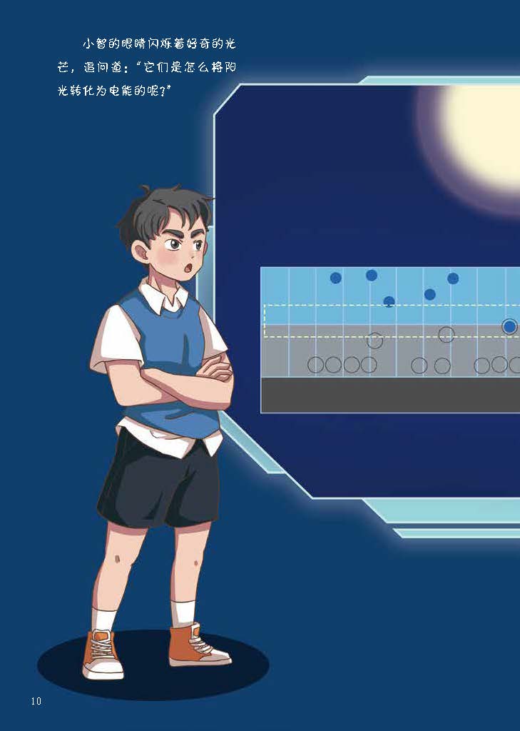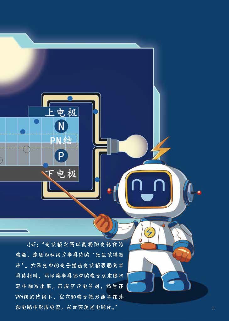 以小E和小智的探险之旅为主线,通过“时空穿梭机”,将光伏板发电的科学原理以趣味故事的形式呈现,将N型硅板与P型硅板的功能形象化,使读者易于理解。旨在激发读者对科学的兴趣,展现科技的神奇与魅力,同时传递出探索与求知的重要性,鼓励读者保持好奇心,探索未知的科学世界。