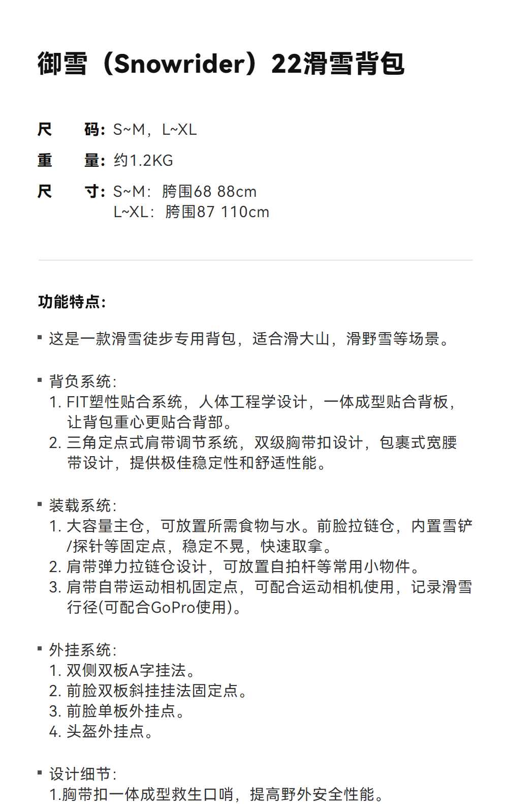 KAILAS凯乐石 户外运动 御雪(Snowrider)22滑雪背包 KA2452001