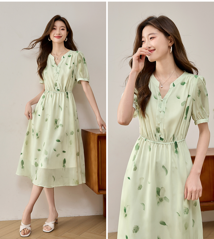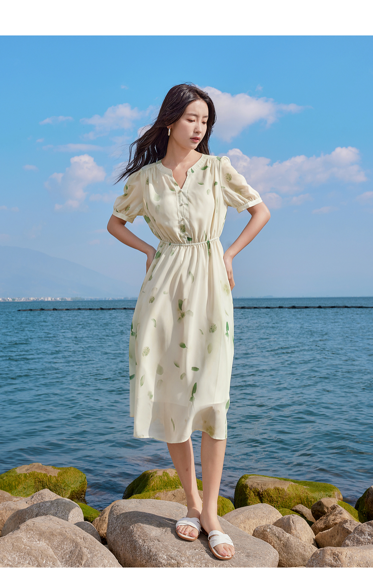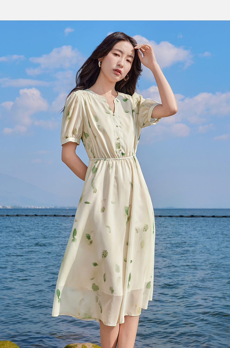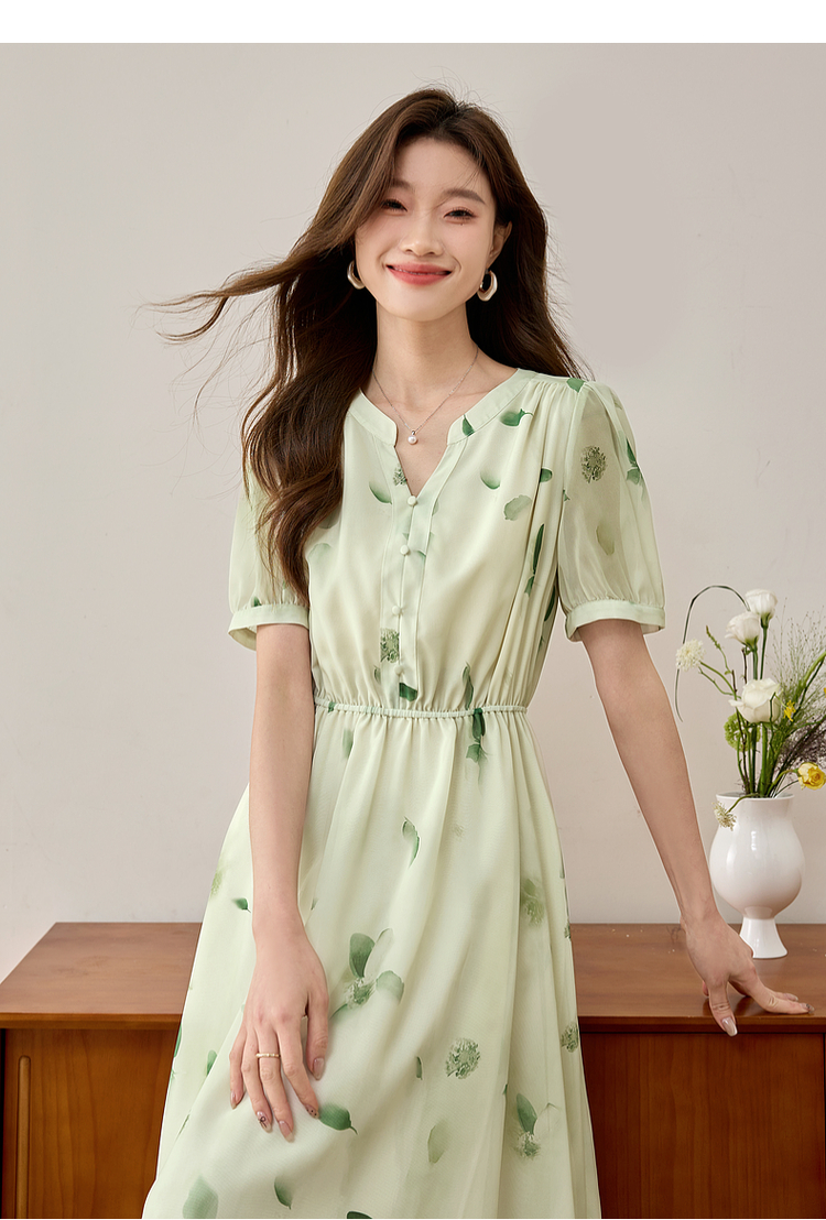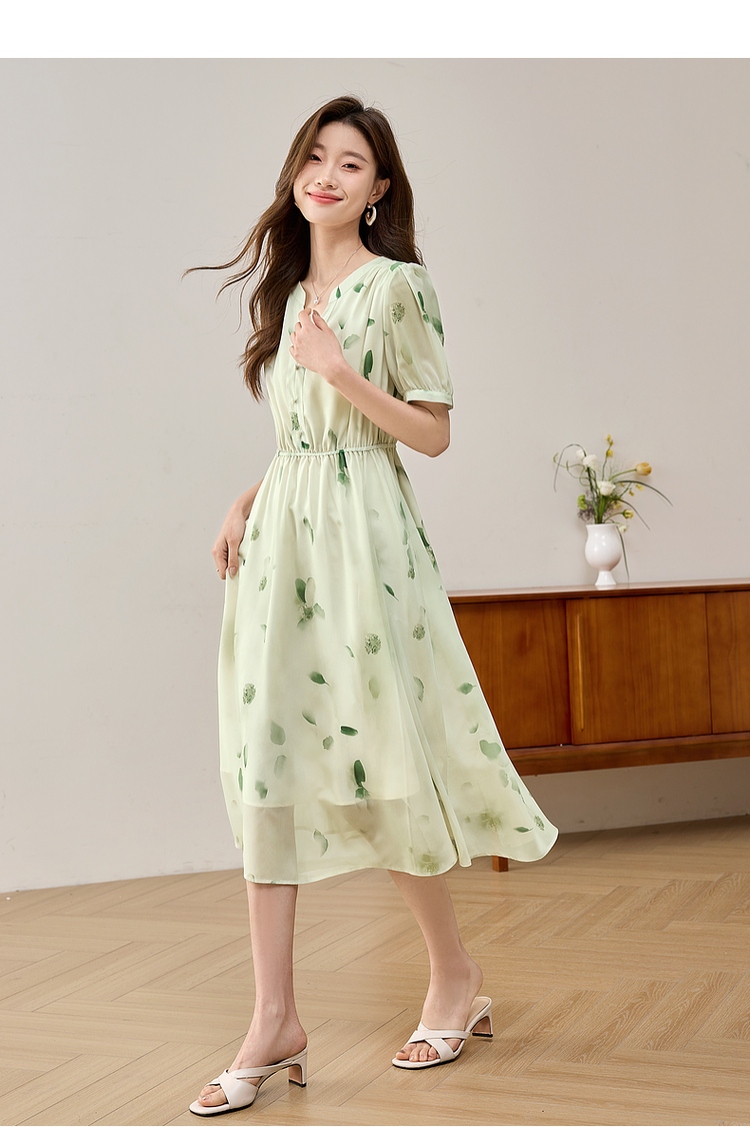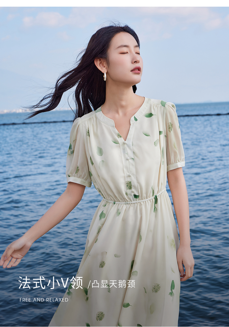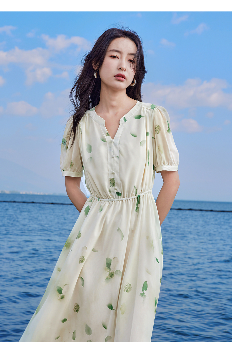 【五折购】熙世界清新气质碎花雪纺连衣裙2025夏季新款印花泡泡袖妈妈裙子
