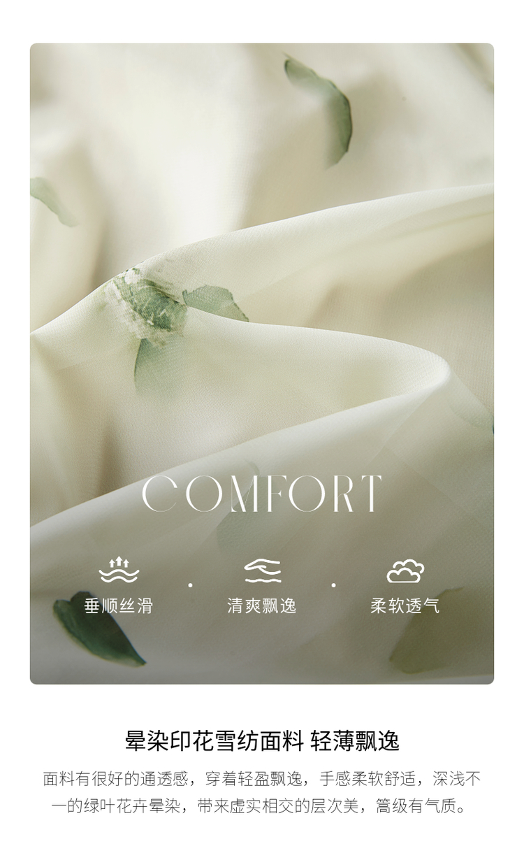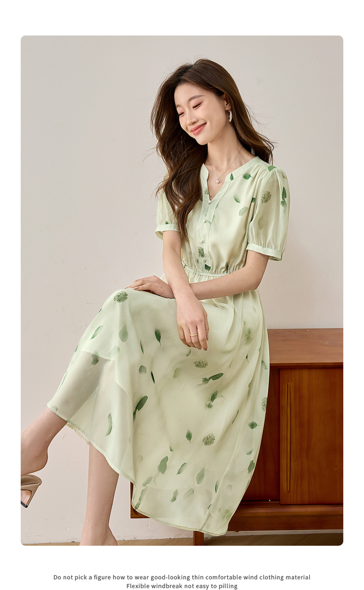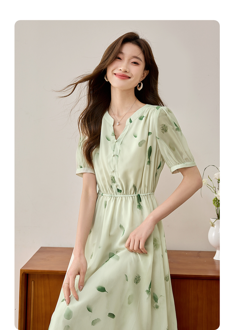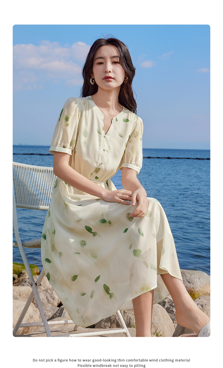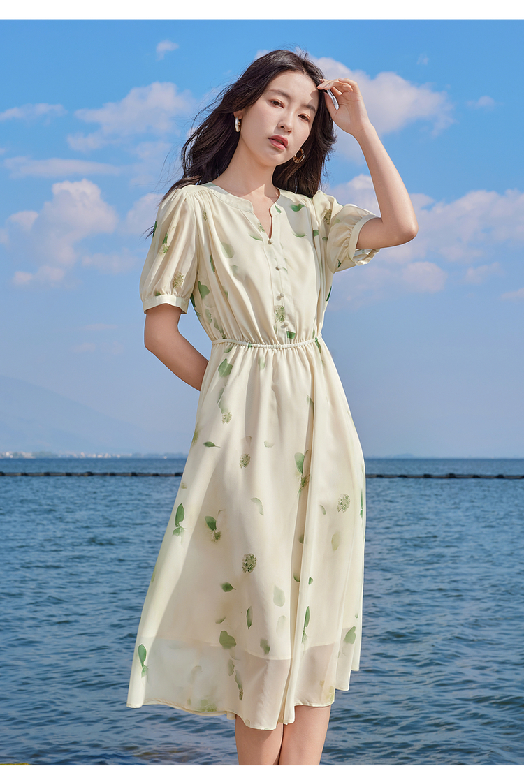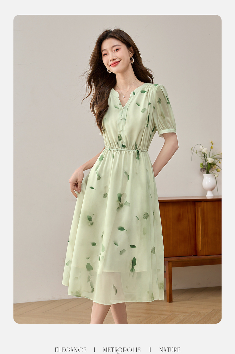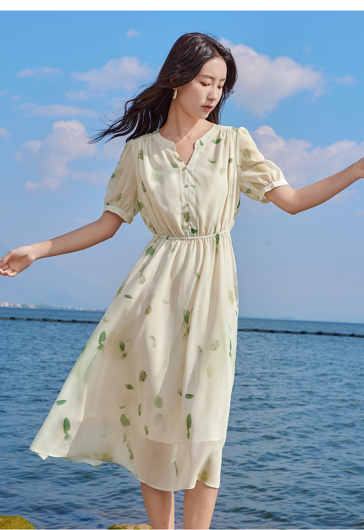 【五折购】熙世界清新气质碎花雪纺连衣裙2025夏季新款印花泡泡袖妈妈裙子