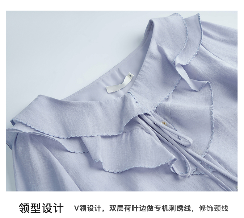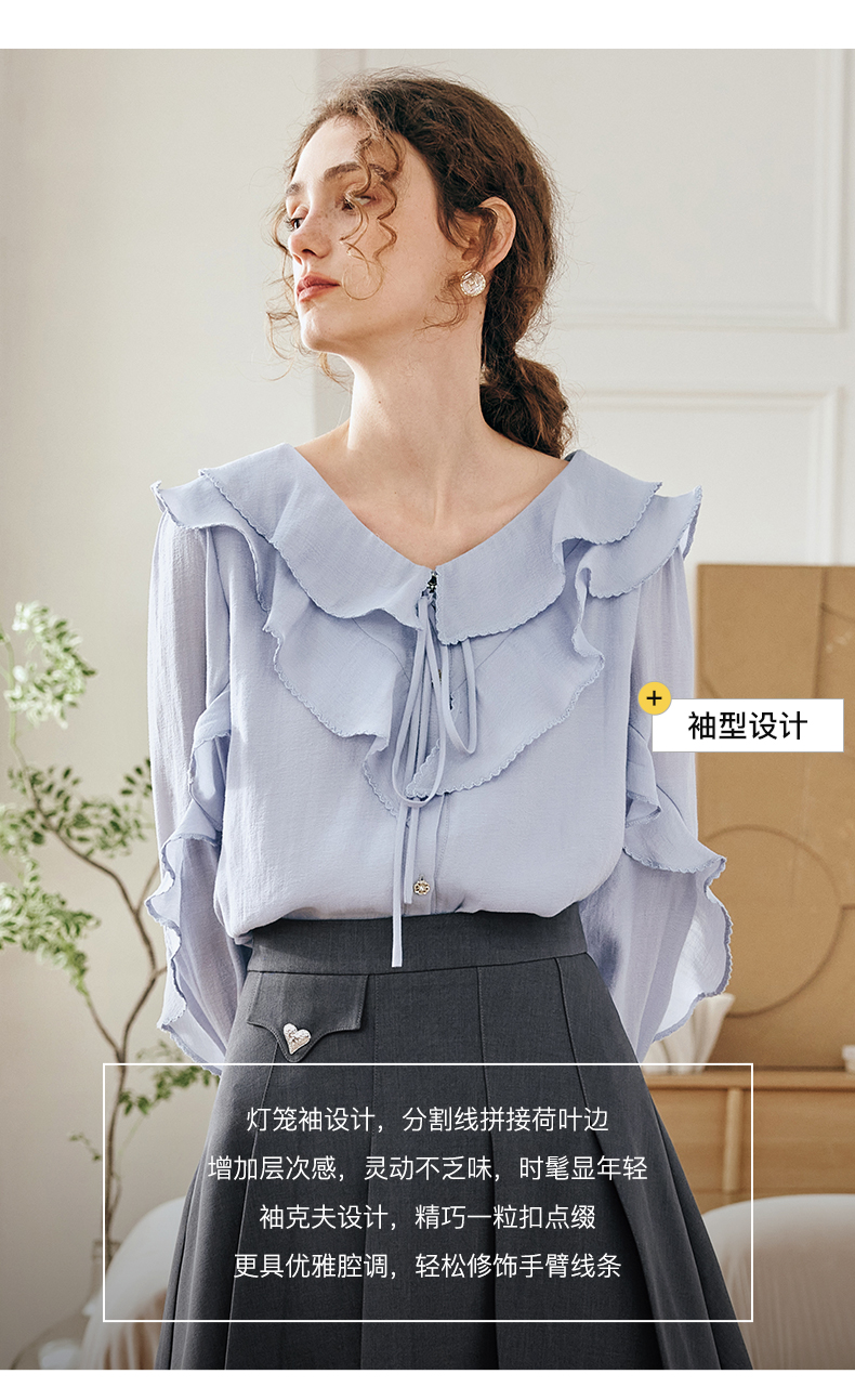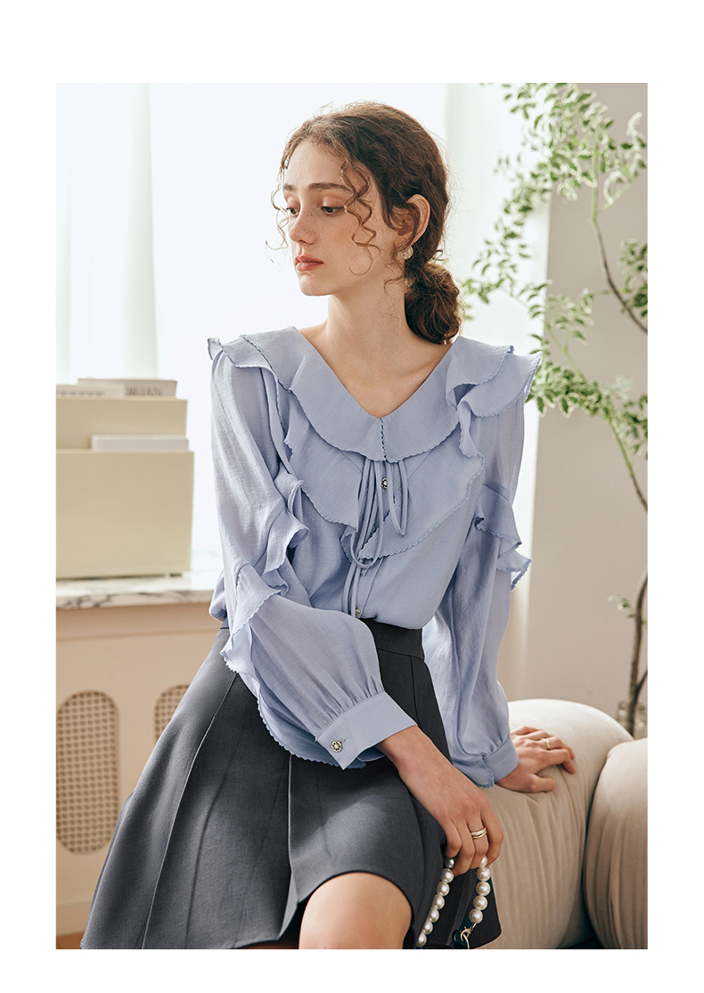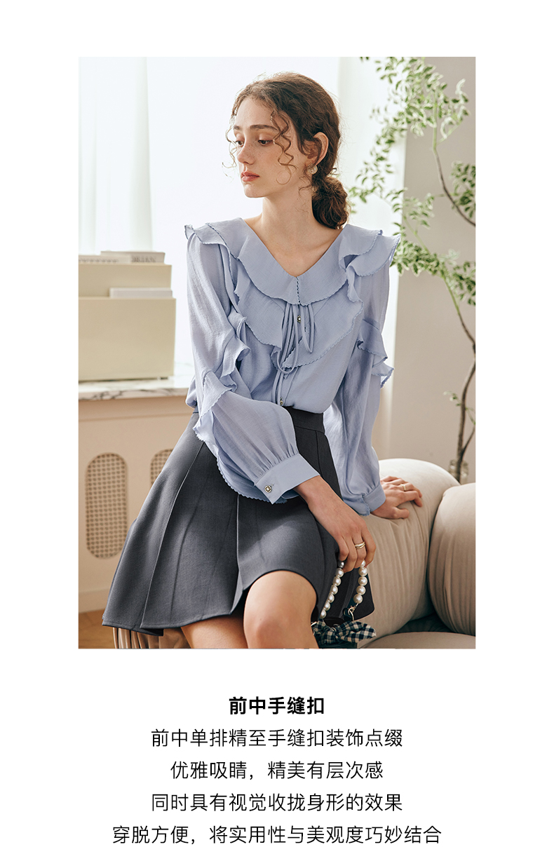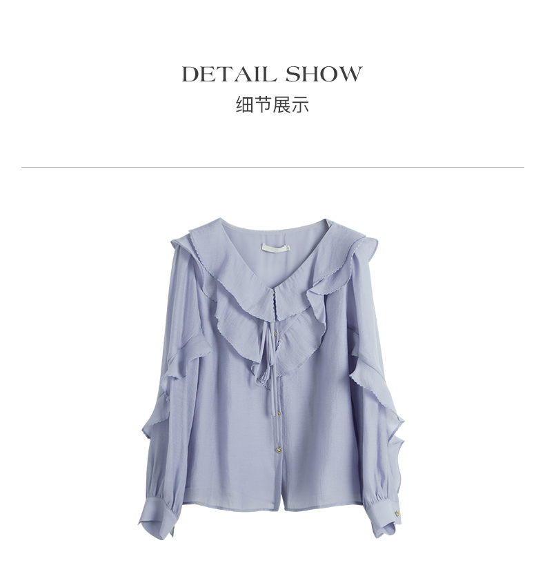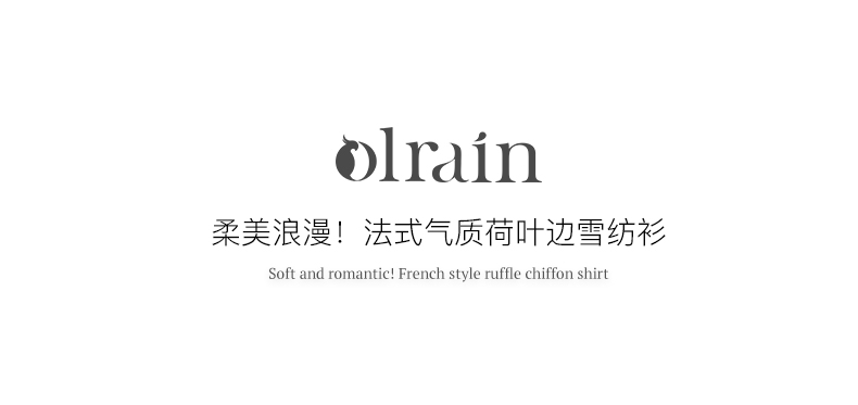 OLrain欧芮儿法式纯色蕾丝雪纺衫女春季2023年新款荷叶边V领小衫