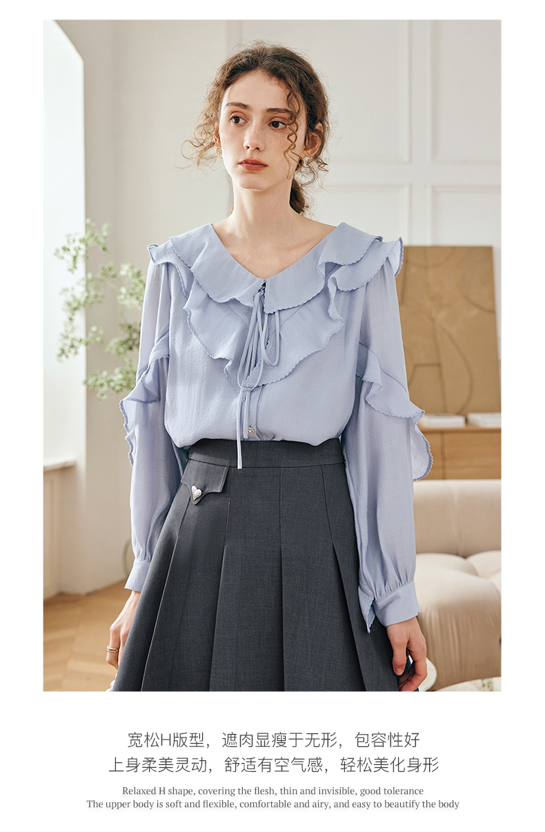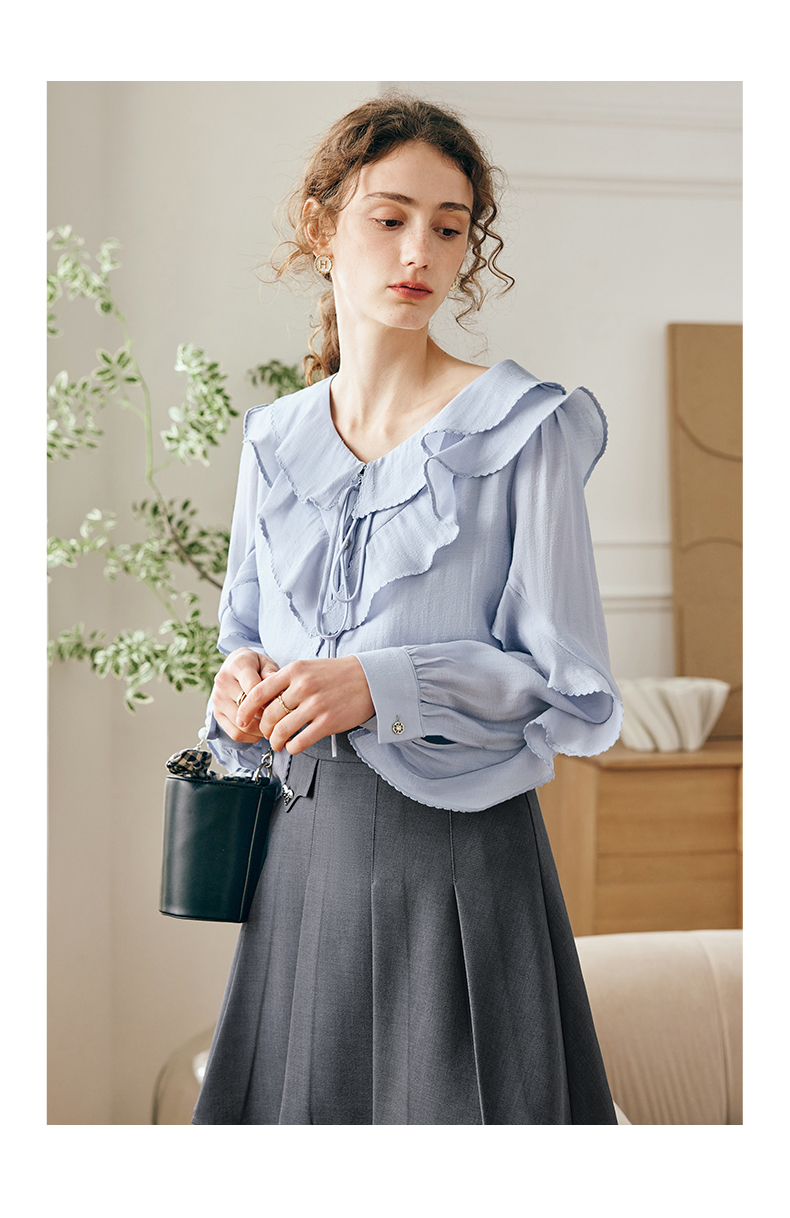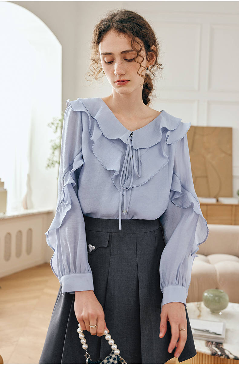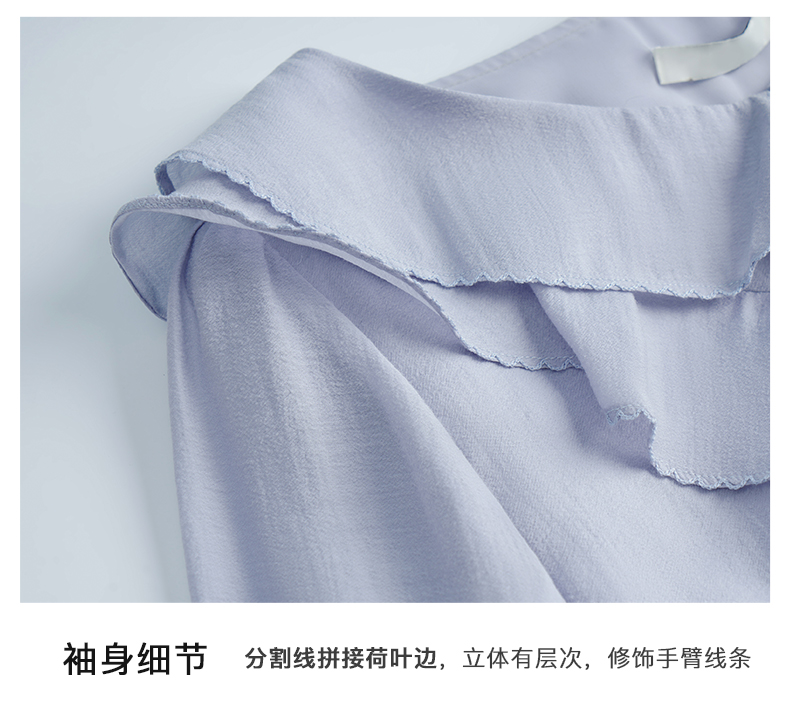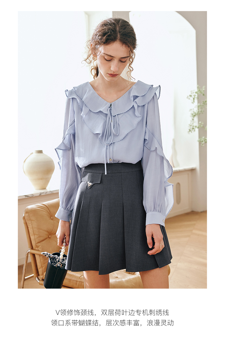 OLrain欧芮儿法式纯色蕾丝雪纺衫女春季2023年新款荷叶边V领小衫