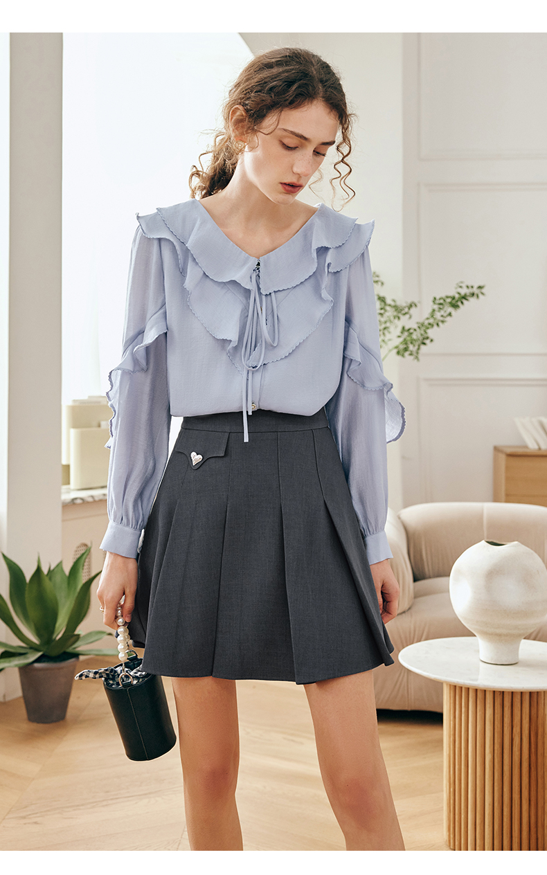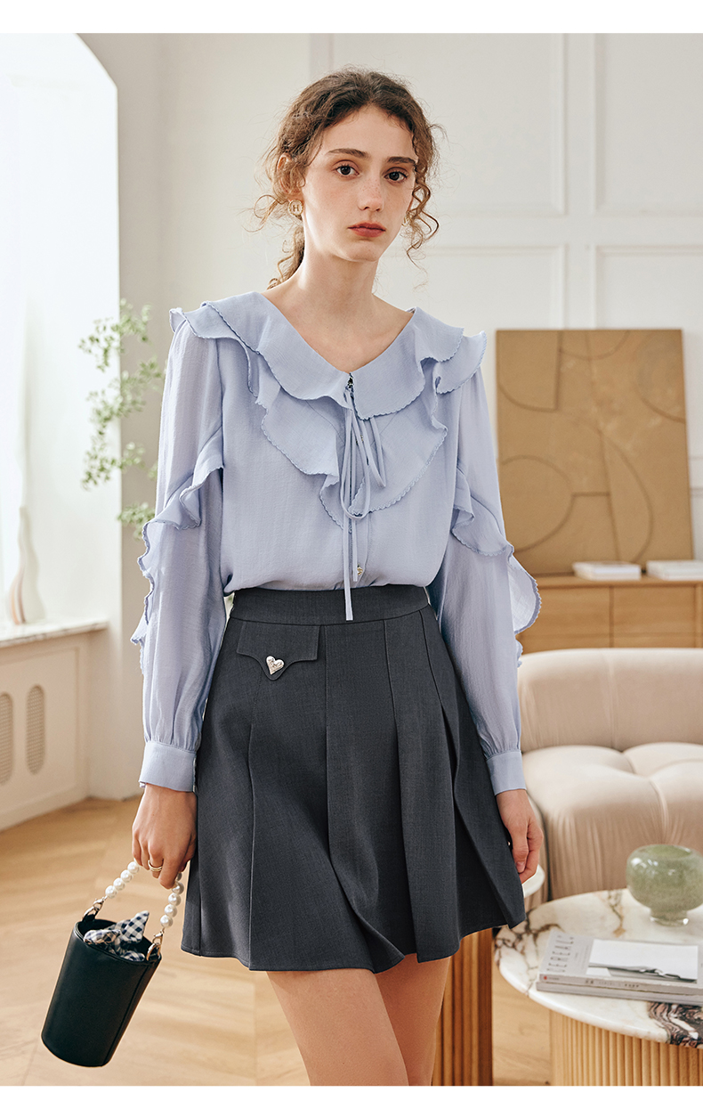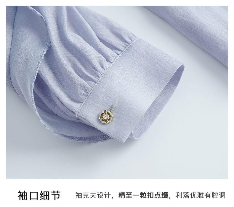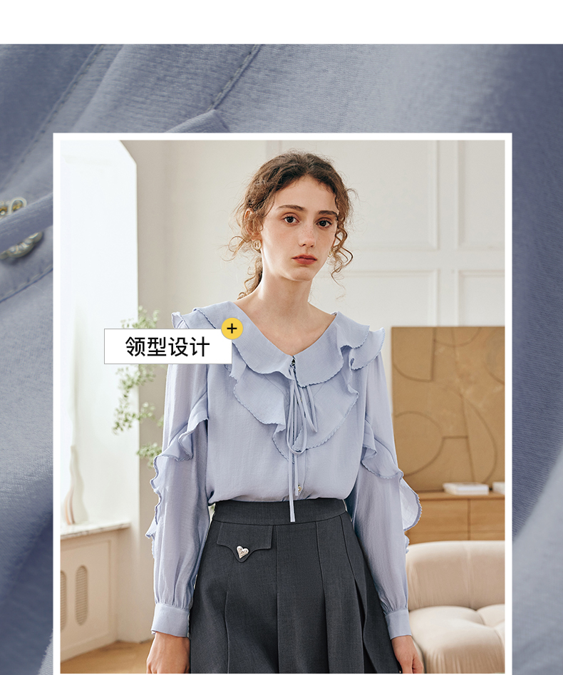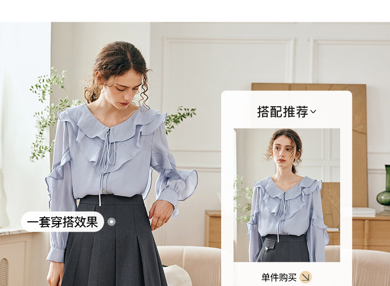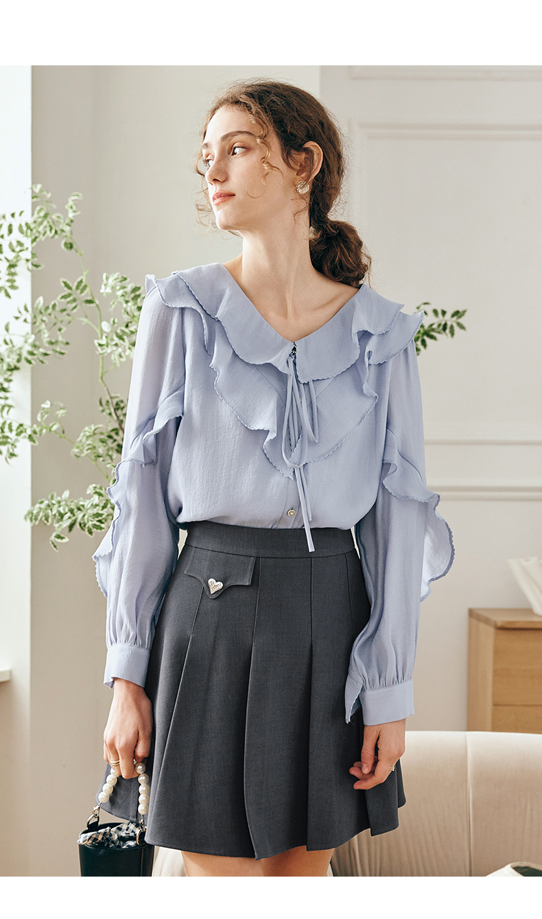OLrain欧芮儿法式纯色蕾丝雪纺衫女春季2023年新款荷叶边V领小衫