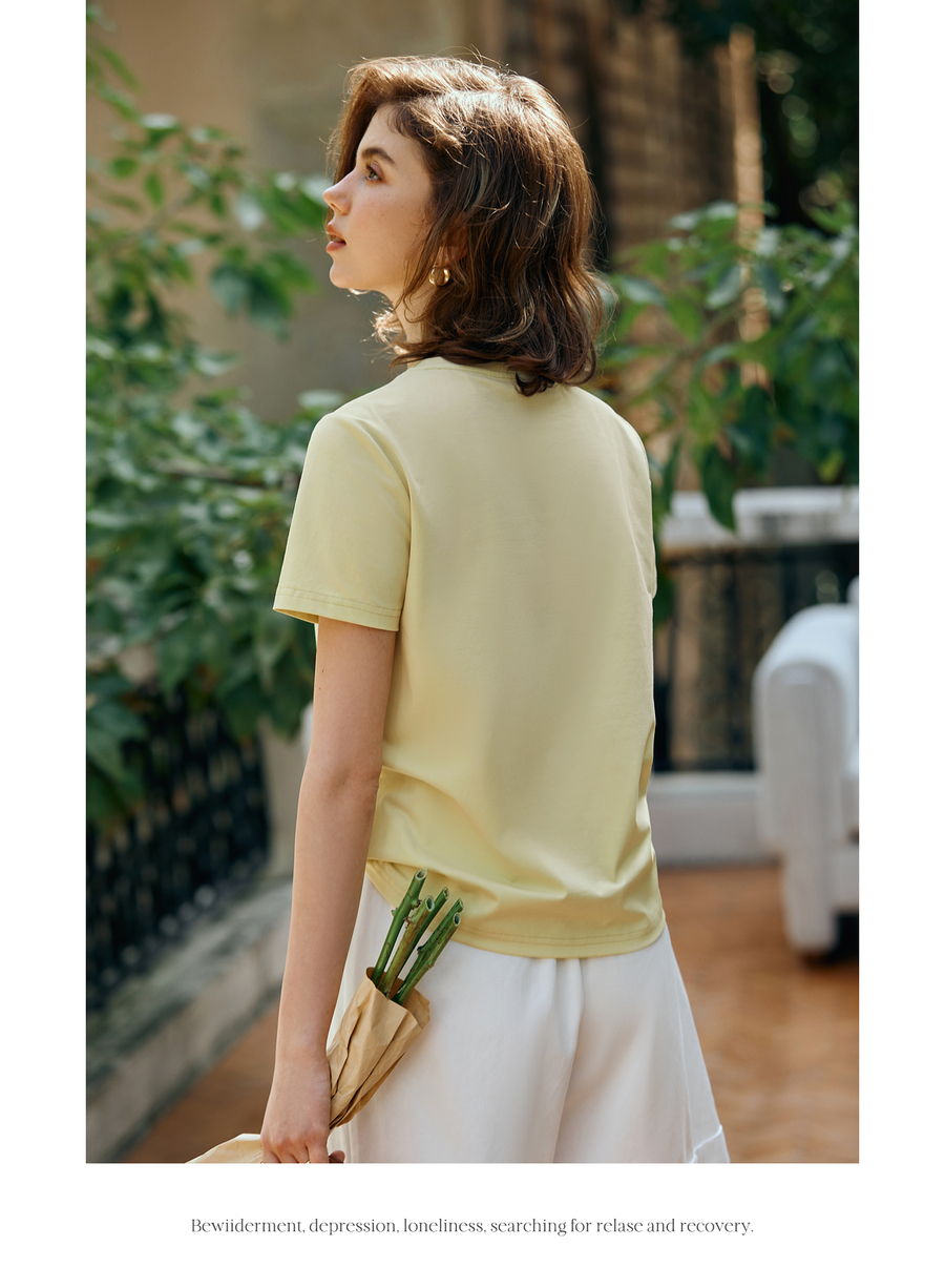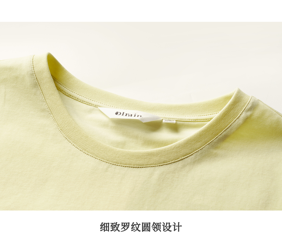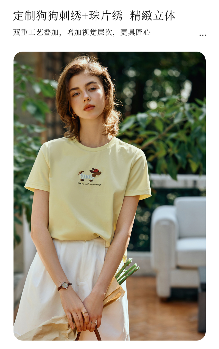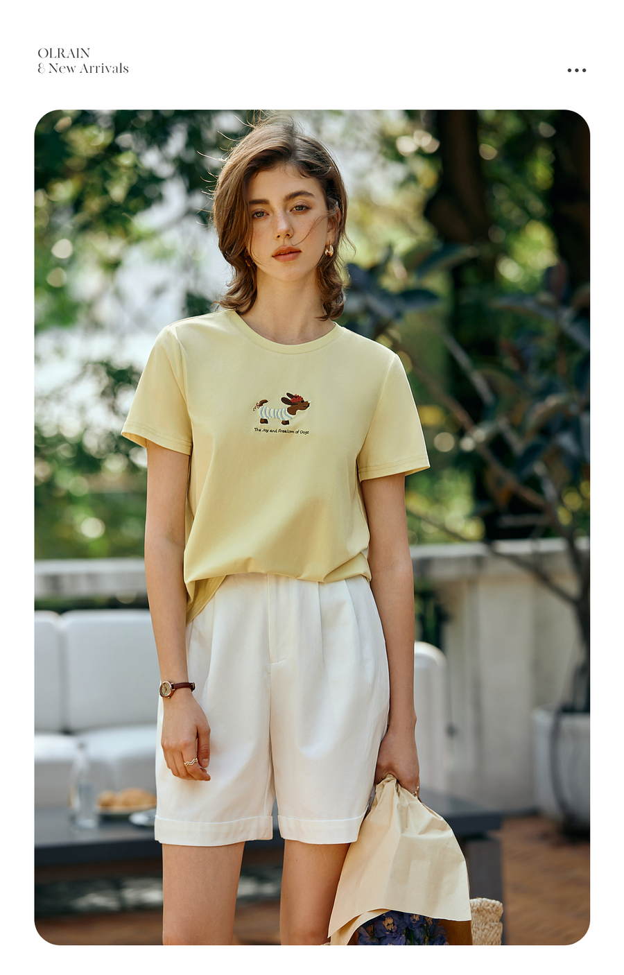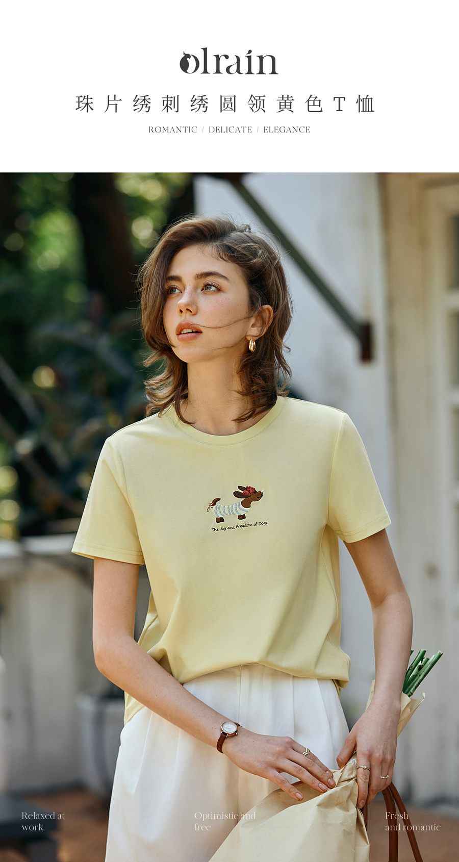 OLrain欧芮儿珠片绣刺绣圆领黄色T恤女春季2025新款宽松休闲上衣