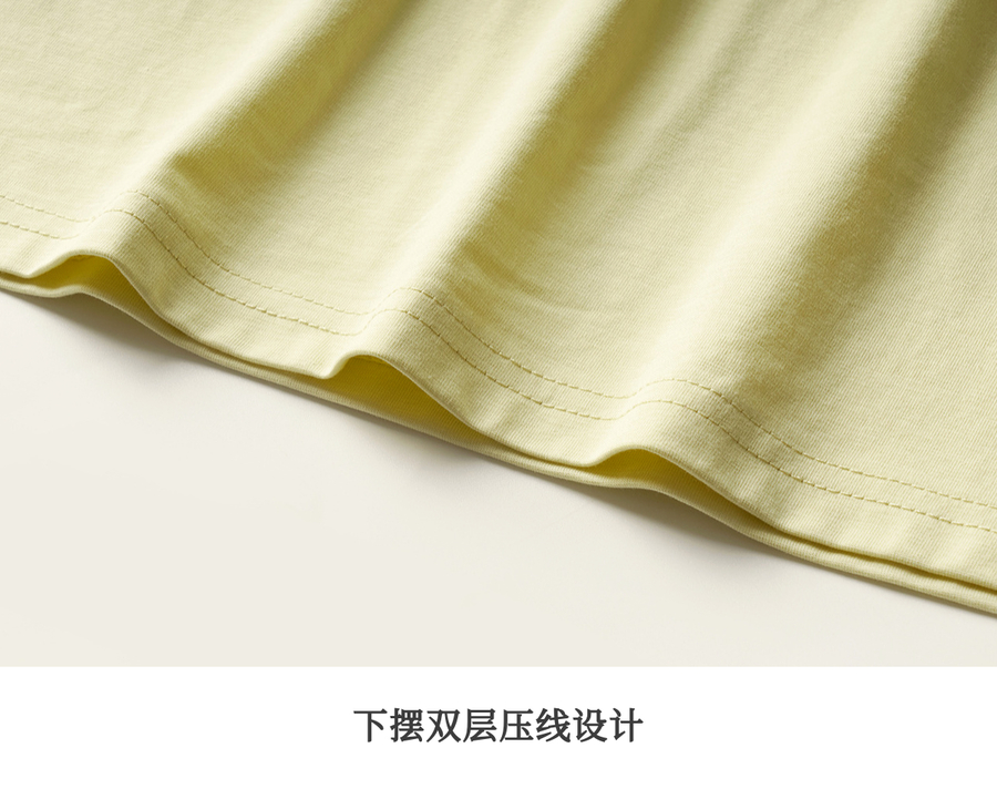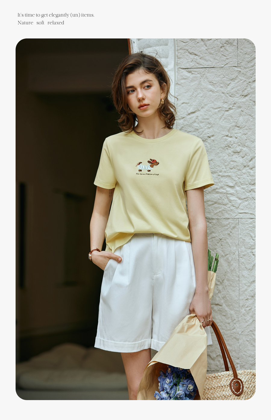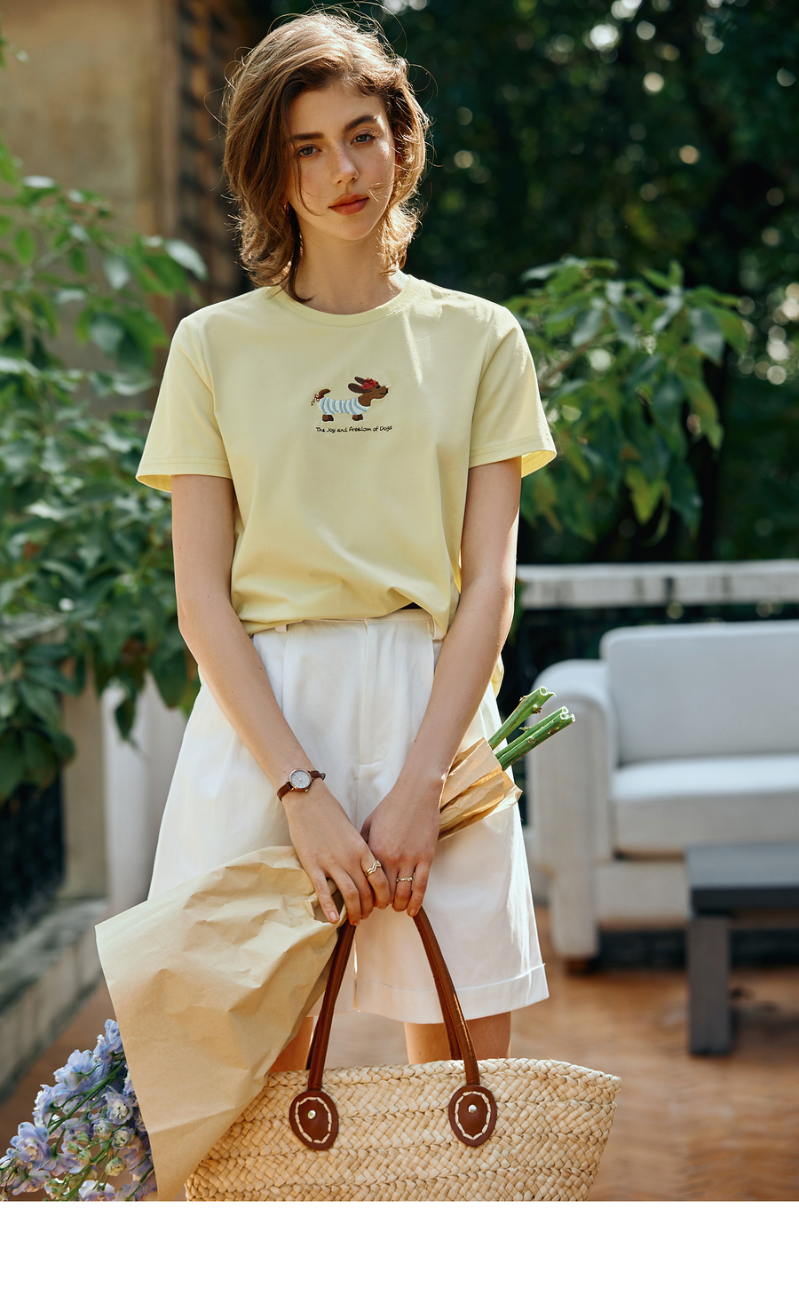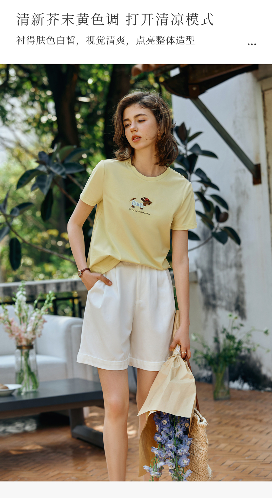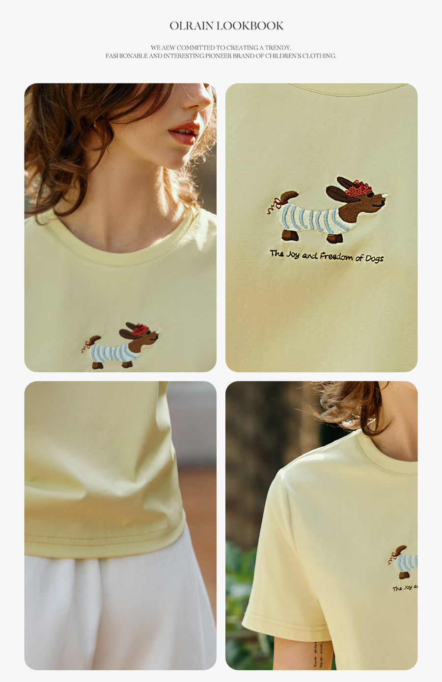 OLrain欧芮儿珠片绣刺绣圆领黄色T恤女春季2025新款宽松休闲上衣