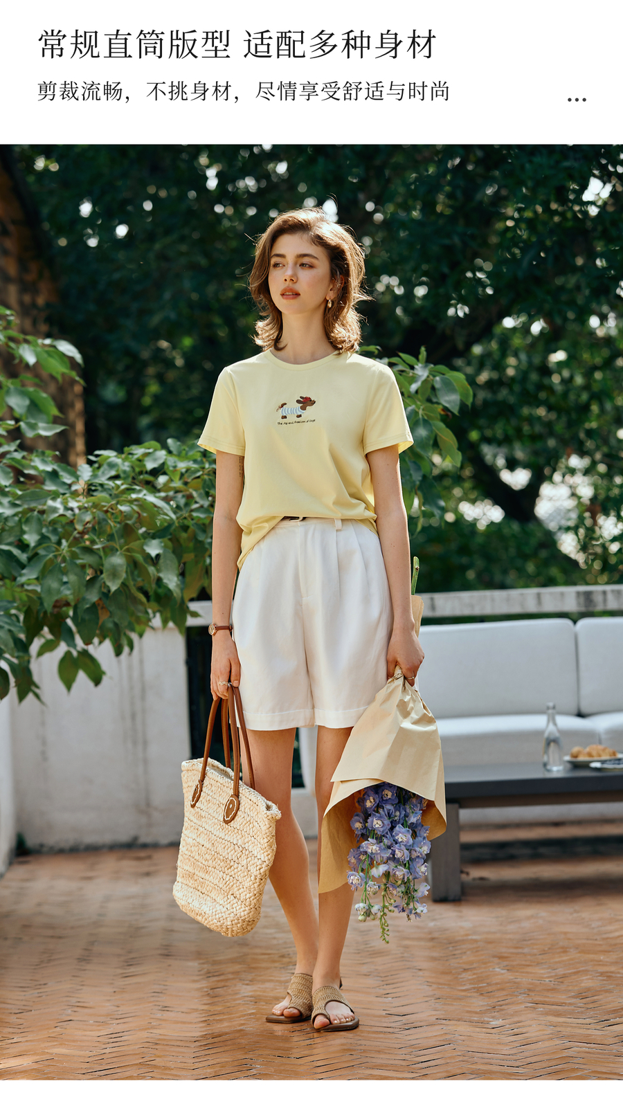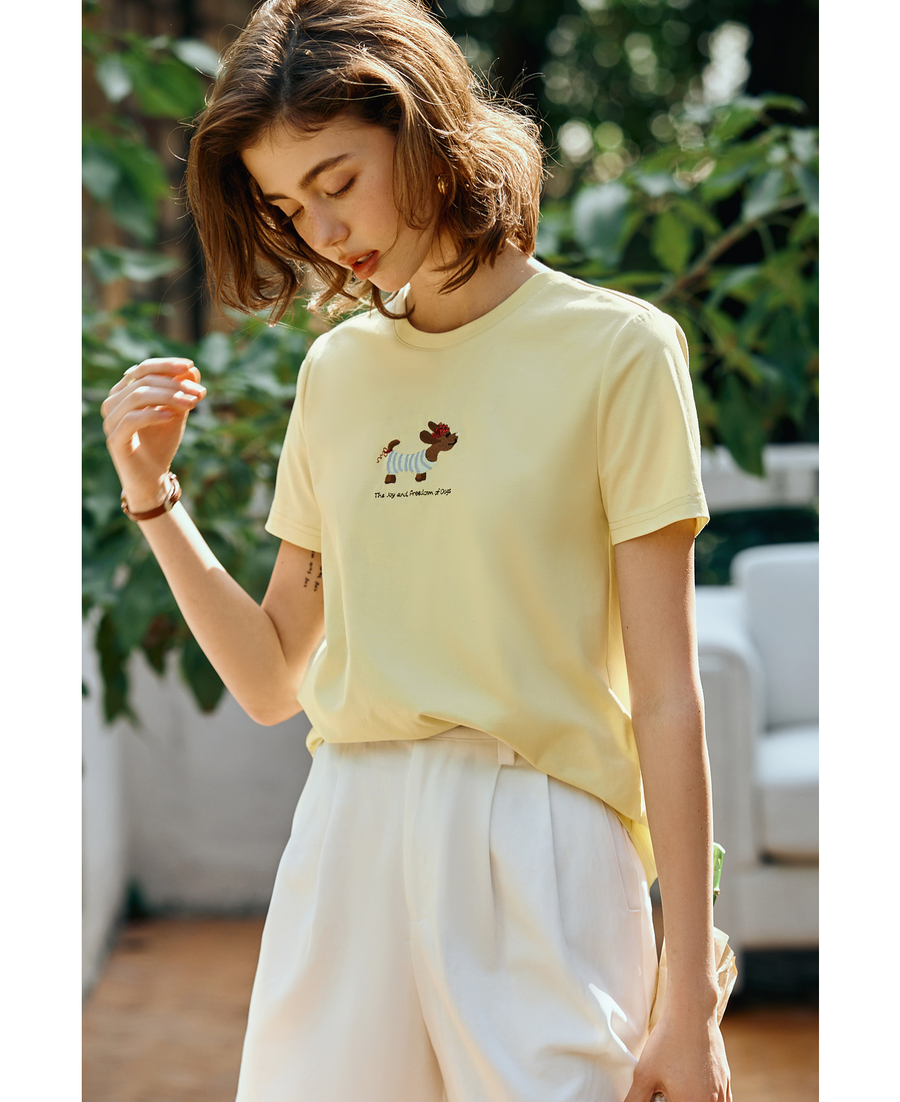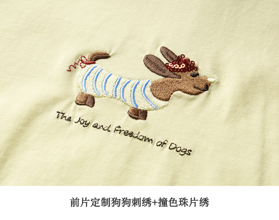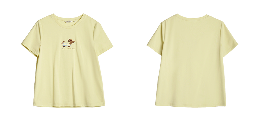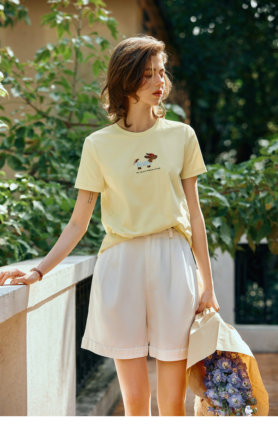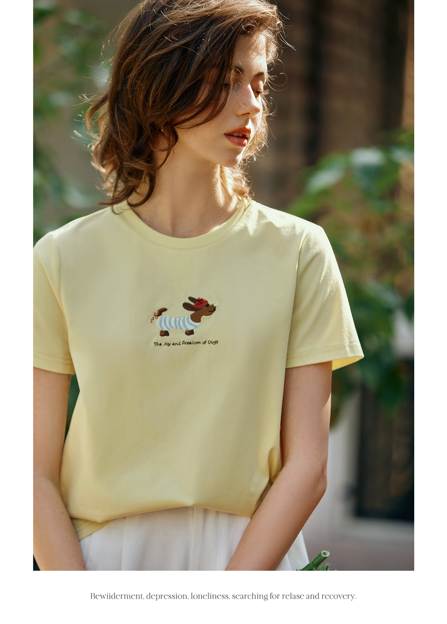 OLrain欧芮儿珠片绣刺绣圆领黄色T恤女春季2025新款宽松休闲上衣