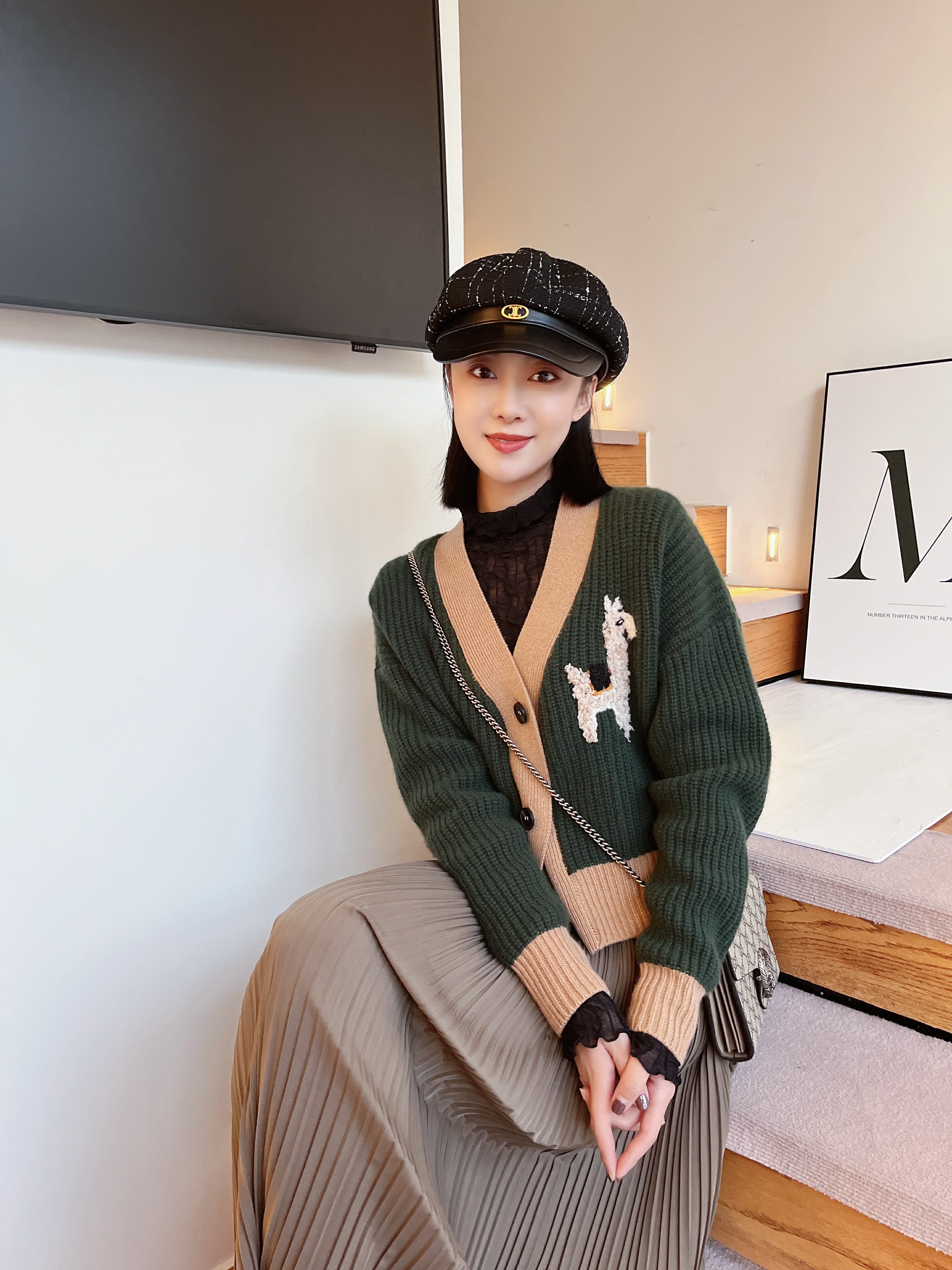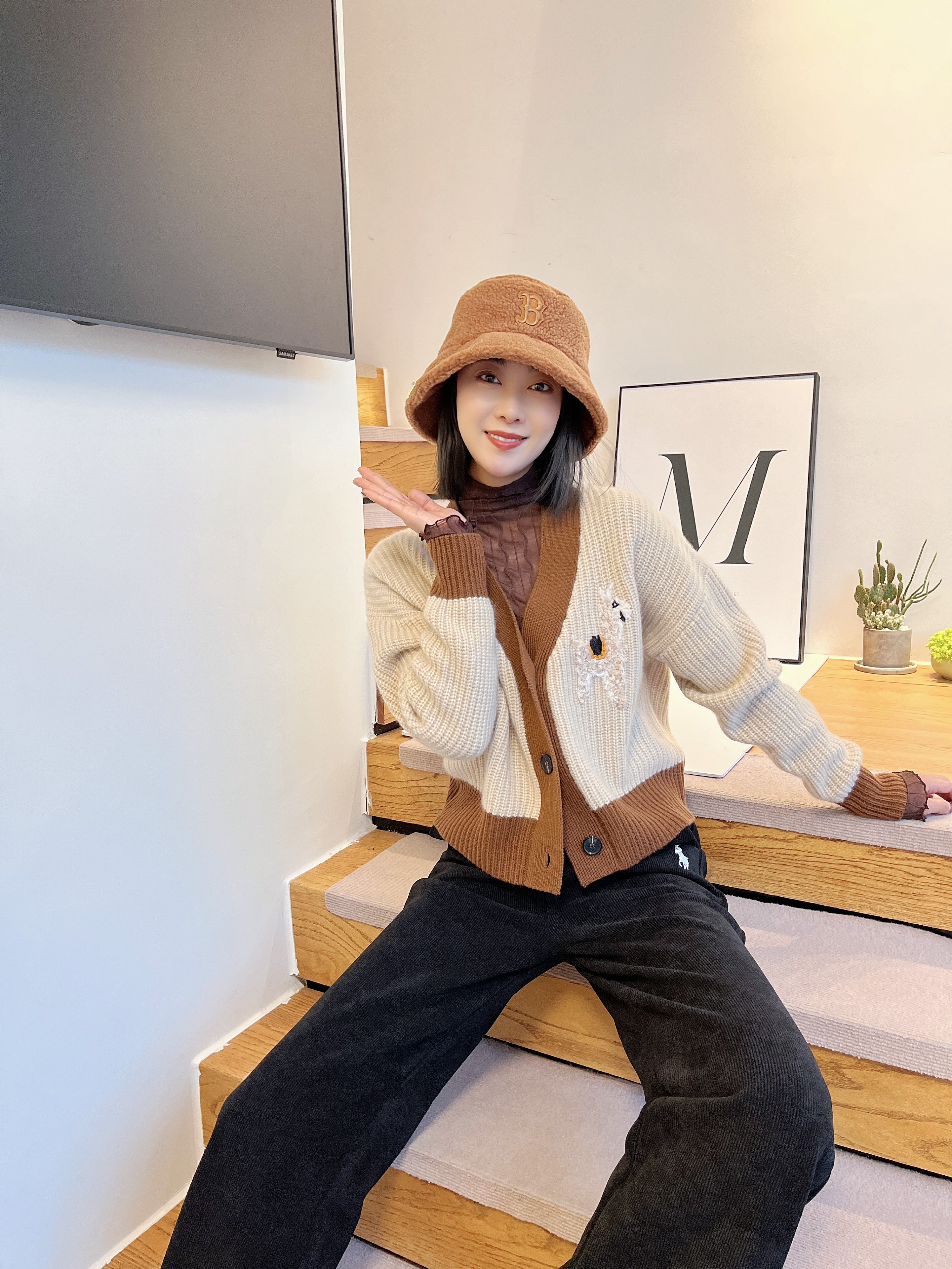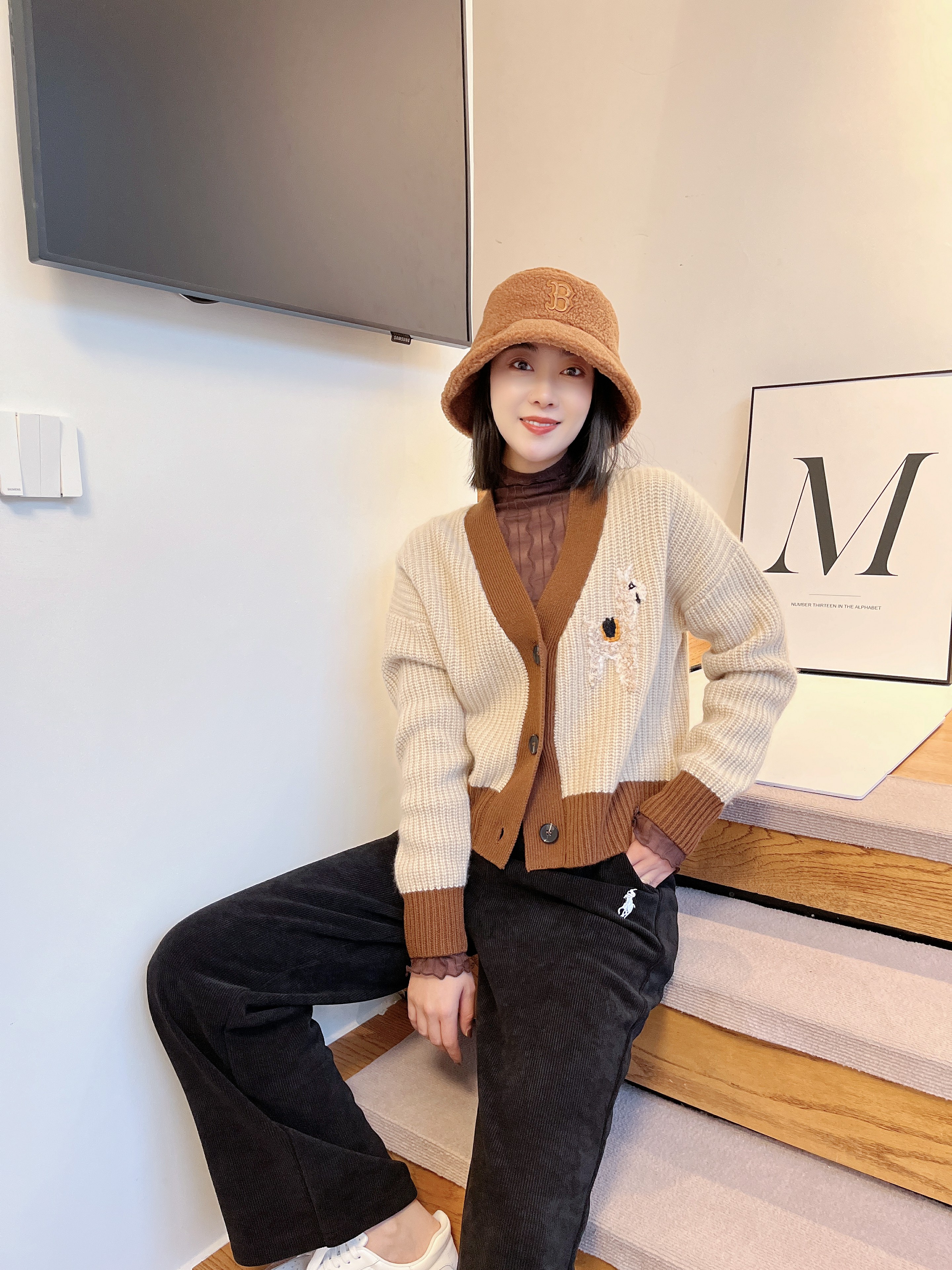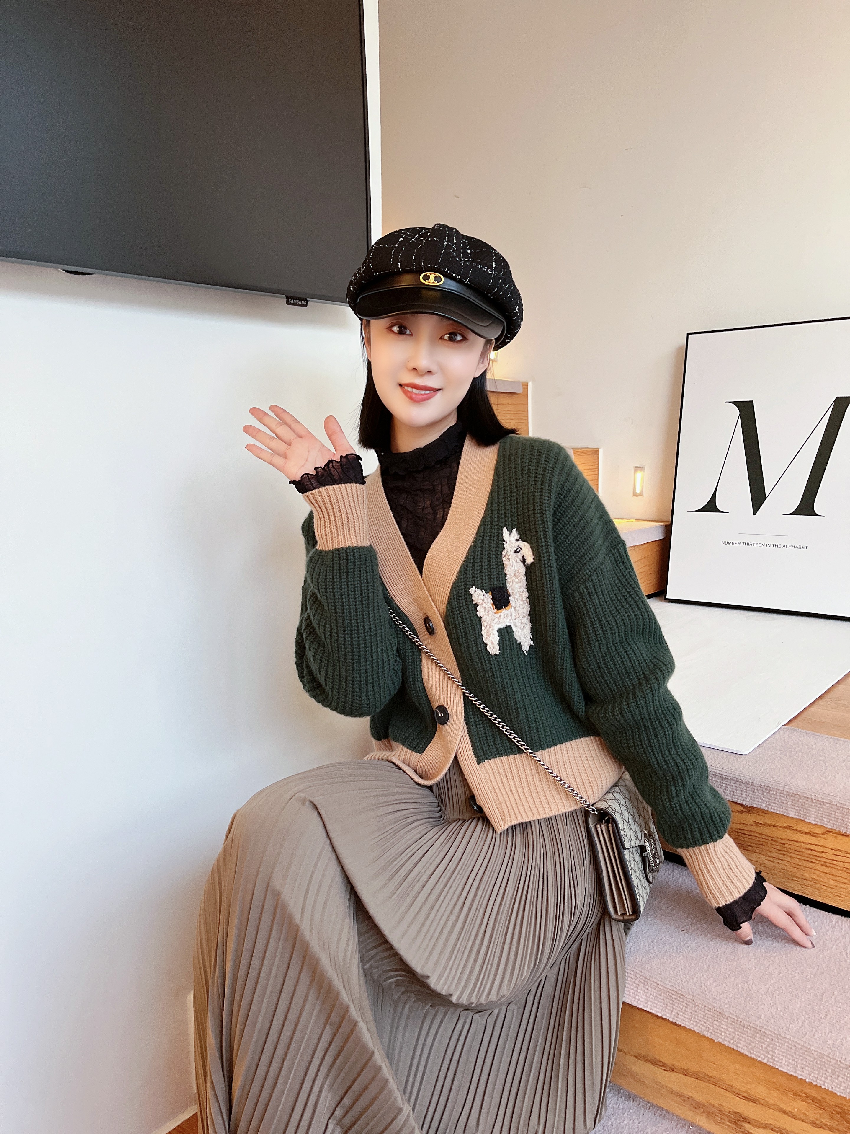 法式山羊绒慵懒风 V领单排扣胸前立体手钩卡通图案撞色毛针织衫秋