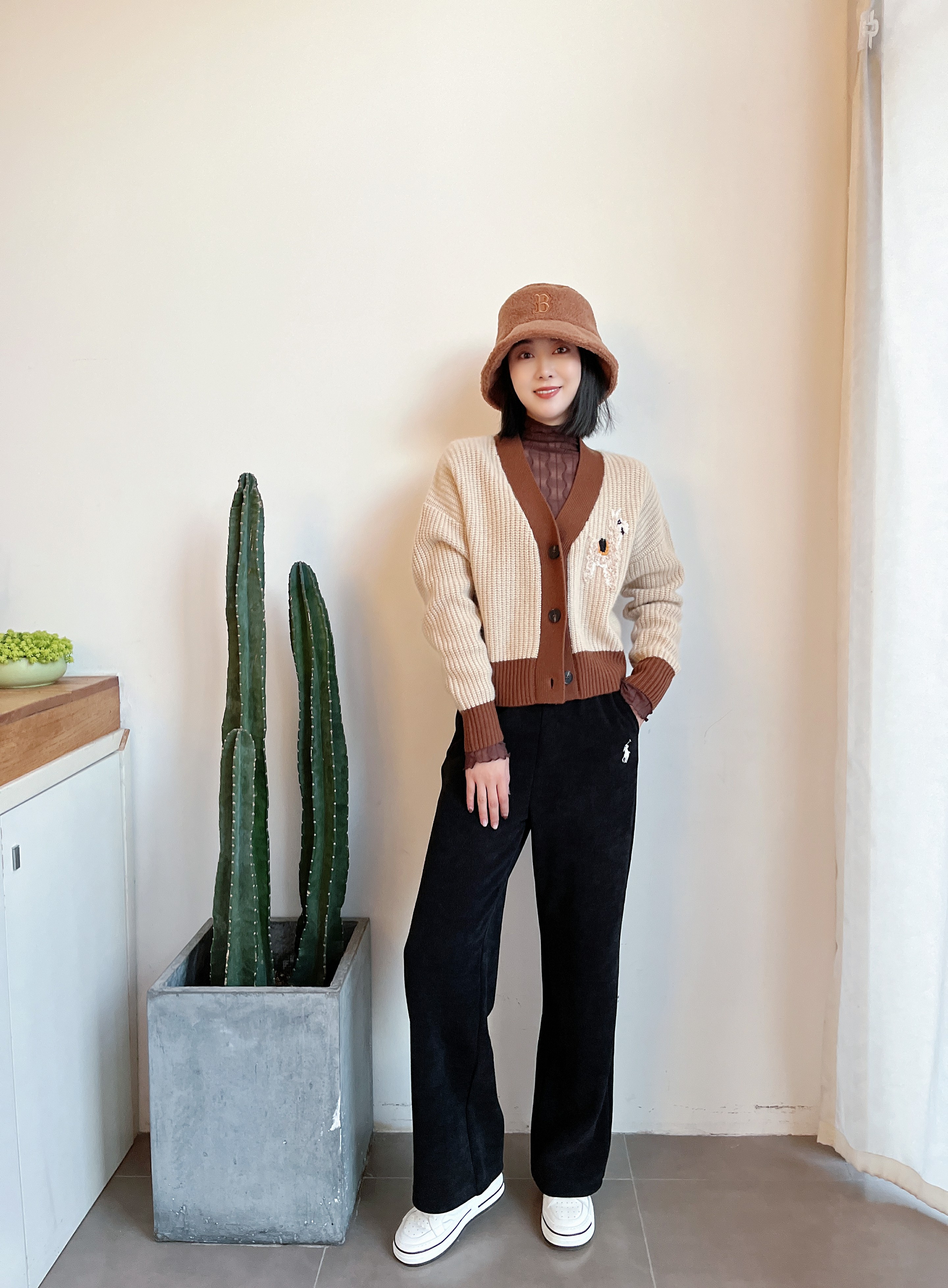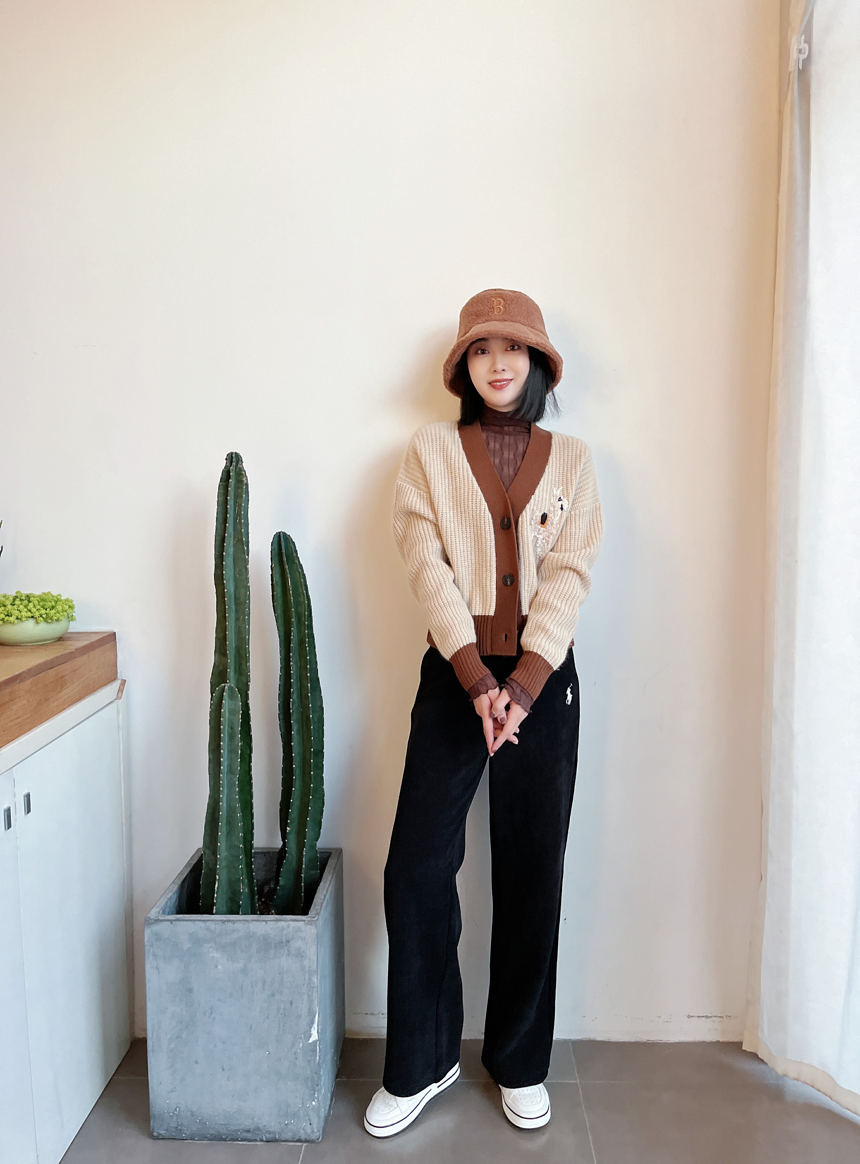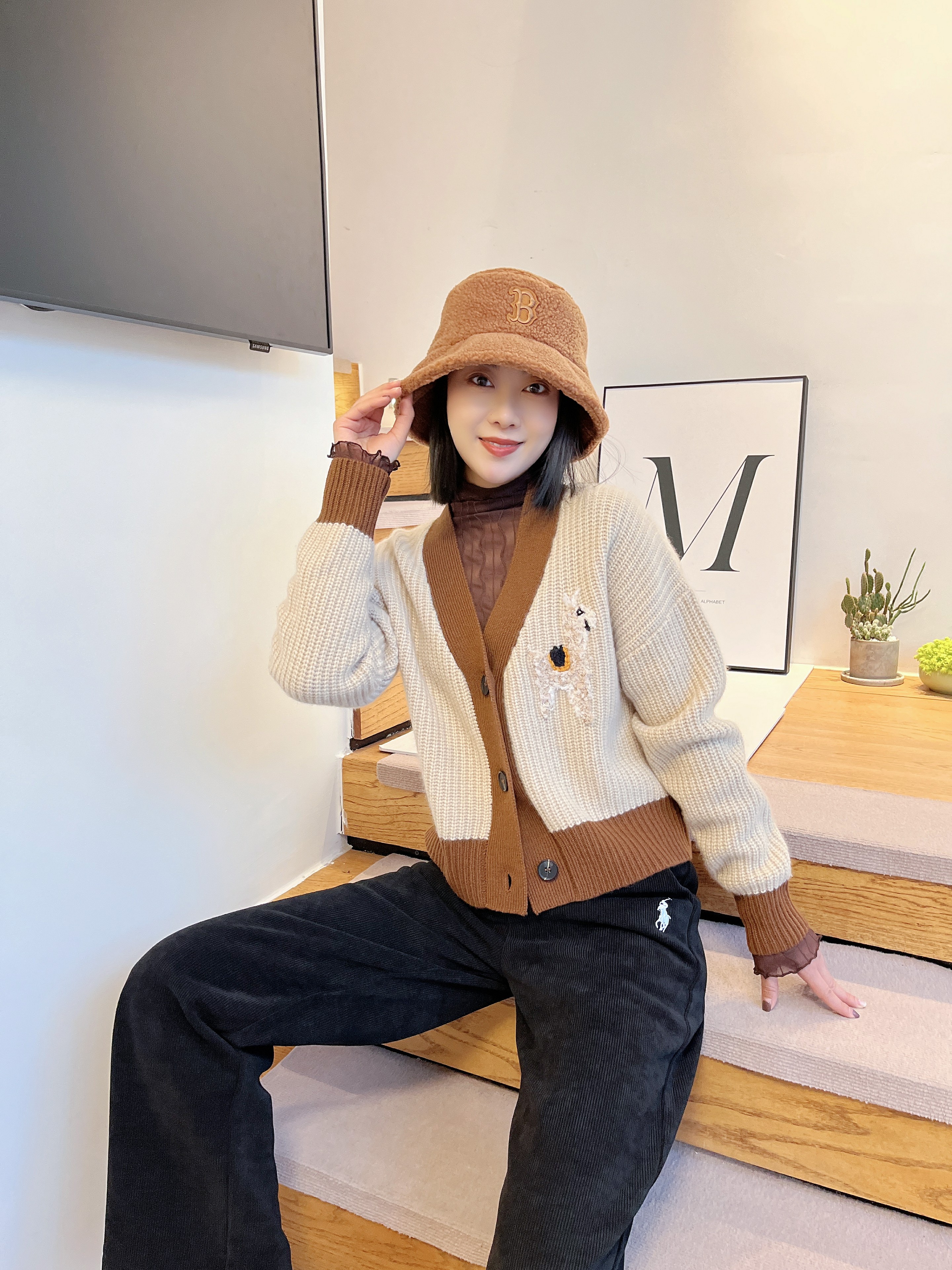 法式山羊绒慵懒风 V领单排扣胸前立体手钩卡通图案撞色毛针织衫秋