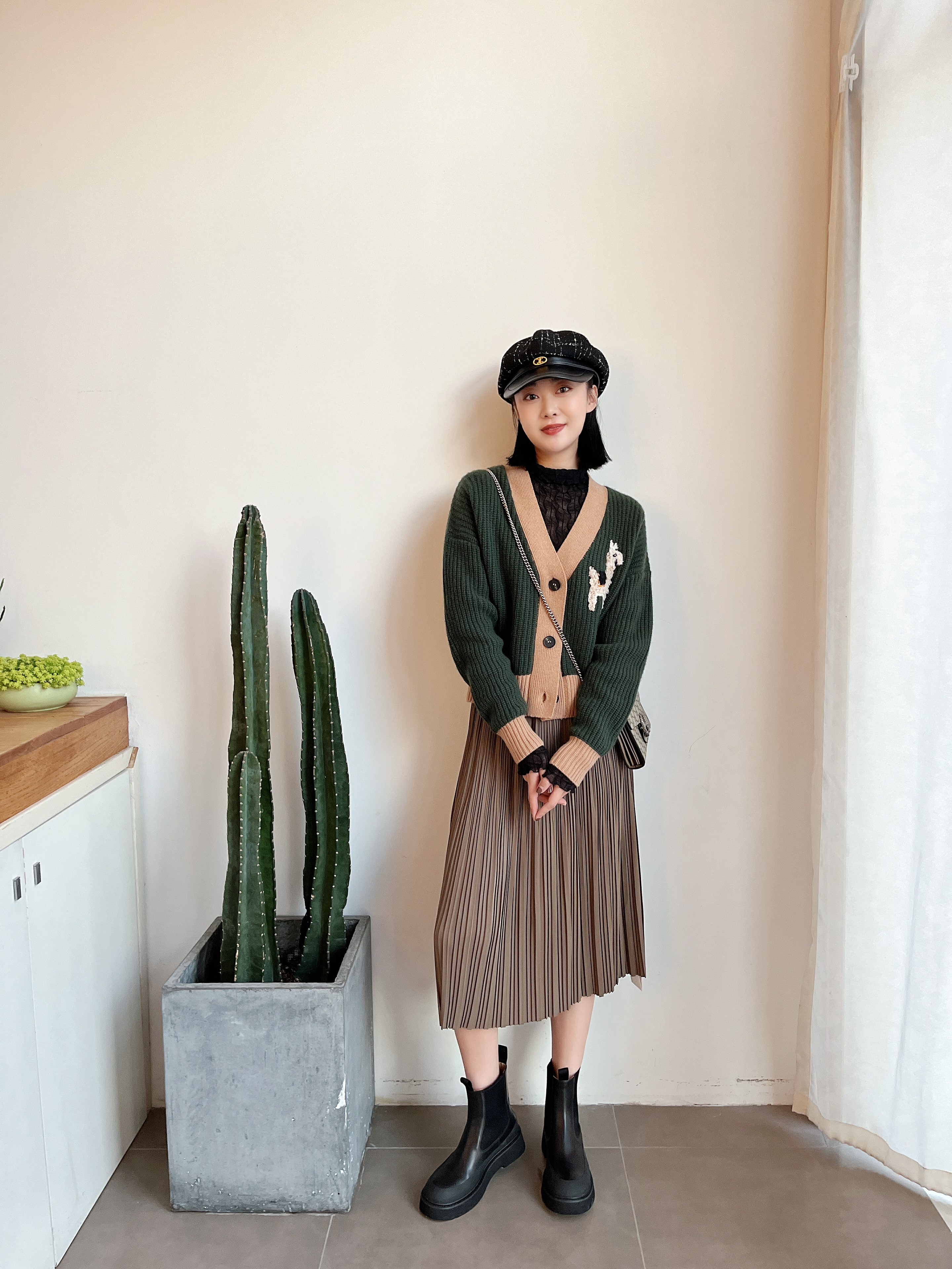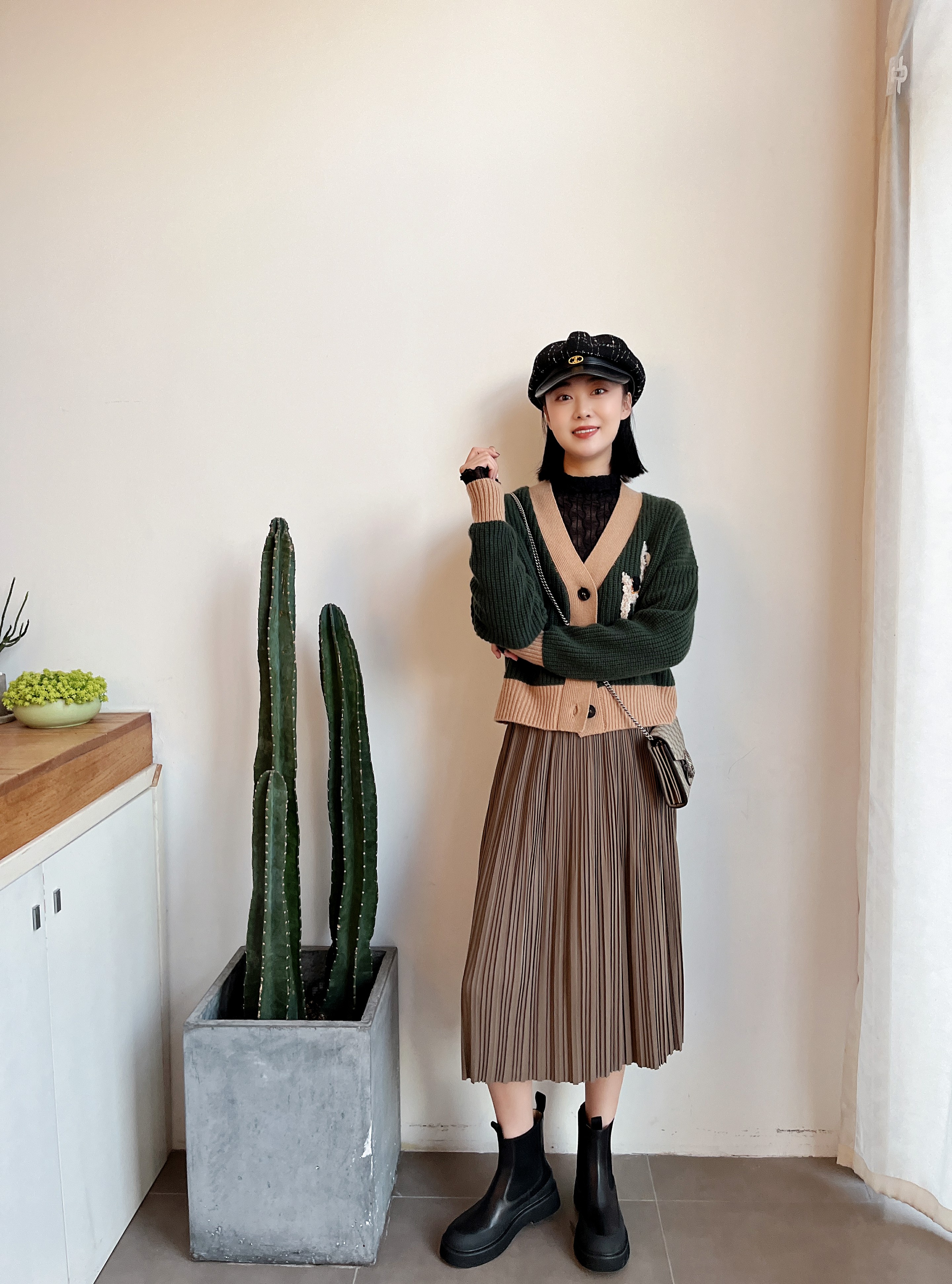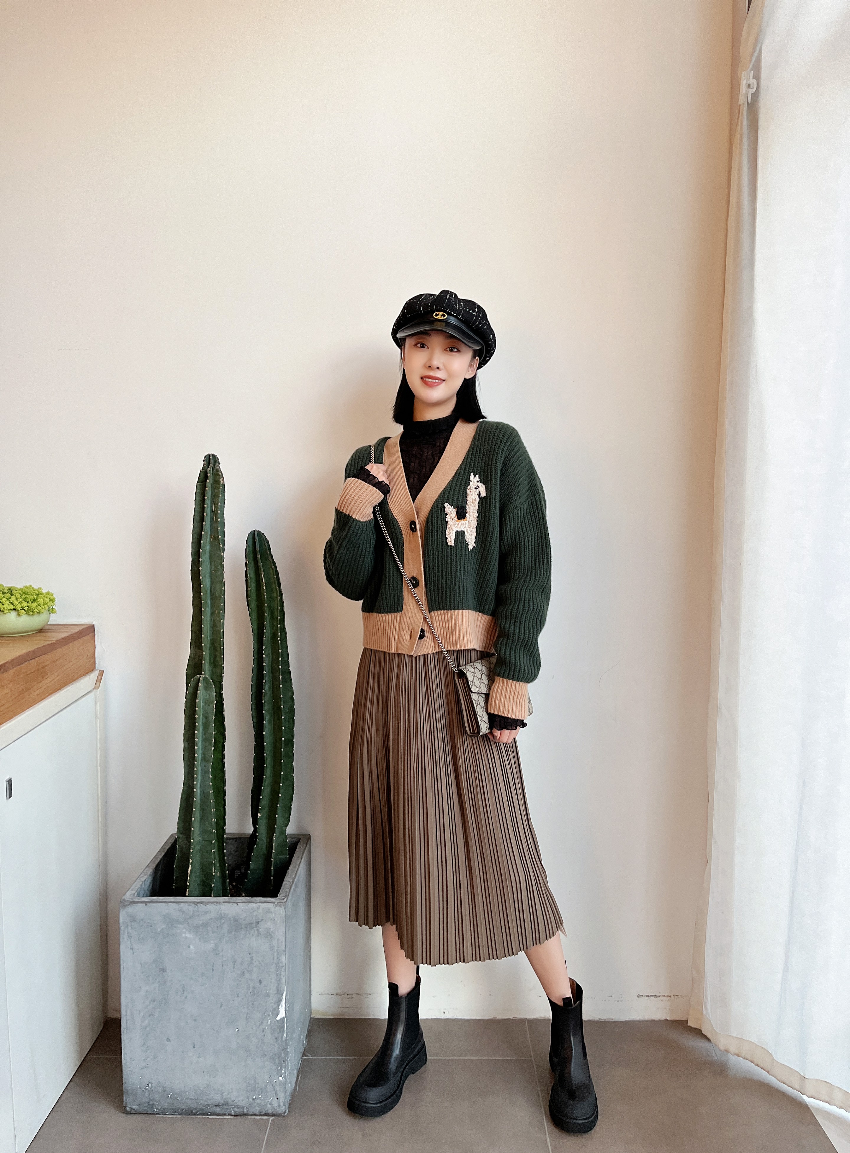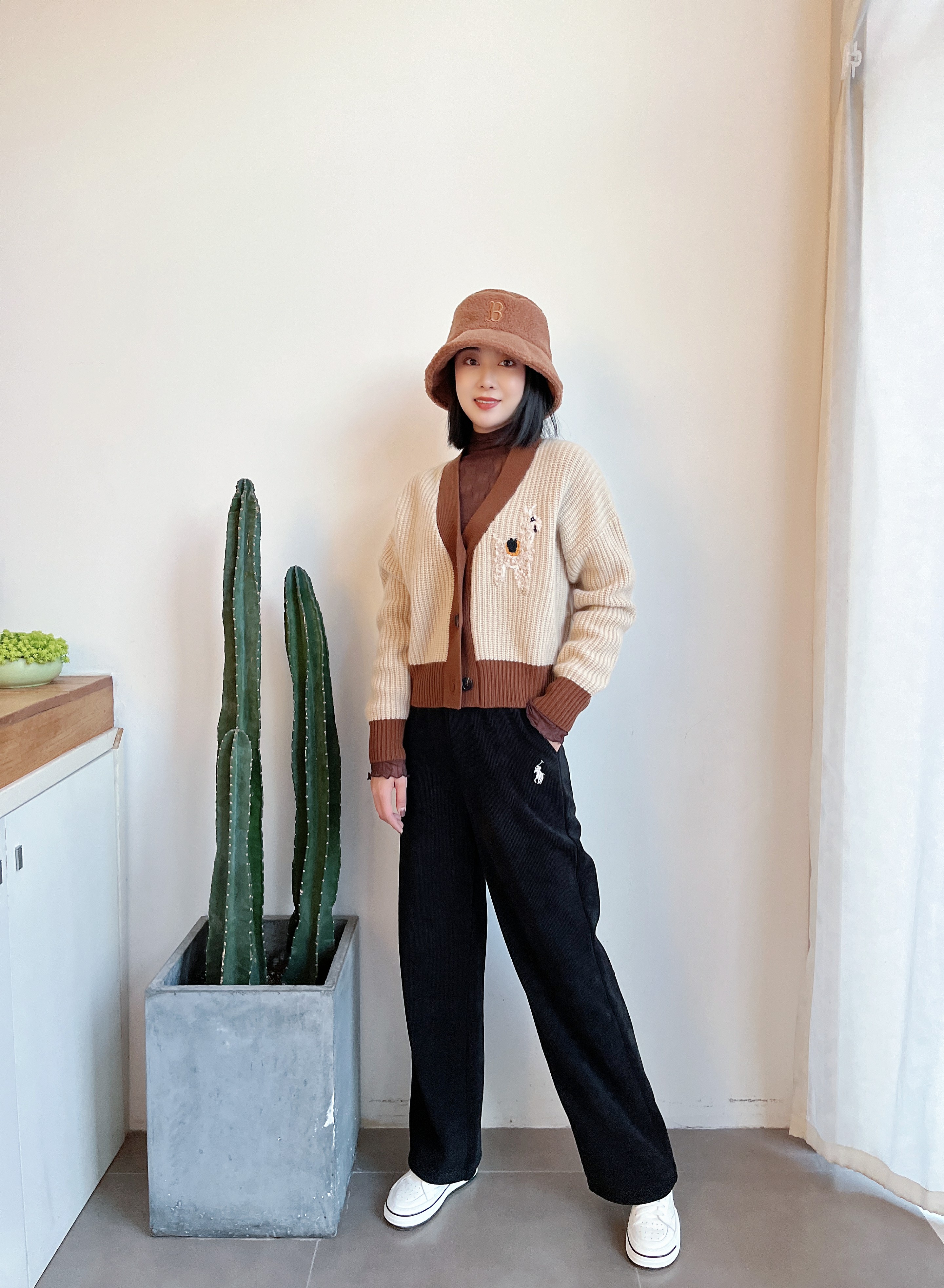 法式山羊绒慵懒风 V领单排扣胸前立体手钩卡通图案撞色毛针织衫秋