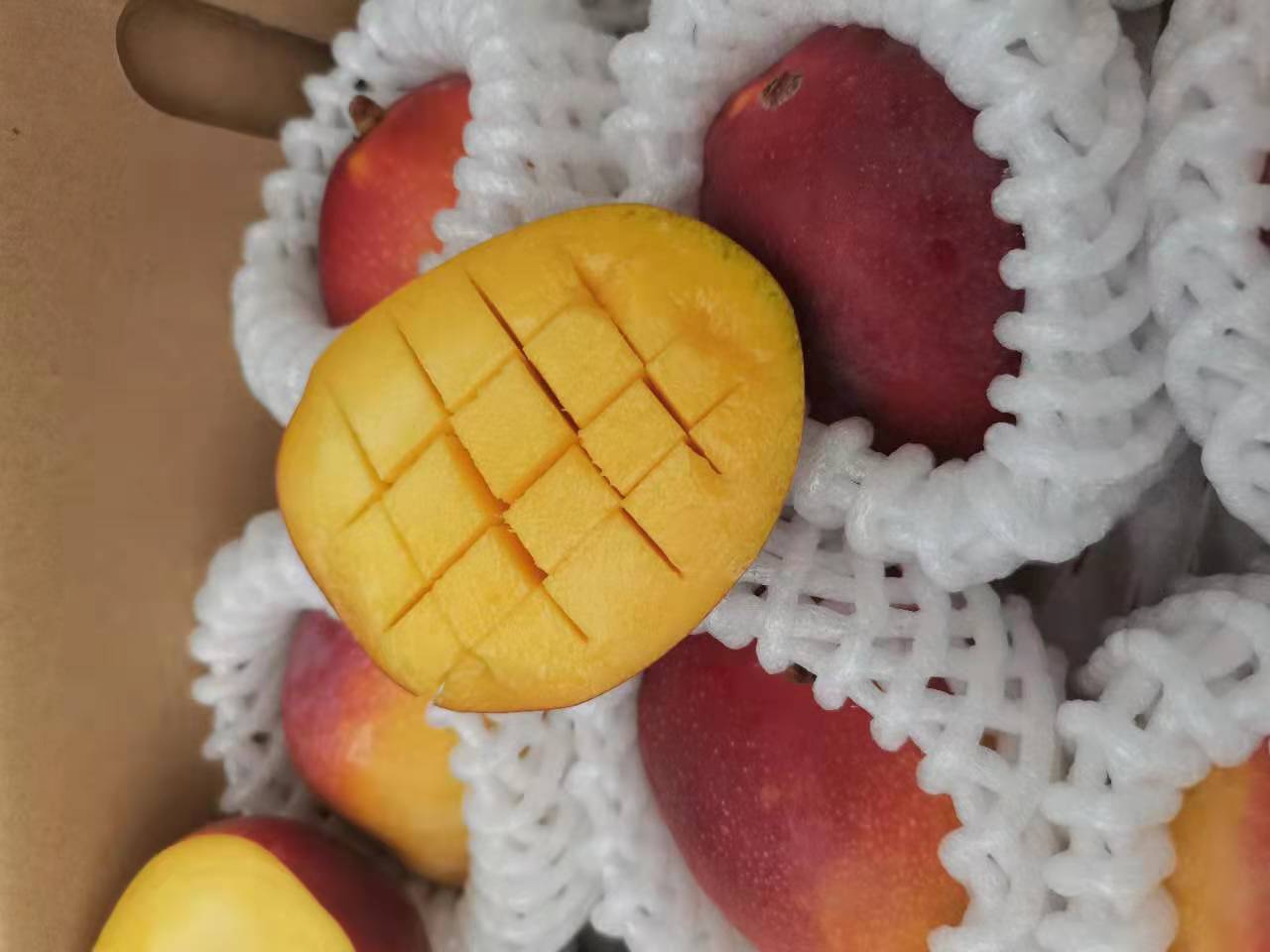 【注意事项】:珍珠芒比贵妃芒个头小,甜度比贵妃芒高,有淡淡的椰香味,容易失水,表皮会有轻微发皱,不影响果肉食用,导致越皱巴甜度越高