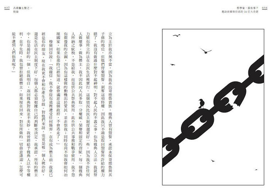 本書以哲學巨擘蘇格拉底為中心點,用輕鬆易懂的語言紀錄他和其之前的十六位古希臘哲學家的思考與軼事,搭配充滿寓意的插畫,精確地詮釋哲學家充滿智慧與詼諧的處世態度。