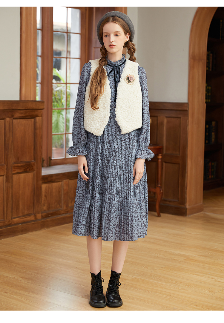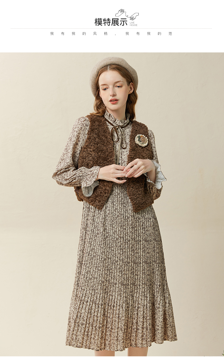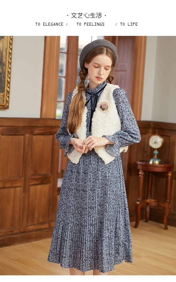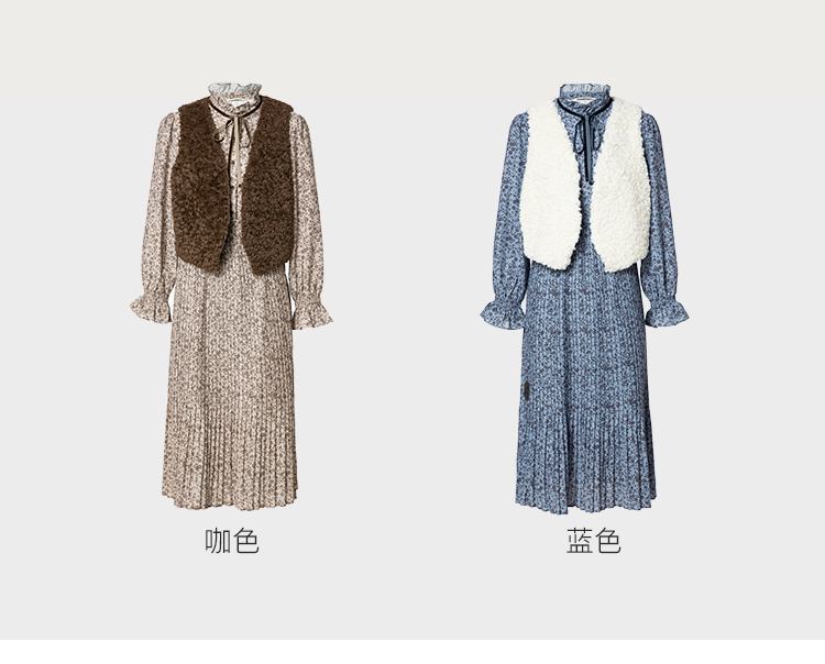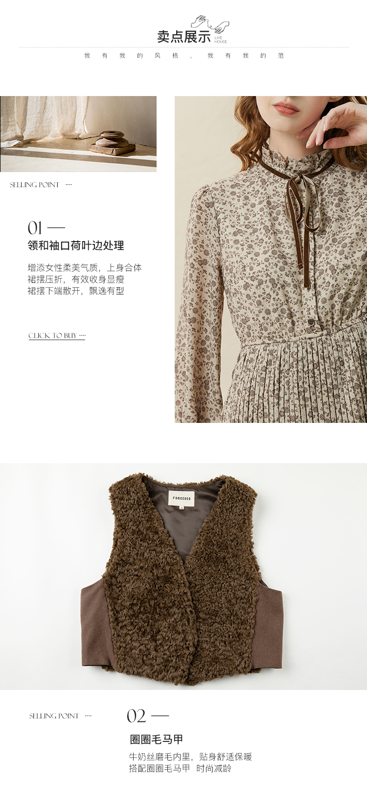 Famecoco范可儿圈圈毛马甲配连衣裙两件套印花雪纺裙套装F228EA002