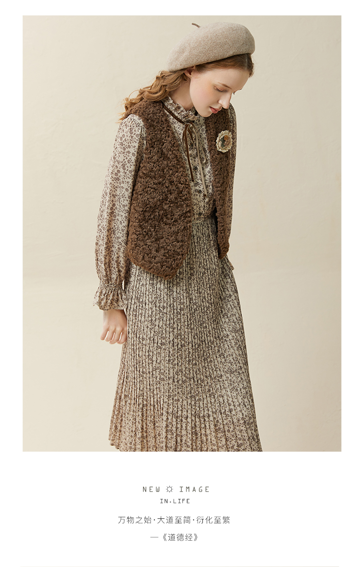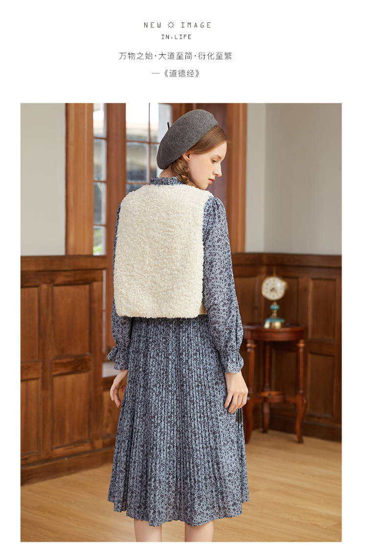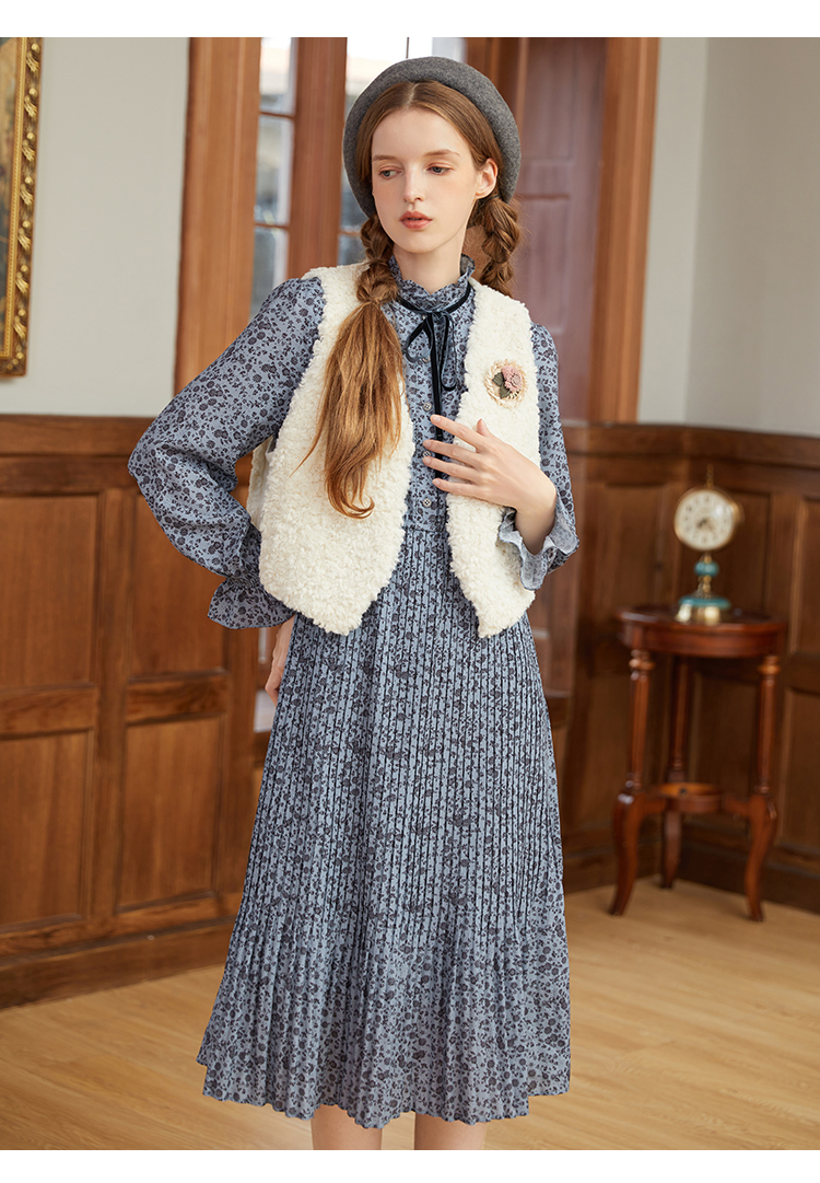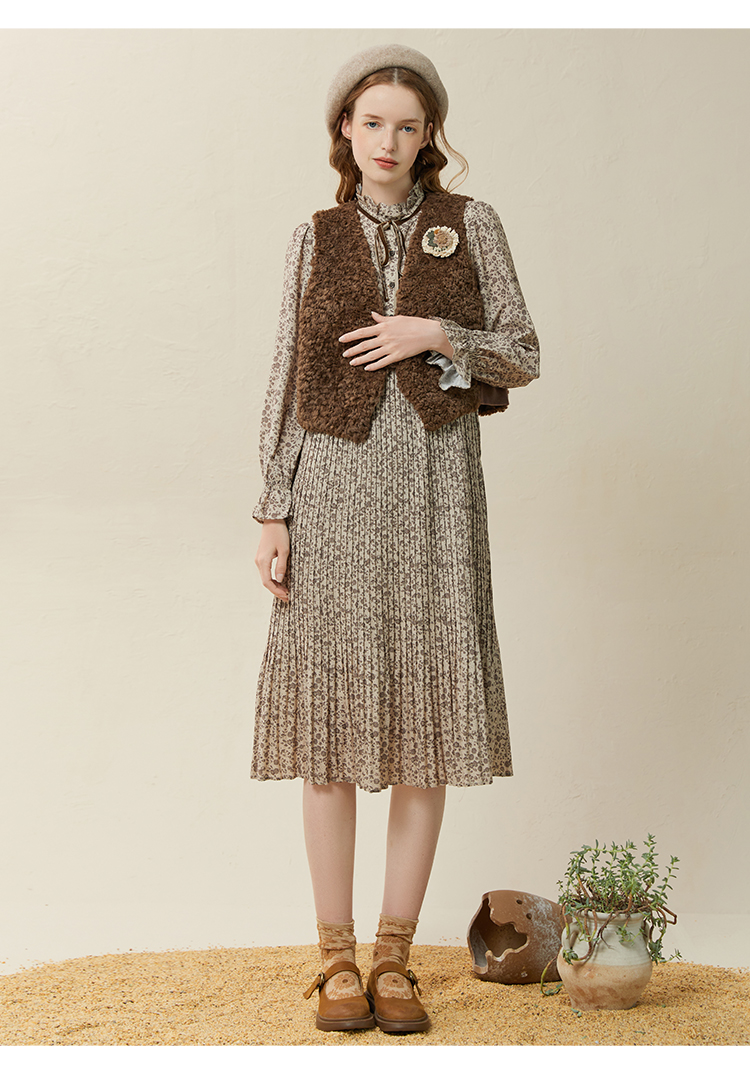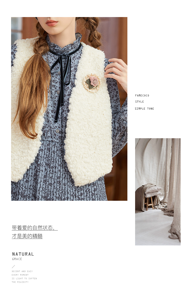 Famecoco范可儿圈圈毛马甲配连衣裙两件套印花雪纺裙套装F228EA002