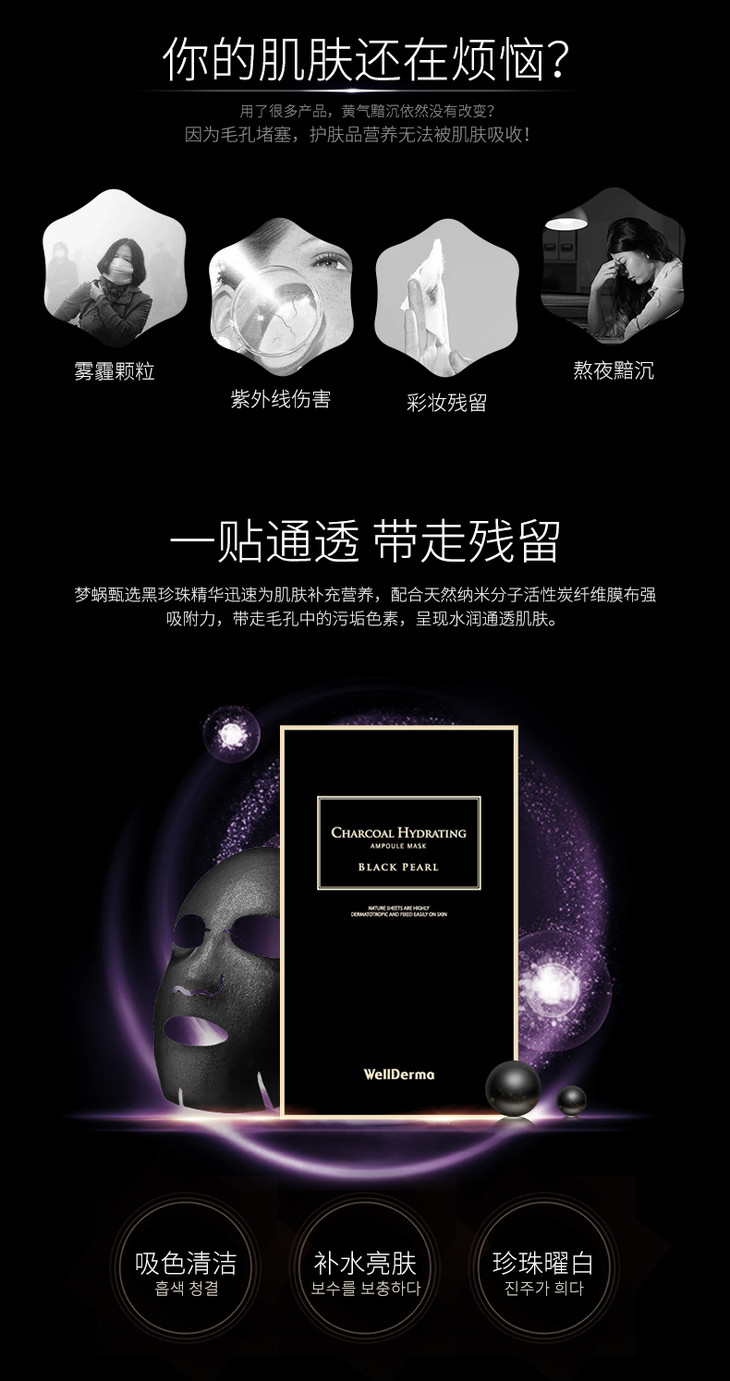 WellDerma梦蜗黑炭黑珍珠吸色深层清洁面膜补水保湿10片8809502181468