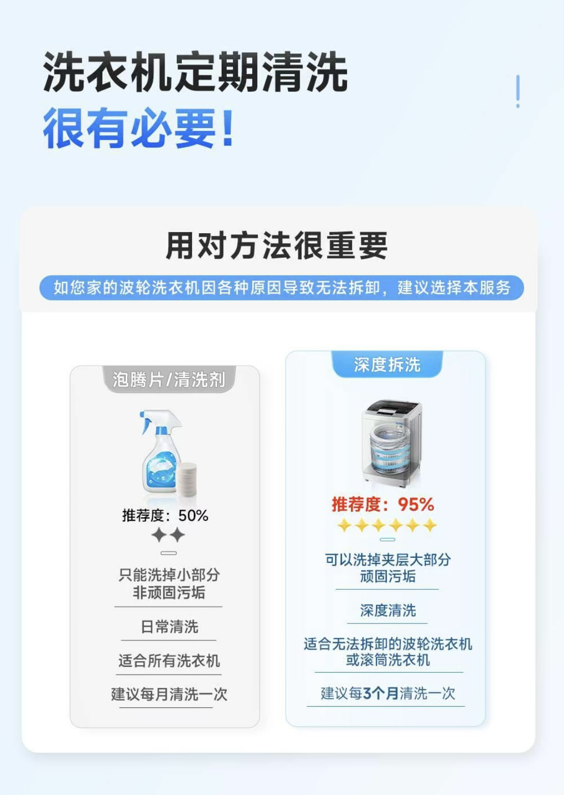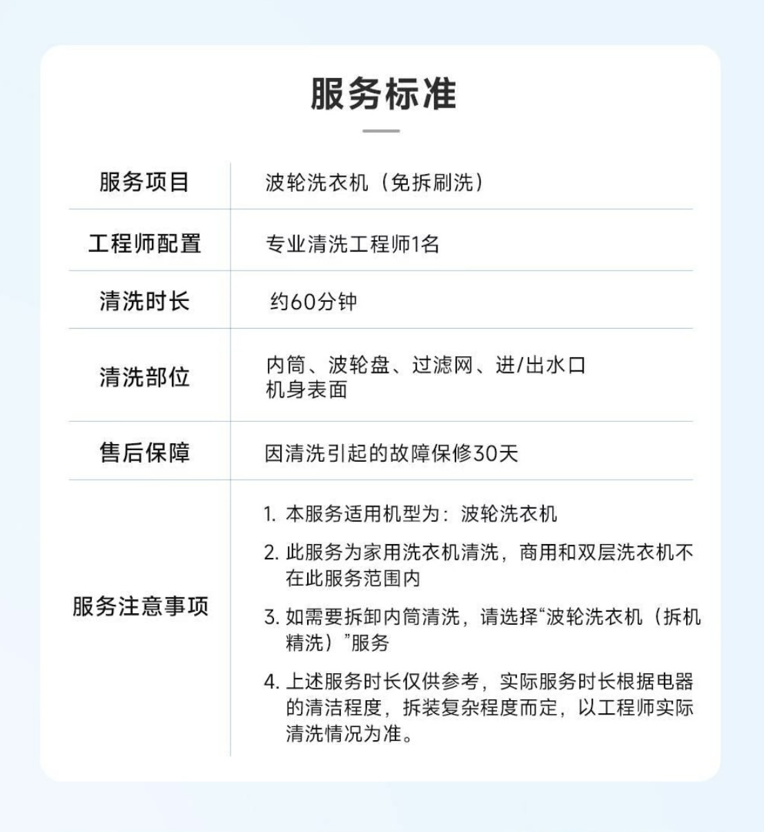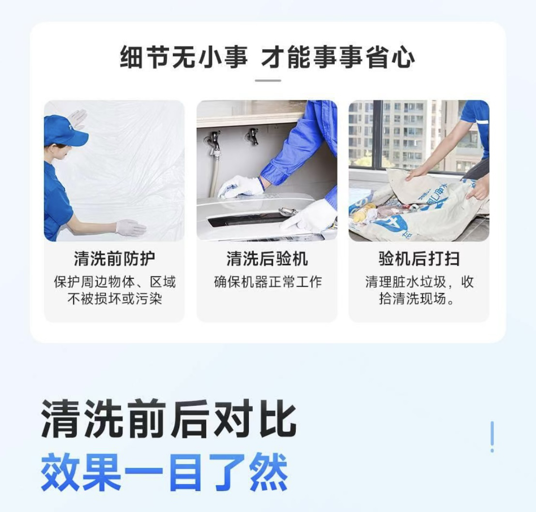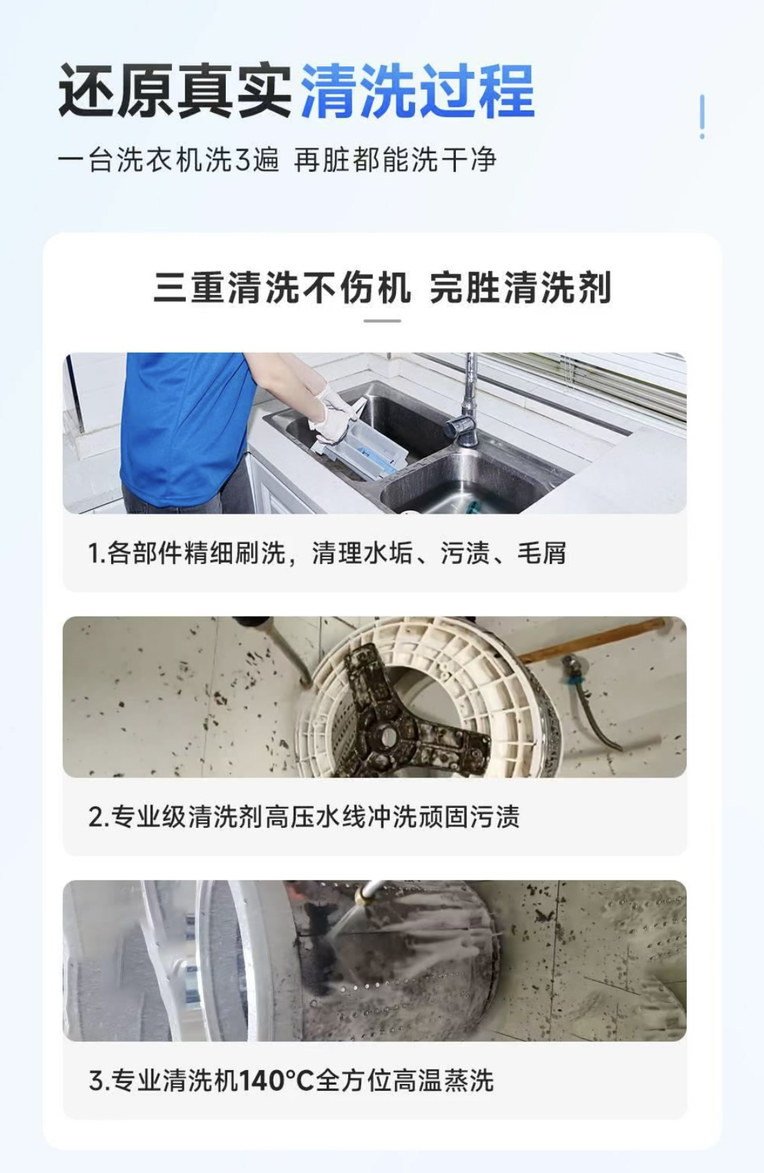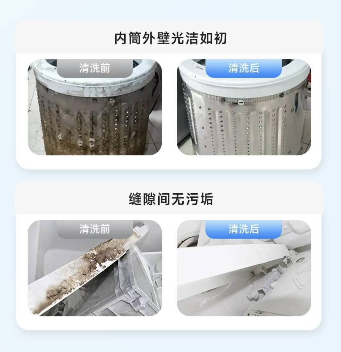 清洁内容:外表面、内筒、内筒夹层、过滤器、谷封圈、进出水管、洗涤剂盒、排污口