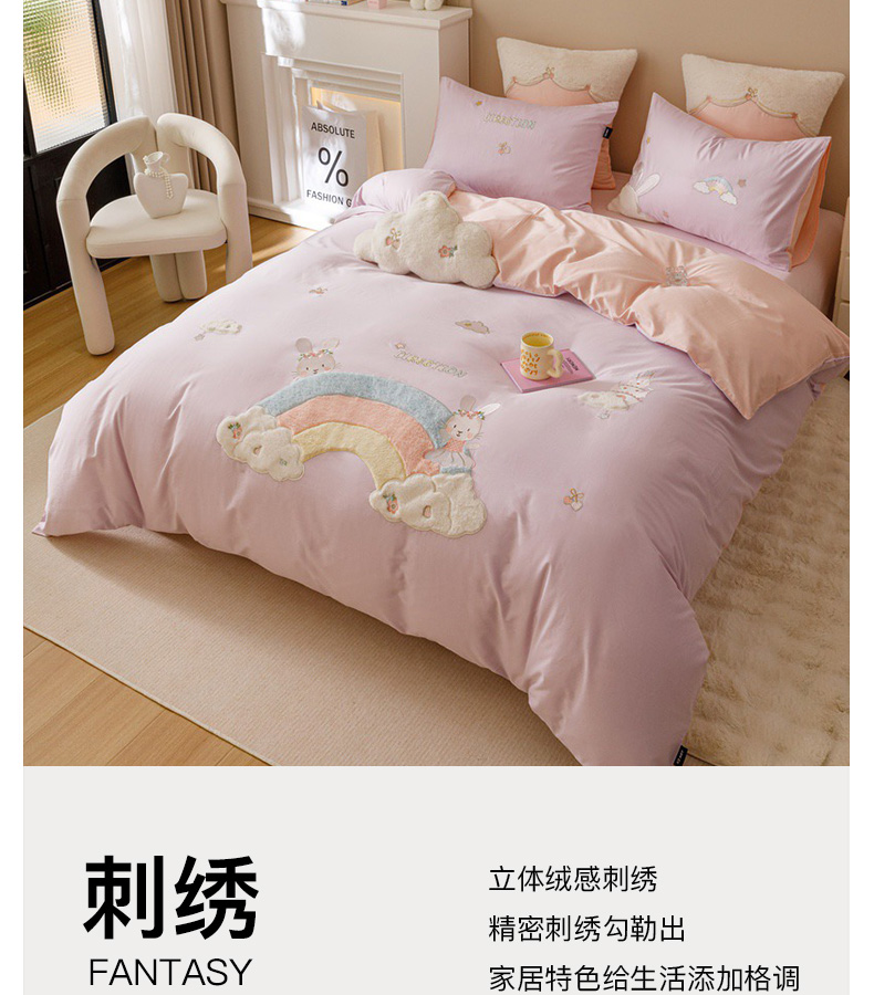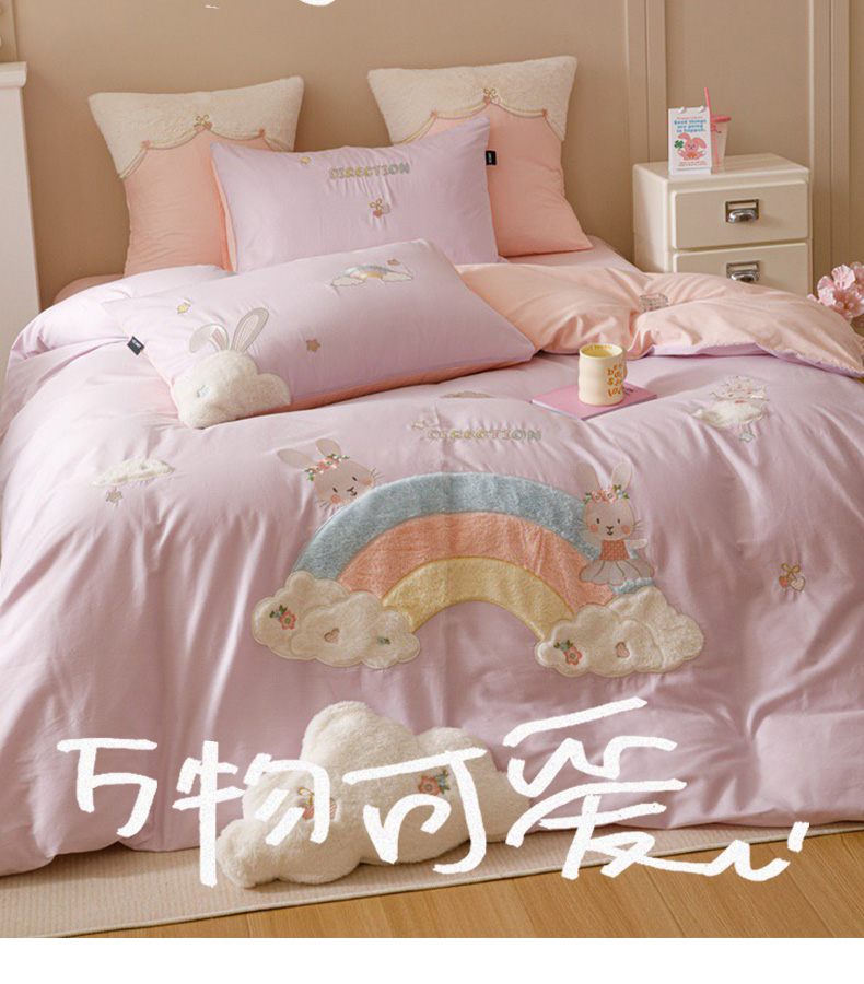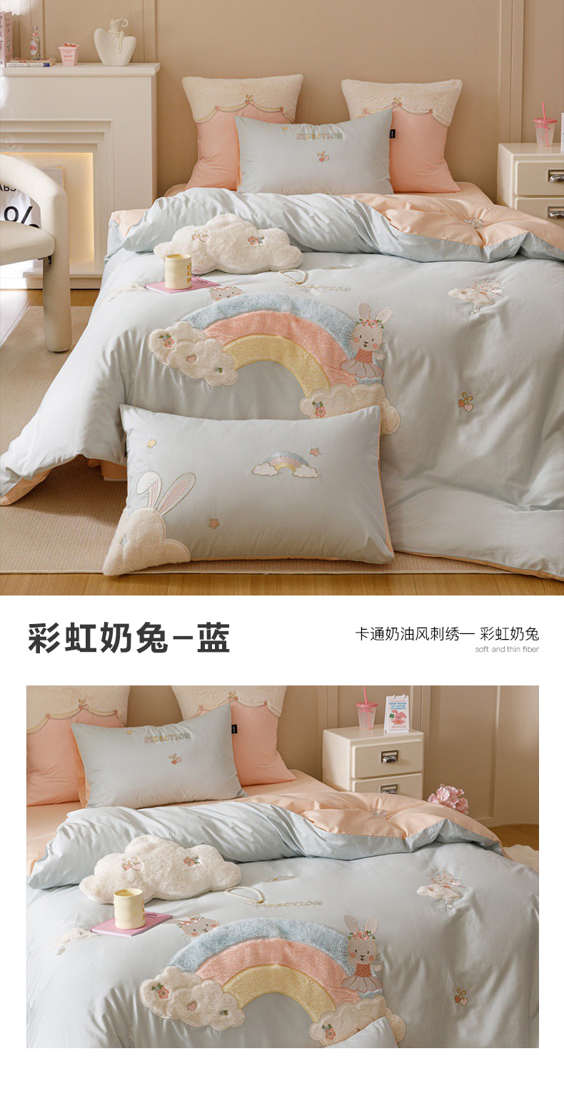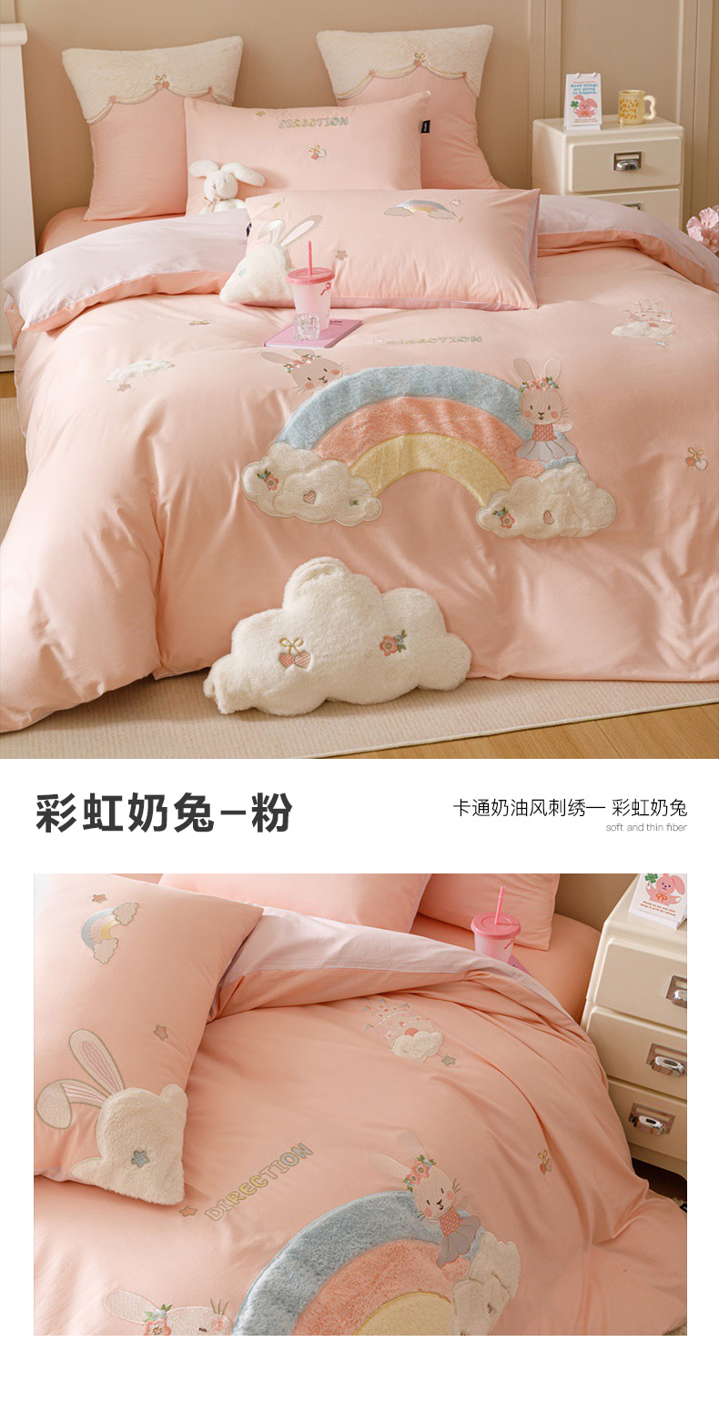 全棉卡通奶油风刺绣彩虹奶兔四件套 四季可用纯棉马卡龙套件