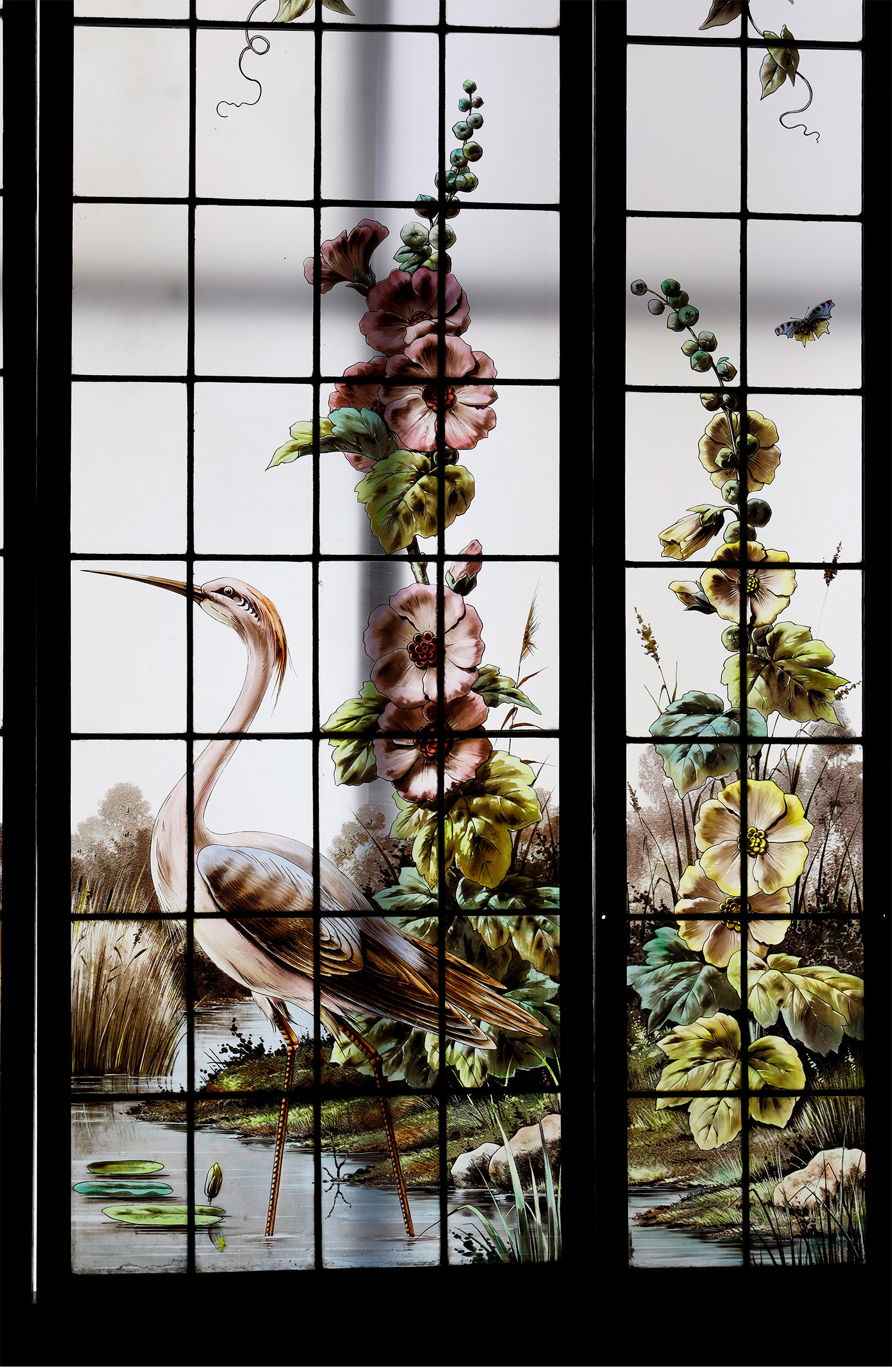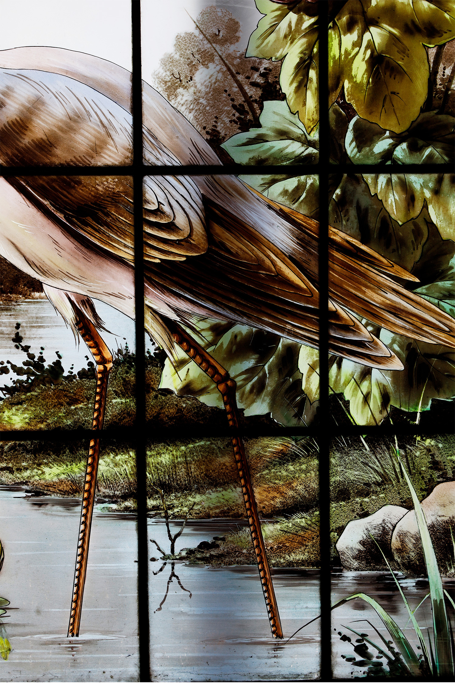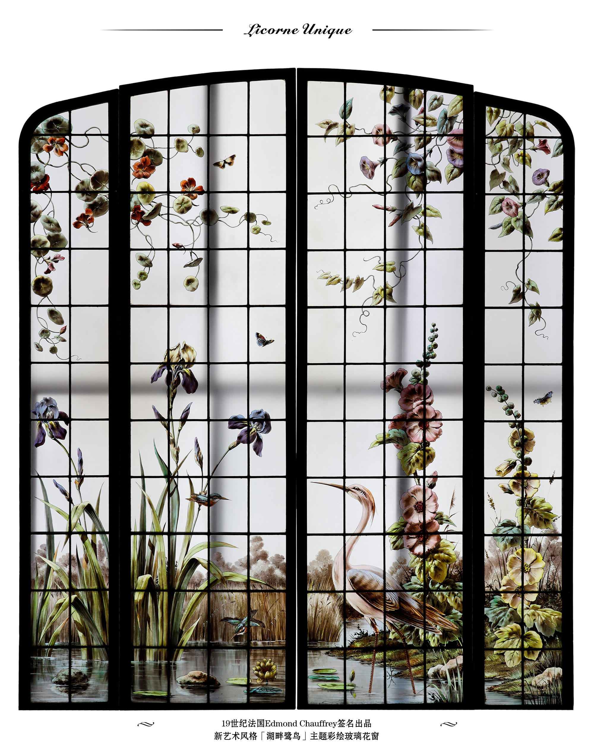 19世纪法国出品新艺术风格「湖畔鹭鸟」主题彩绘玻璃花窗