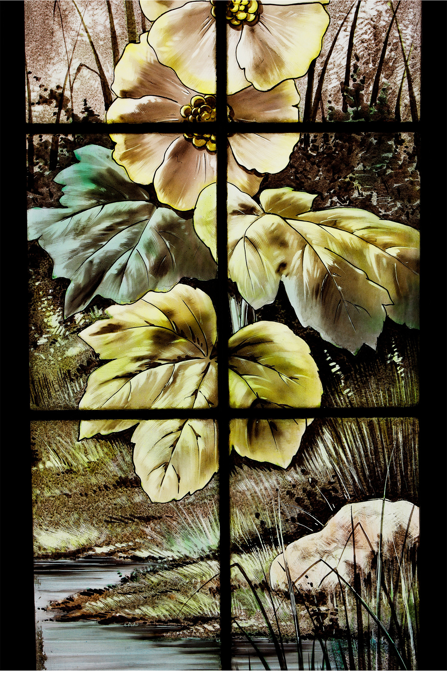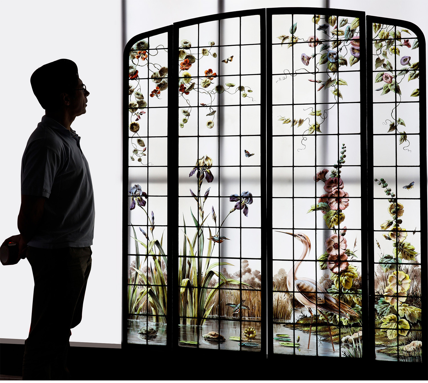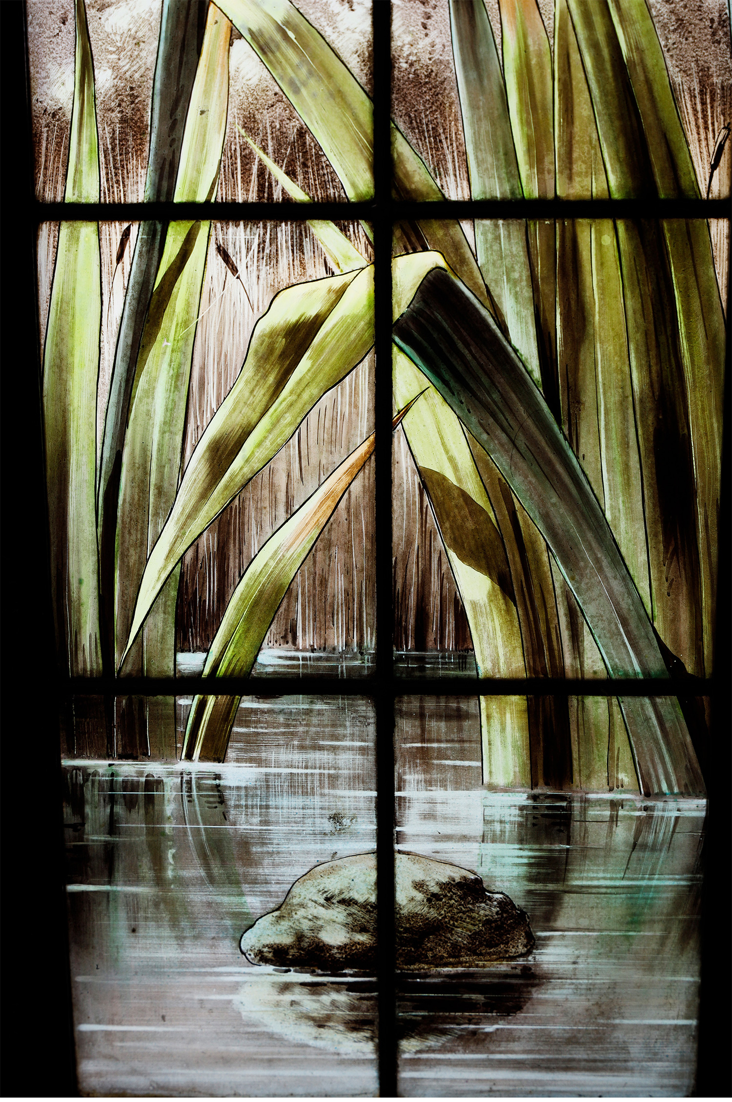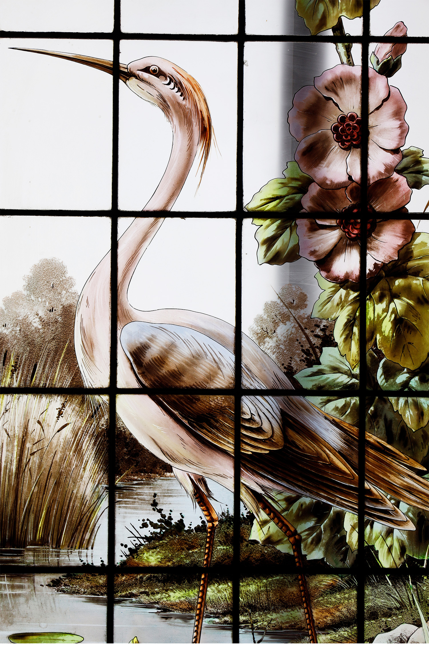 19世纪法国出品新艺术风格「湖畔鹭鸟」主题彩绘玻璃花窗