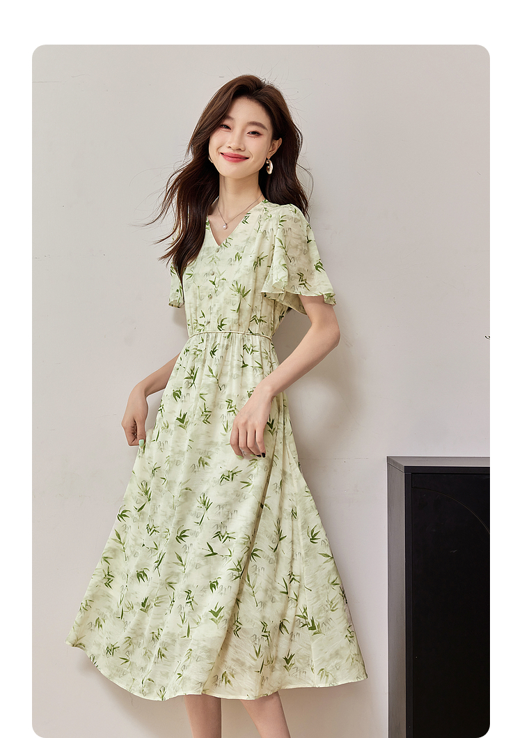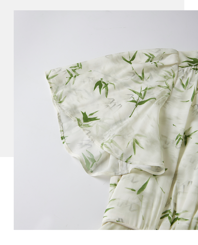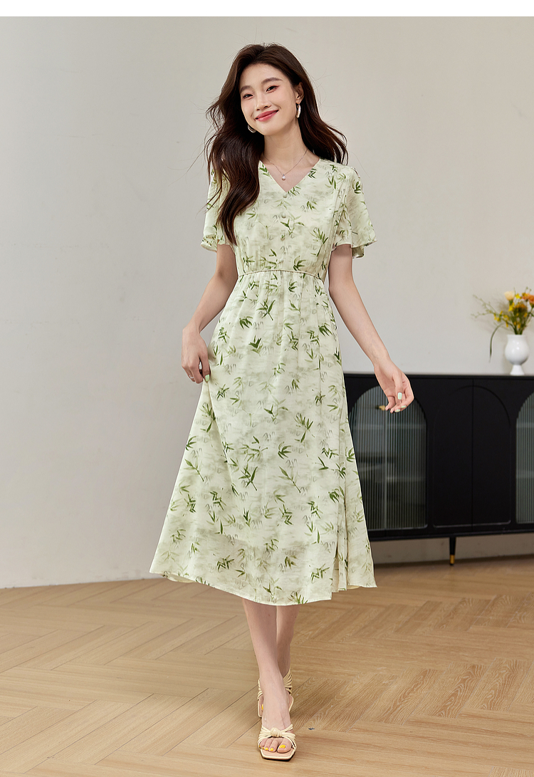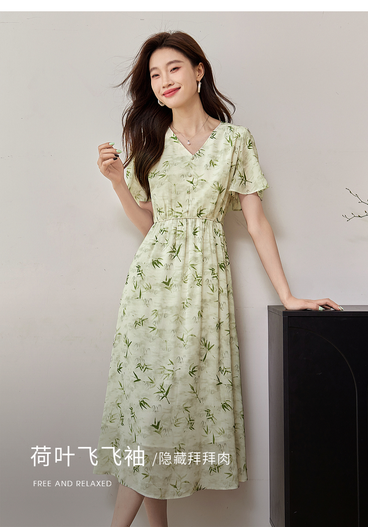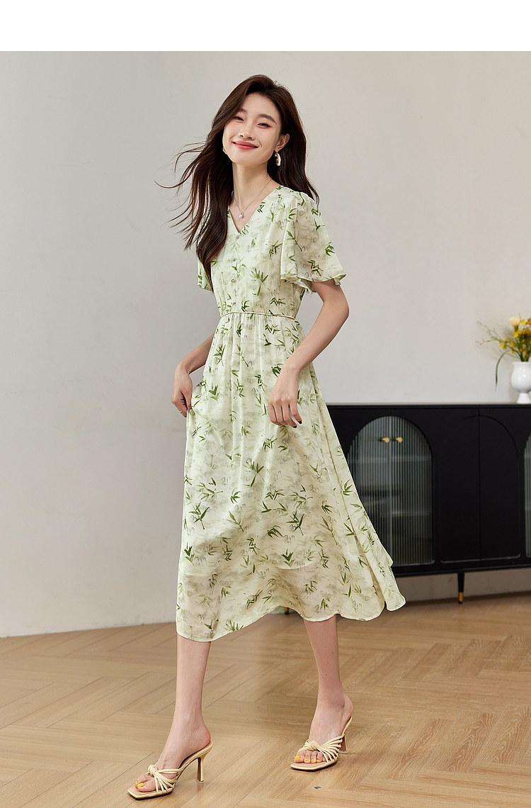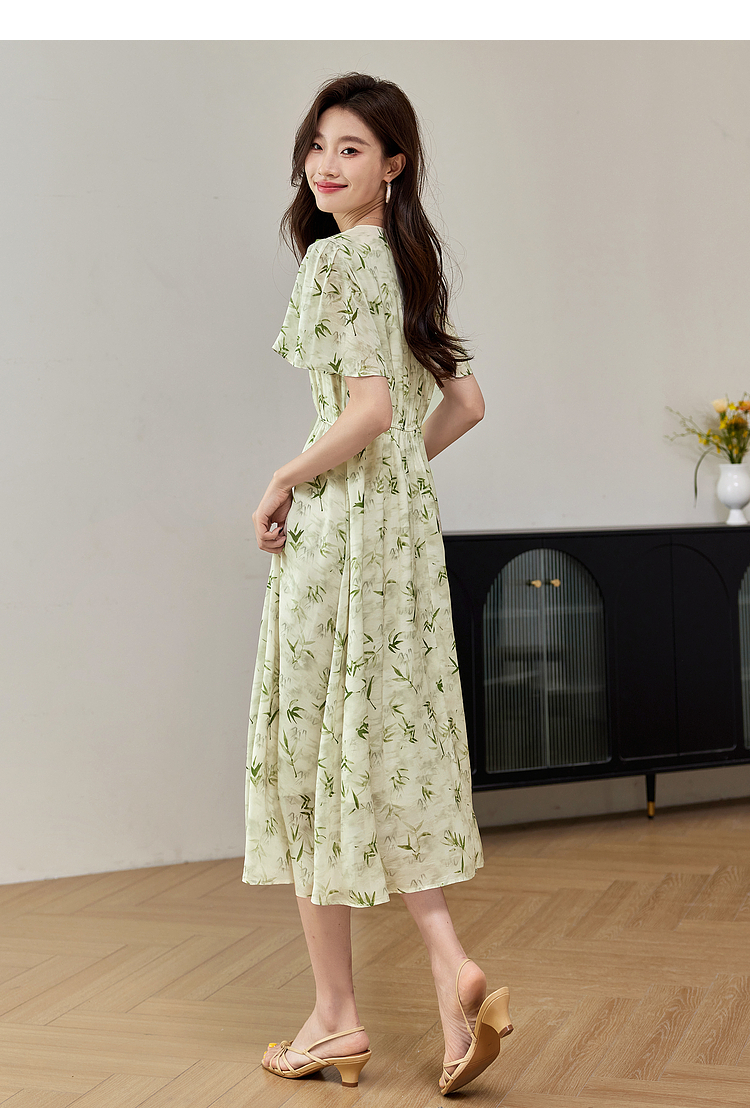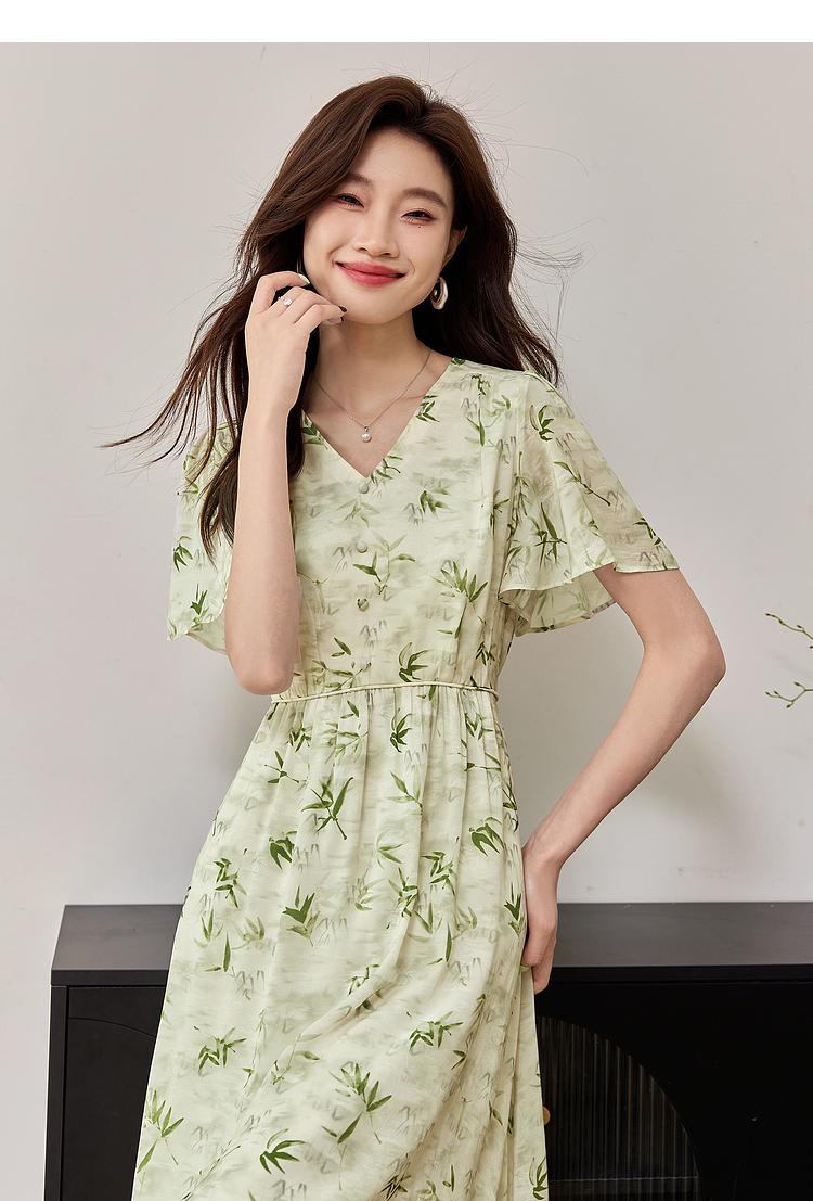 【专属特价】熙世界夏季国风水墨青竹印花连衣裙收腰显瘦荷叶袖V领雪纺裙子