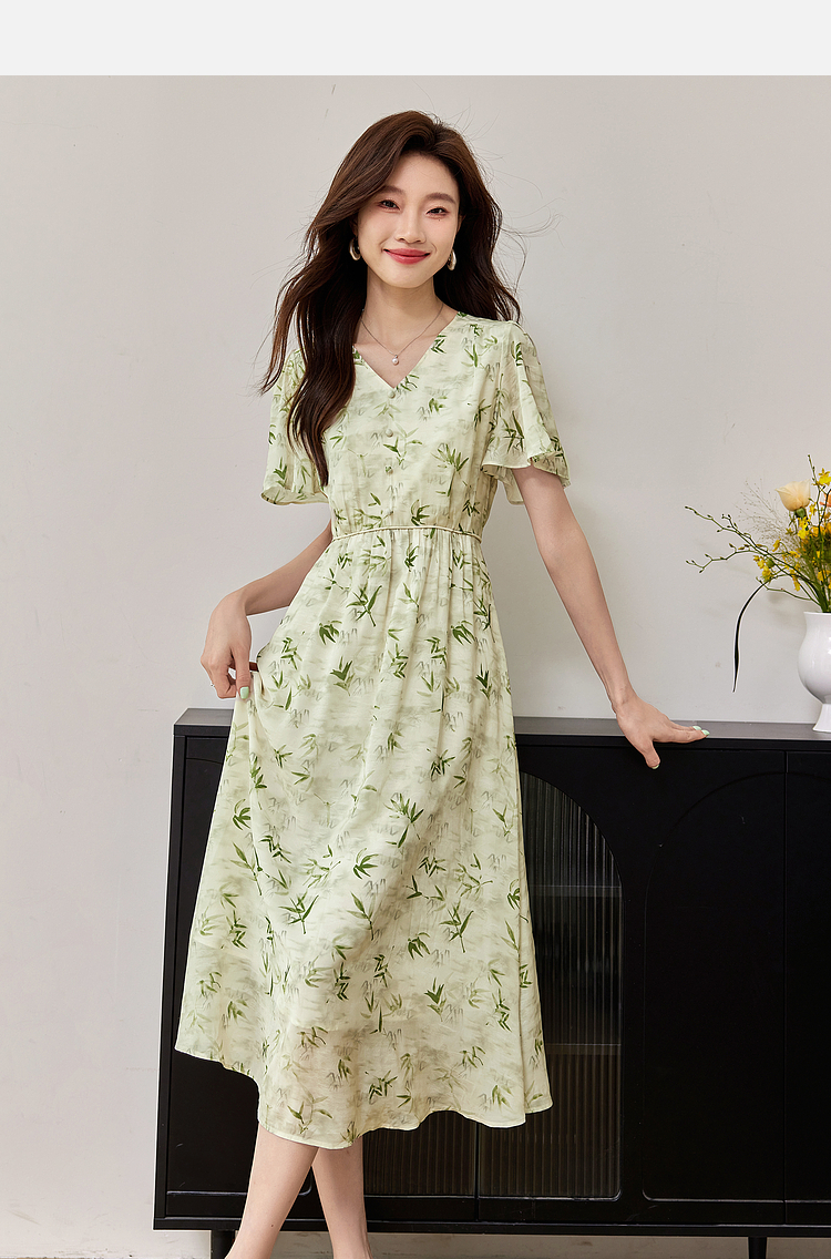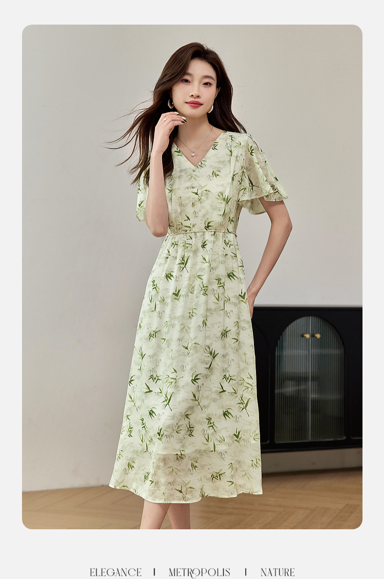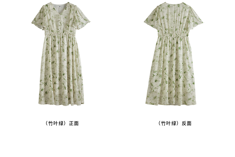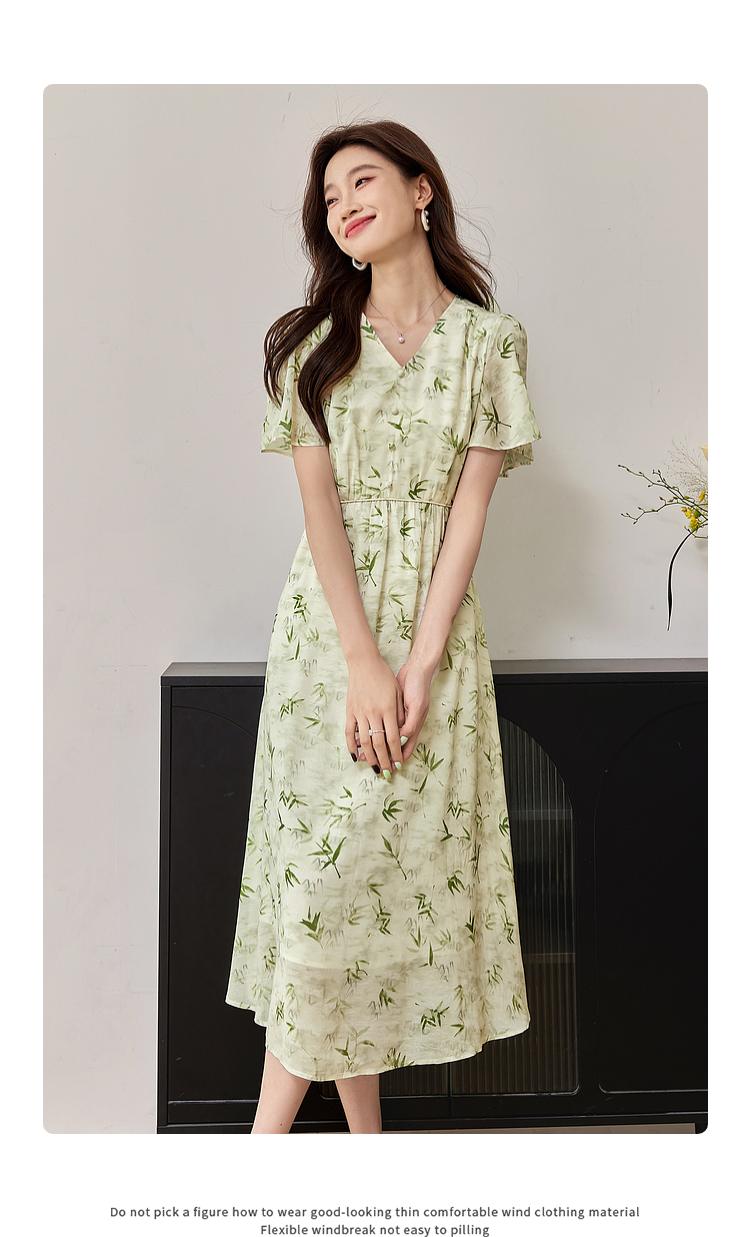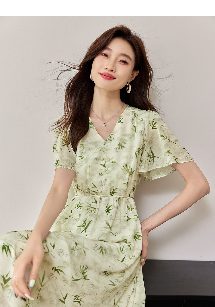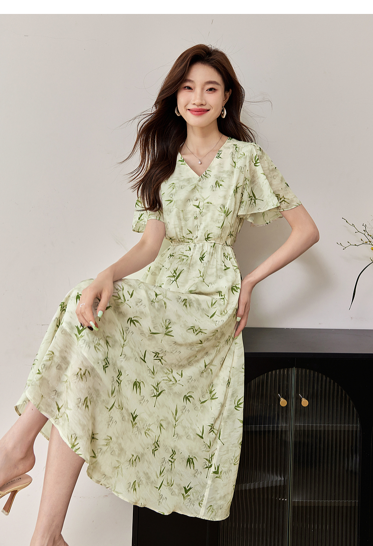 【专属特价】熙世界夏季国风水墨青竹印花连衣裙收腰显瘦荷叶袖V领雪纺裙子