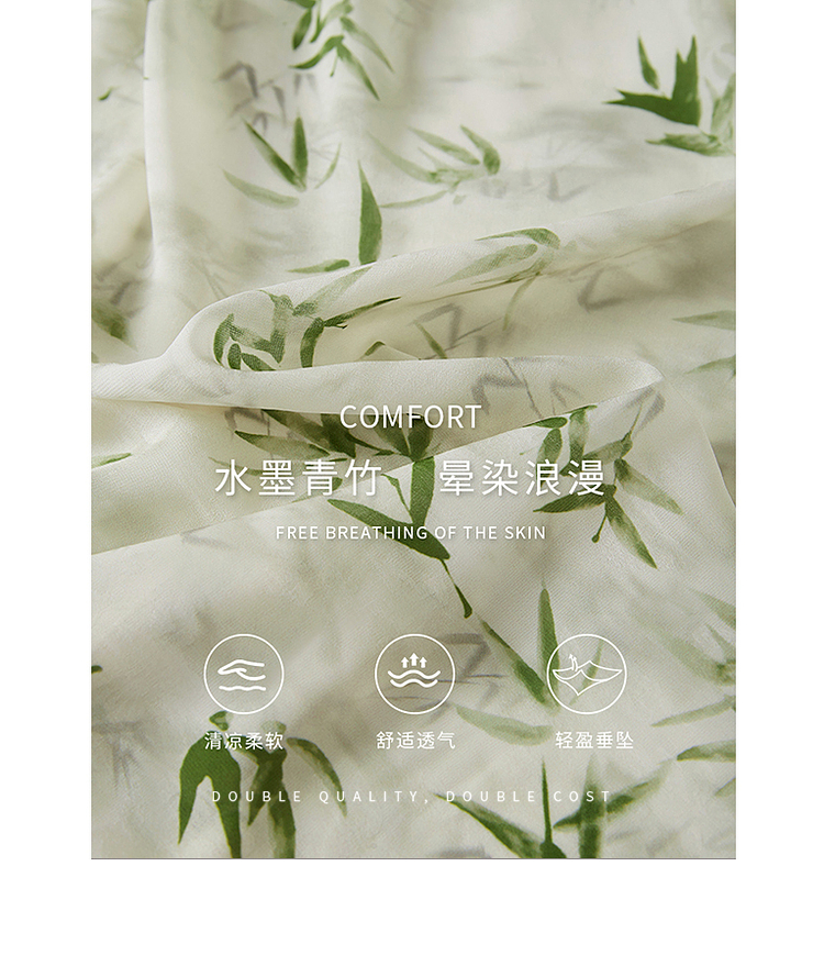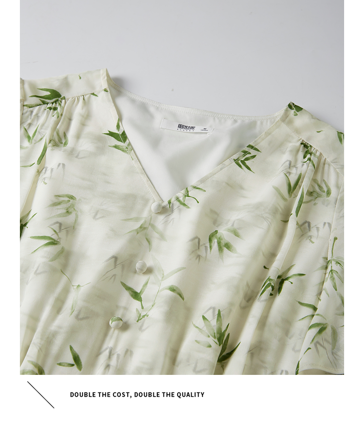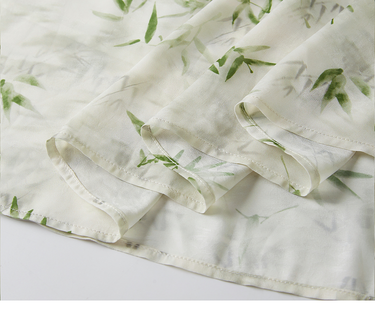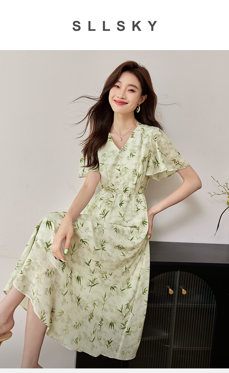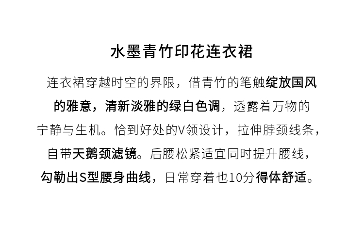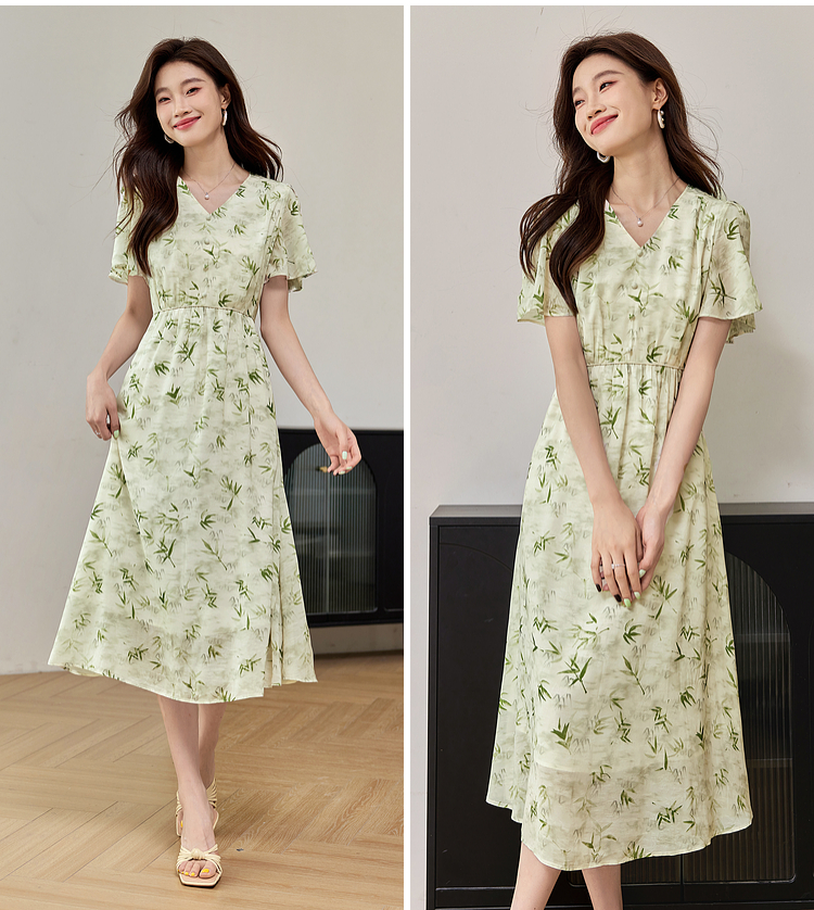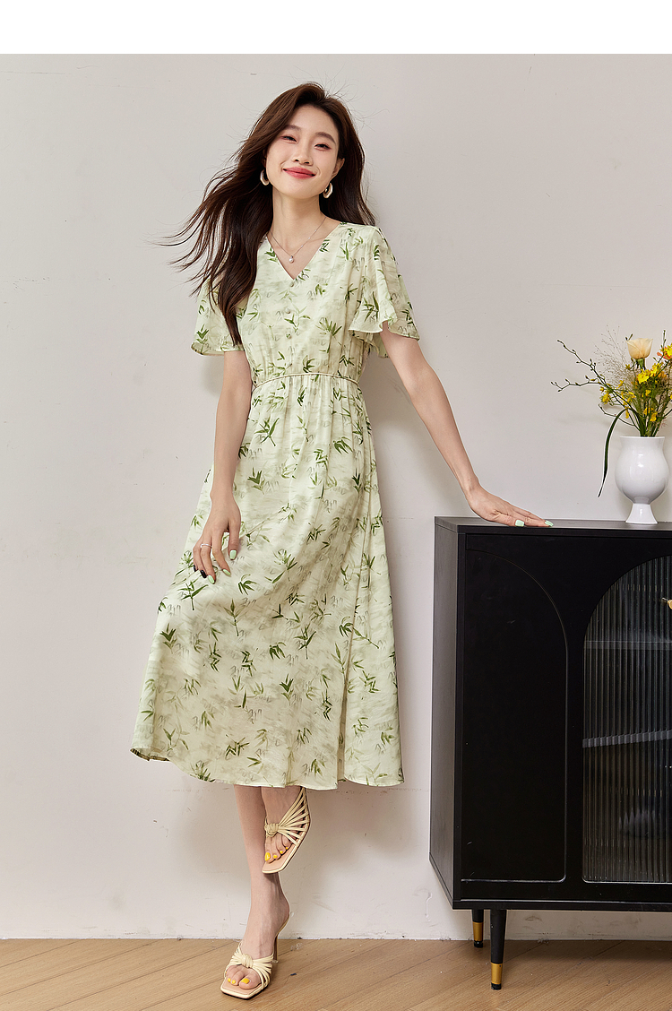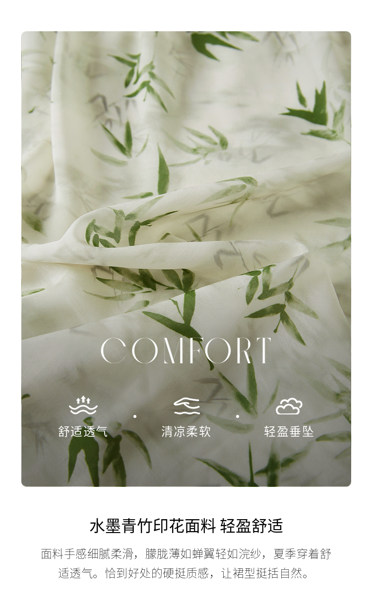 【专属特价】熙世界夏季国风水墨青竹印花连衣裙收腰显瘦荷叶袖V领雪纺裙子