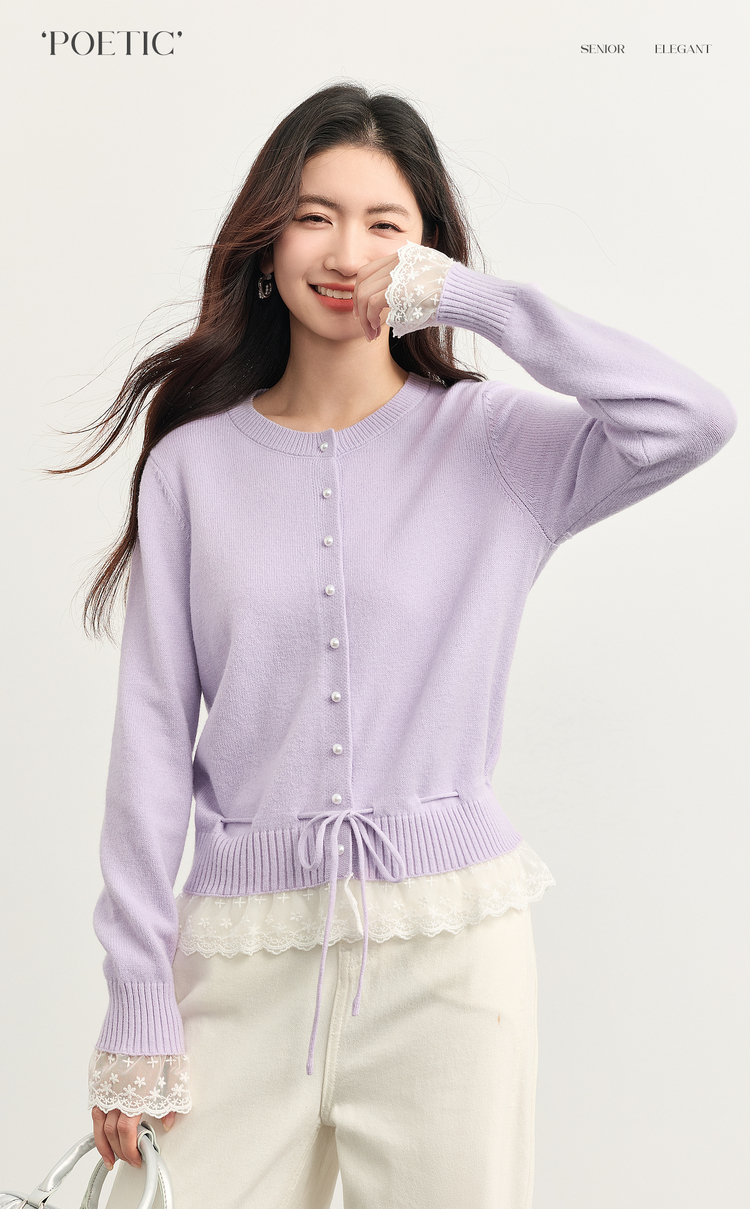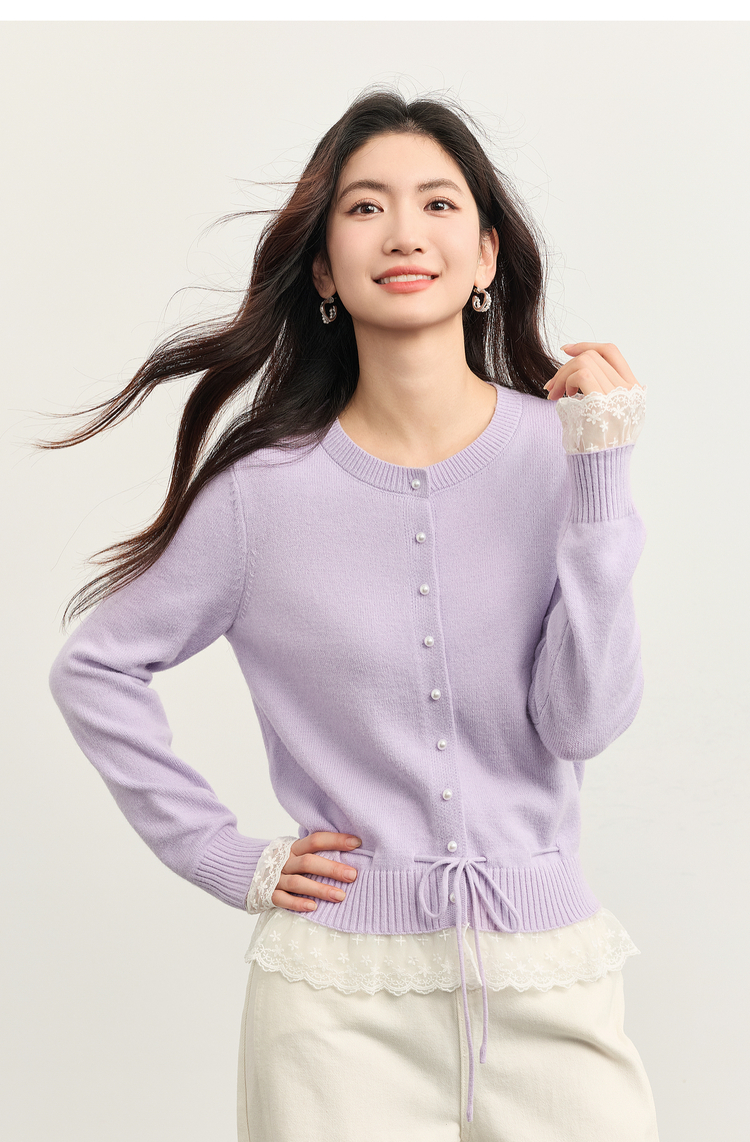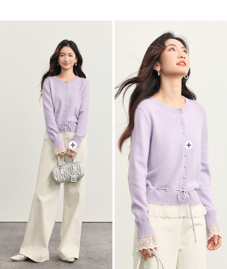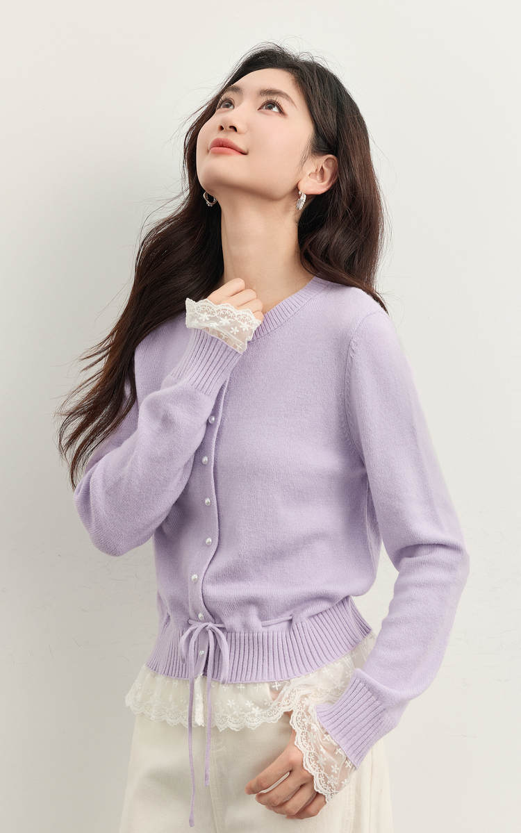 【10/23新品】熙世界超好看的紫色针织衫女长袖2025秋新款蕾丝花边拼接打底毛衣