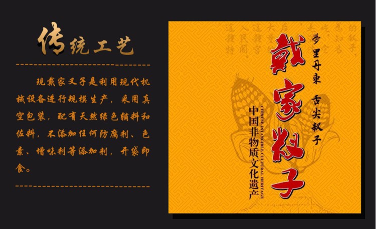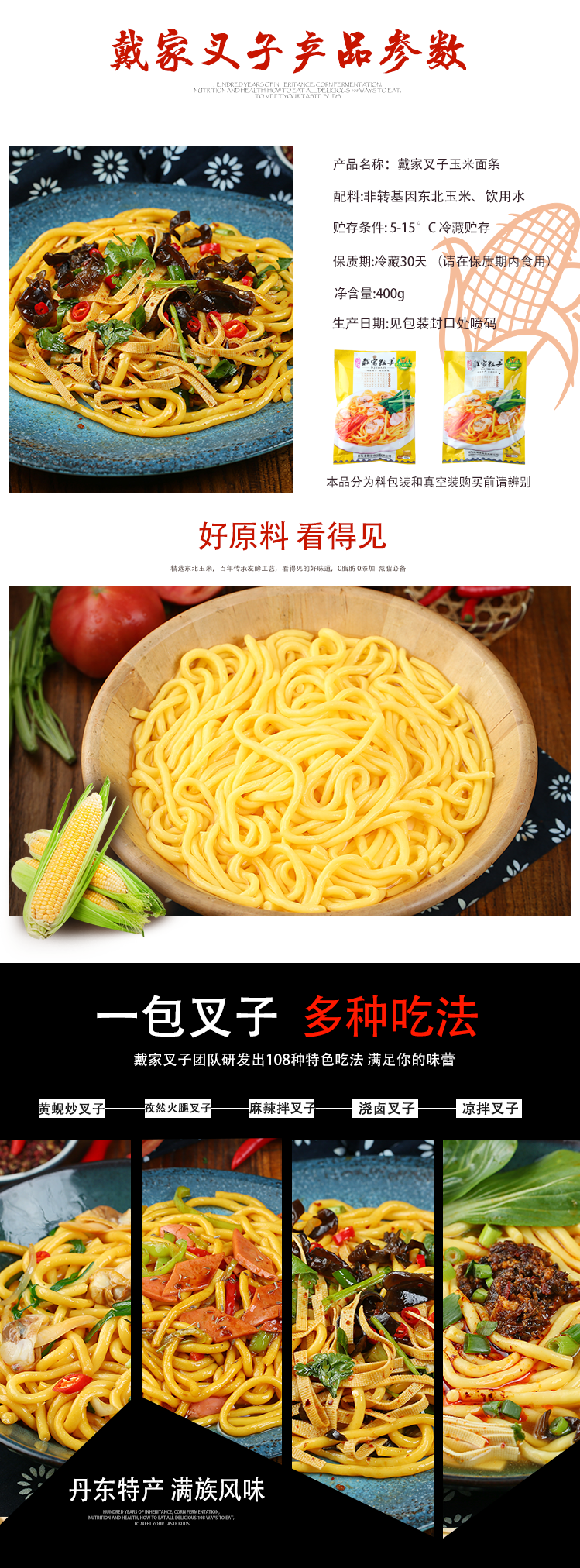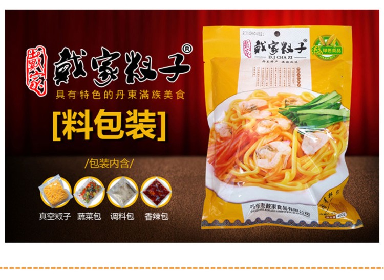 选用东北非转基因玉米,发酵工艺,富含大量乳酸菌,口感爽滑劲道,真正零添加,纯天然绿色食品。作为满族非物质文化遗产,可以汤,炒,炸,浇卤,麻辣拌等多种吃法。2018年2月,戴家(米叉)子再一次被评为2017年度丹东市十大旅游特色商品。2018年4月,戴家(米叉)子品牌,被辽宁省餐饮烹饪行业协会评为辽宁餐饮业最具投资价值餐饮连锁品牌。连续两年《戴家(米叉)子》被评为“辽宁礼物”,