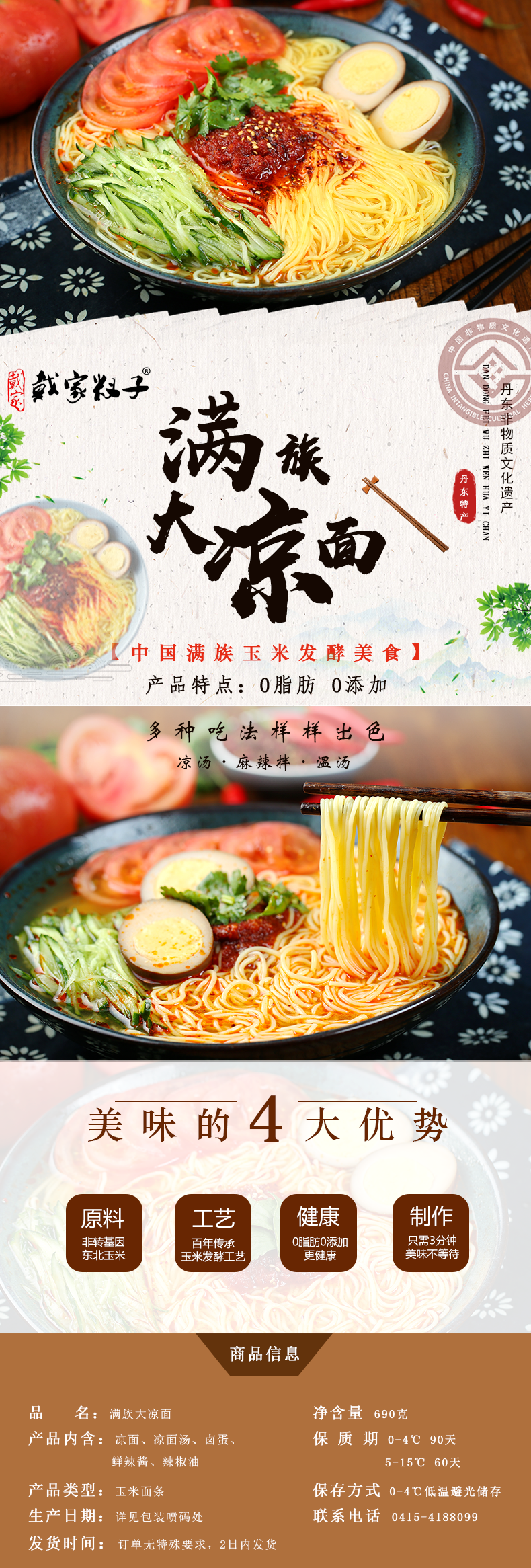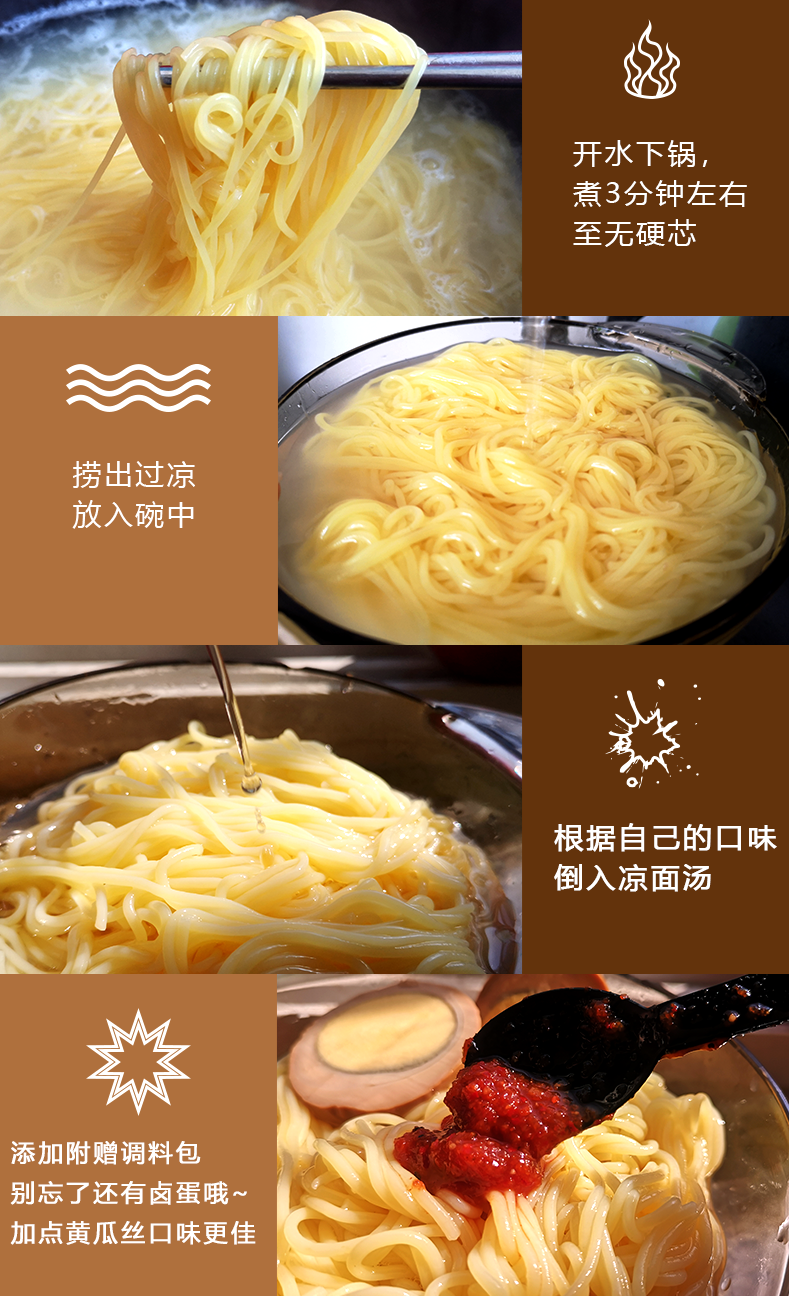 3.满族大凉面:开水下锅,煮三分钟至无硬芯,捞出过凉,放入碗中,添加附赠调料包,加点黄瓜丝口味更佳