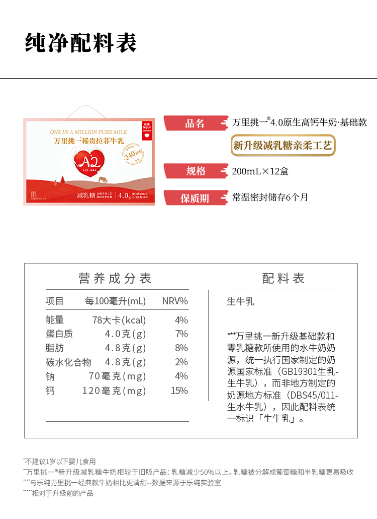 历史最低价『4.0蛋白纯+原生高钙』乐纯万里挑一牛奶 高钙纯牛奶 每盒8.0g蛋白质+240mg钙 减乳糖工艺零乳糖常温纯牛奶