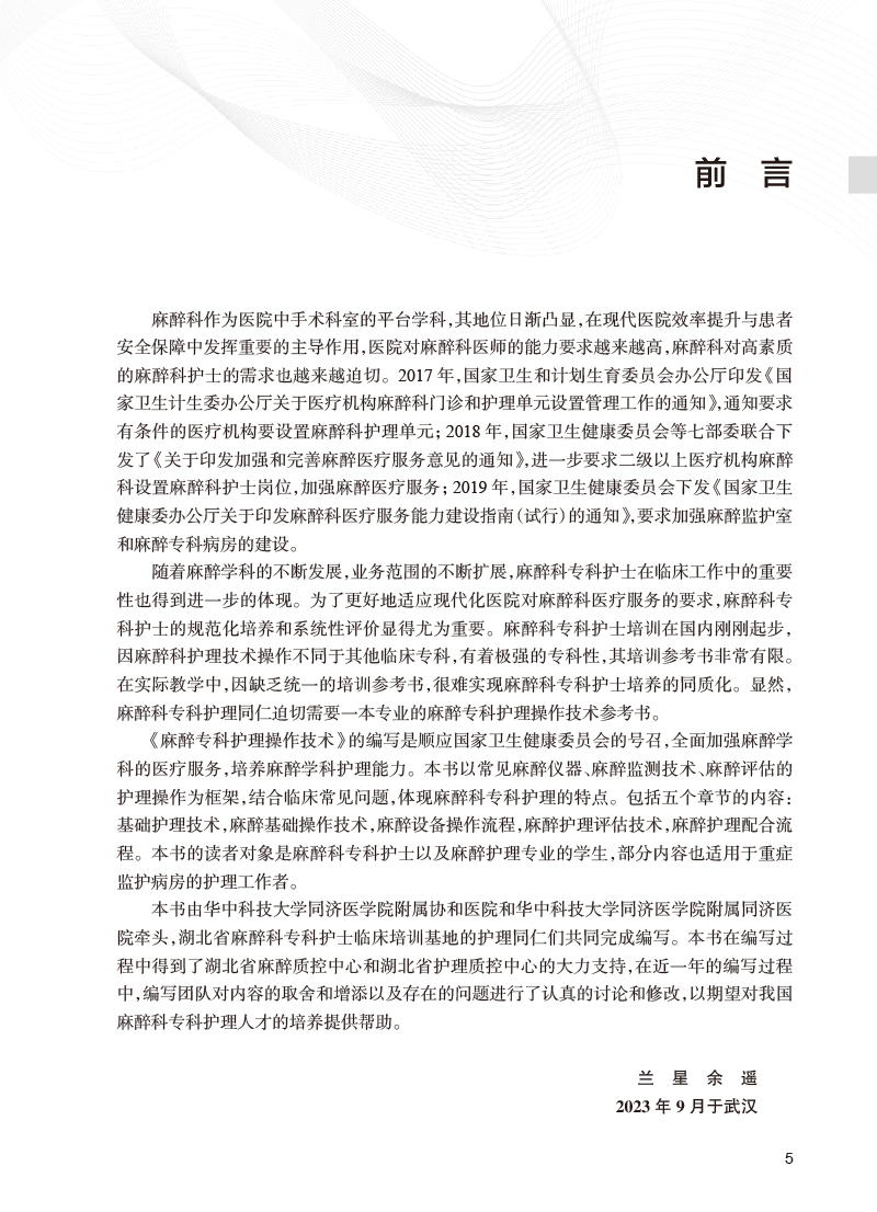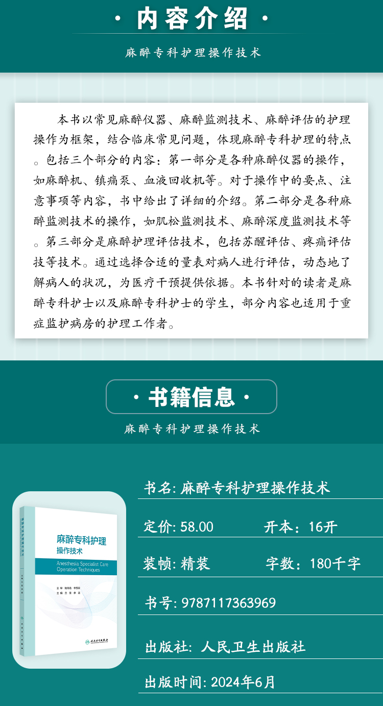 本书以常见麻醉仪器、麻醉监测技术、麻醉评估的护理操作为框架,结合临床常见问题,体现麻醉专科护理的特点。包括三个部分的内容:第一部分是各种麻醉仪器的操作,如麻醉机、镇痛泵、血液回收机等。对于操作中的要点、注意事项等内容,书中给出了详细的介绍。书中给出的操作并不是唯一的,但代表了多数常规操作的标准方法。大部分内容需要在一定的麻醉护理工作基础上才能掌握。第二部分是各种麻醉监测技术的操作,如肌松监测技术、麻醉深度监测技术等。监测是麻醉护理日常工作的重要内容,通过操作前的准备,操作的步骤,操作中的注意事项等内容来介绍,帮助掌握正常的监测方法,获取有效地监测数据。第三部分是麻醉护理评估技术,包括苏醒评估、疼痛评估技等技术。通过选择合适的量表对病人进行评估,动态地了解病人的状况,为医疗干预提供依据。本书针对的读者是麻醉专科护士以及麻醉专科护士的学生,部分内容也适用于重症监护病房的护理工作者。