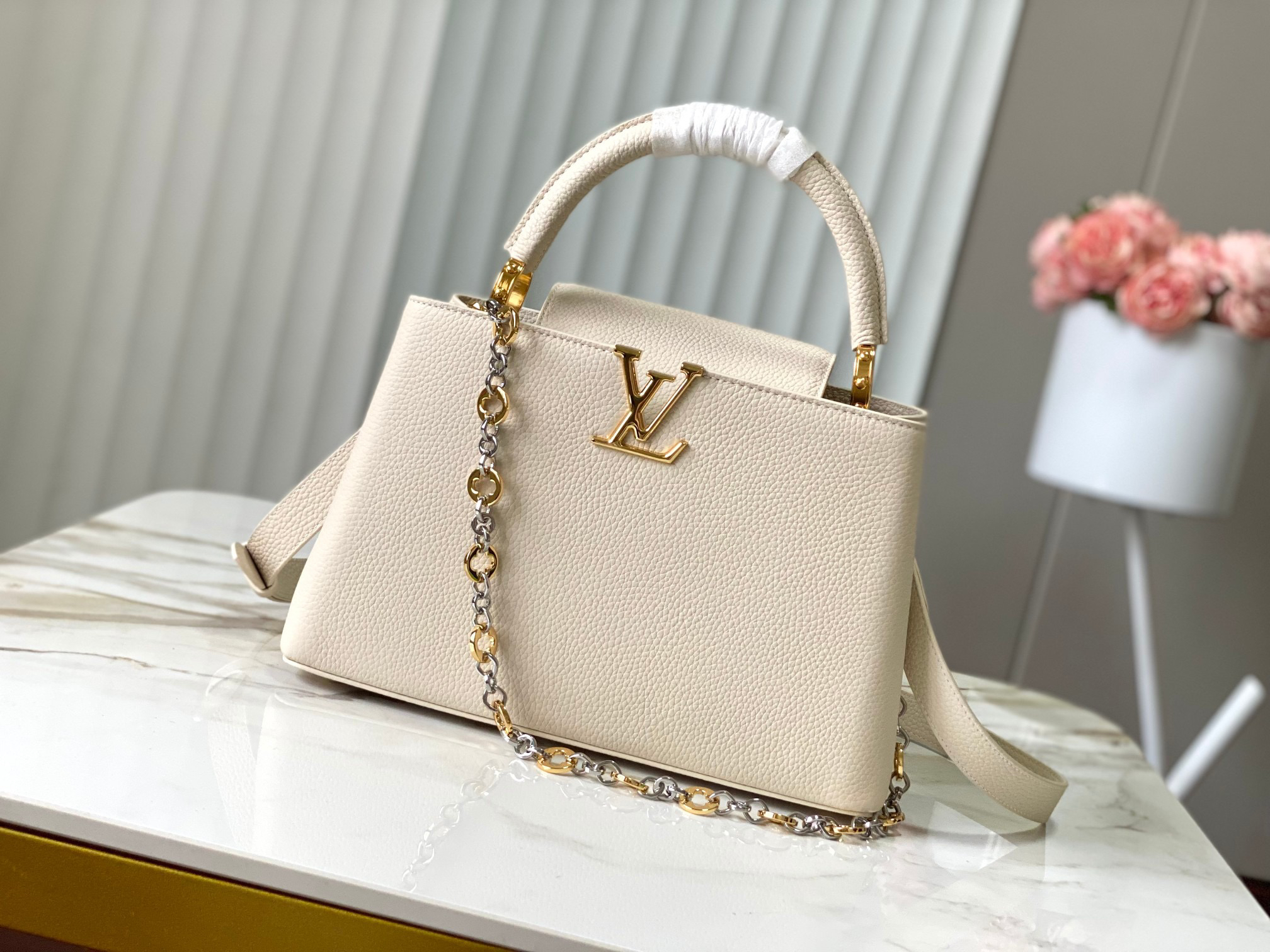 秋冬特惠💰1850 渠道级LV 新品 te级LV 动态芯片 M12938/M48865奶白圆花环扣款 本款Capucines 手袋取材柔韧Taurillon 牛皮革 以珠宝风格双镀链条和 Monogram花卉元素点明Chain On You系列身份 翻盖可置于内外两侧 充裕构型和多重内袋方便收纳日常所需 圆润LV字母再添匠心细节 Size: 31.5 * 20 * 11 cm