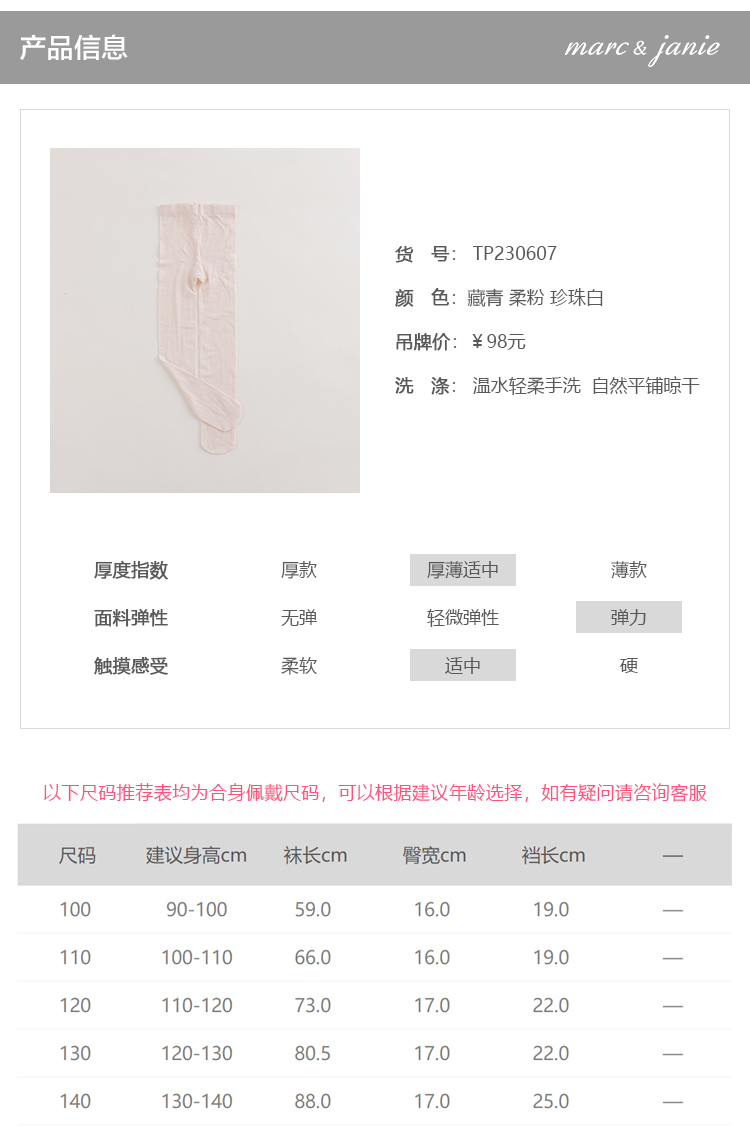 【马克珍妮 芦芙】女童舒适弹力打底袜儿童袜子春秋款童装230607