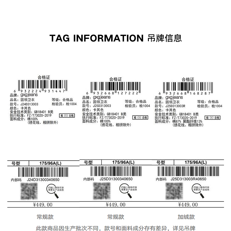 gxg.jeans男装春秋季热卖多色加绒圆领卫衣J24D313003