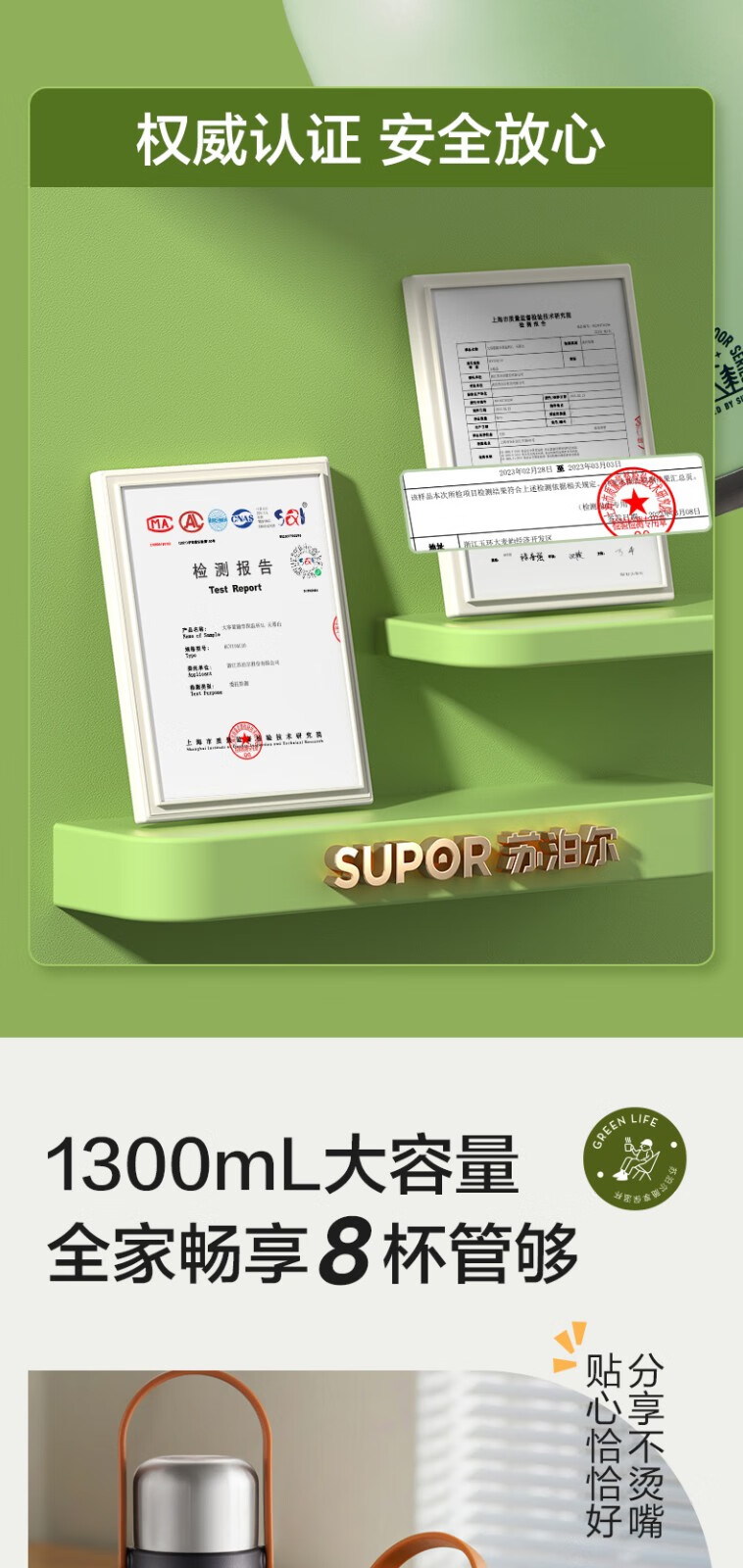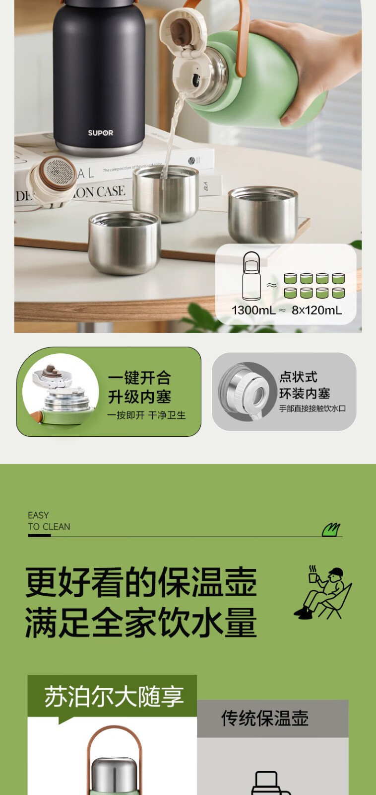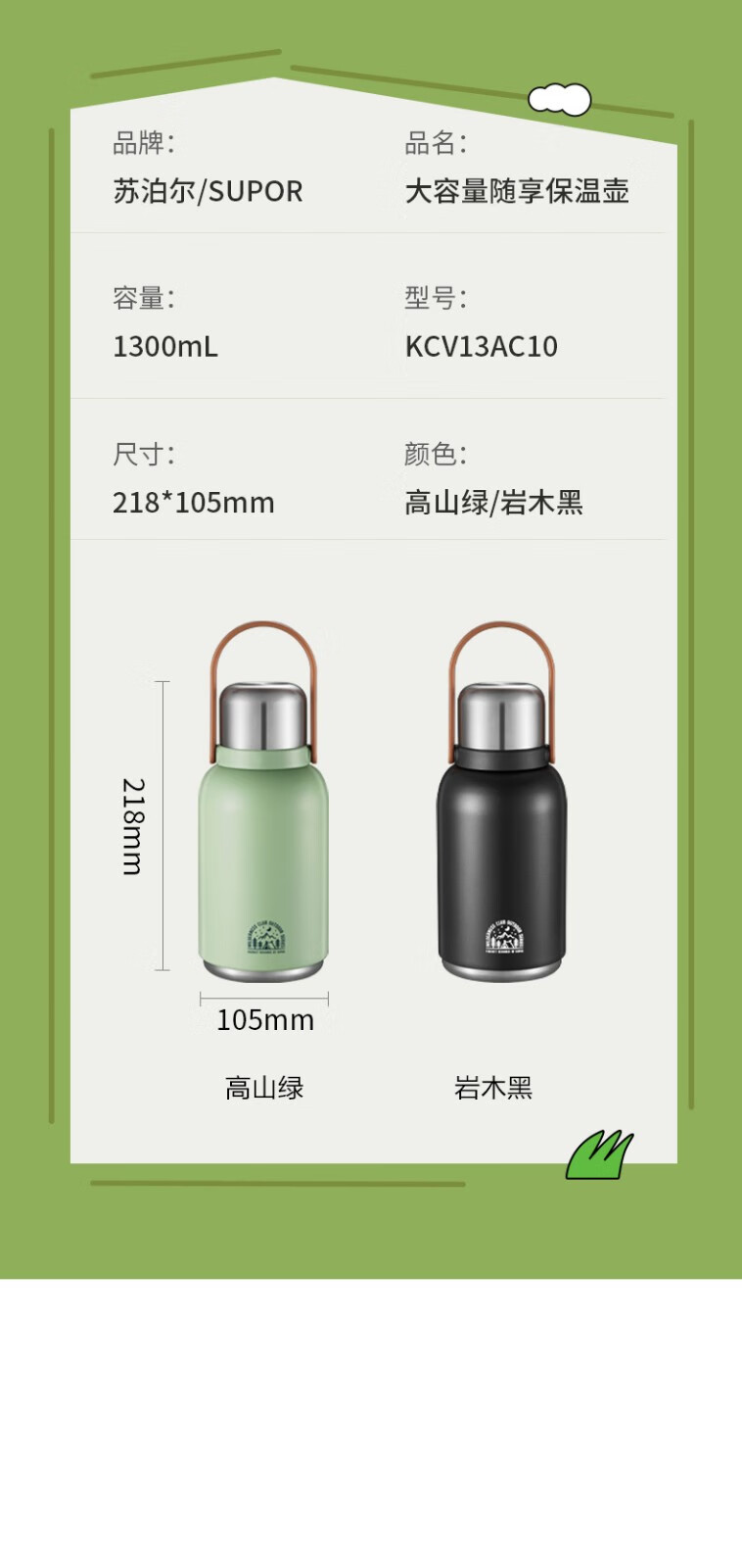 苏泊尔(SUPOR)保温壶316L不锈钢保温水壶家用大容量暖壶KCV13AC10岩木黑1.3L